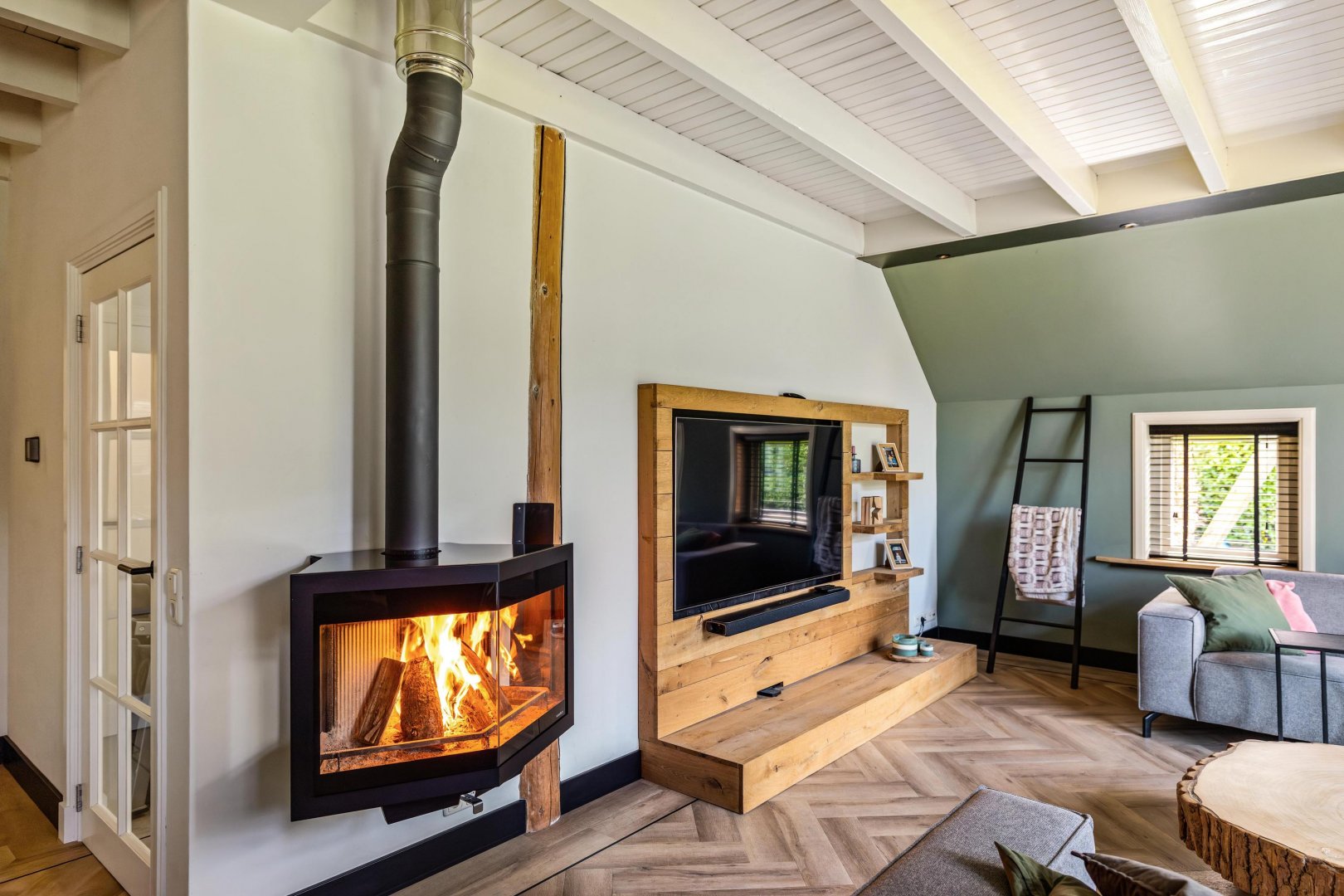 De aangrenzende living is knus en charmant en er is een sfeer verhogende houthaard aanwezig.