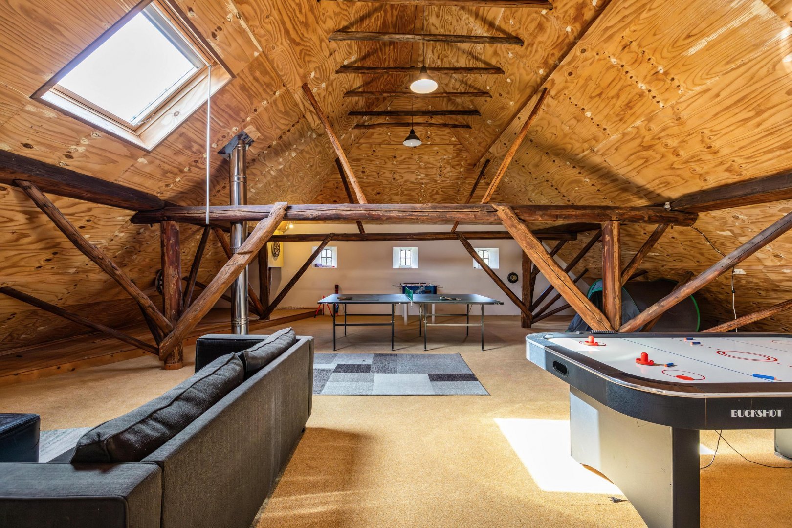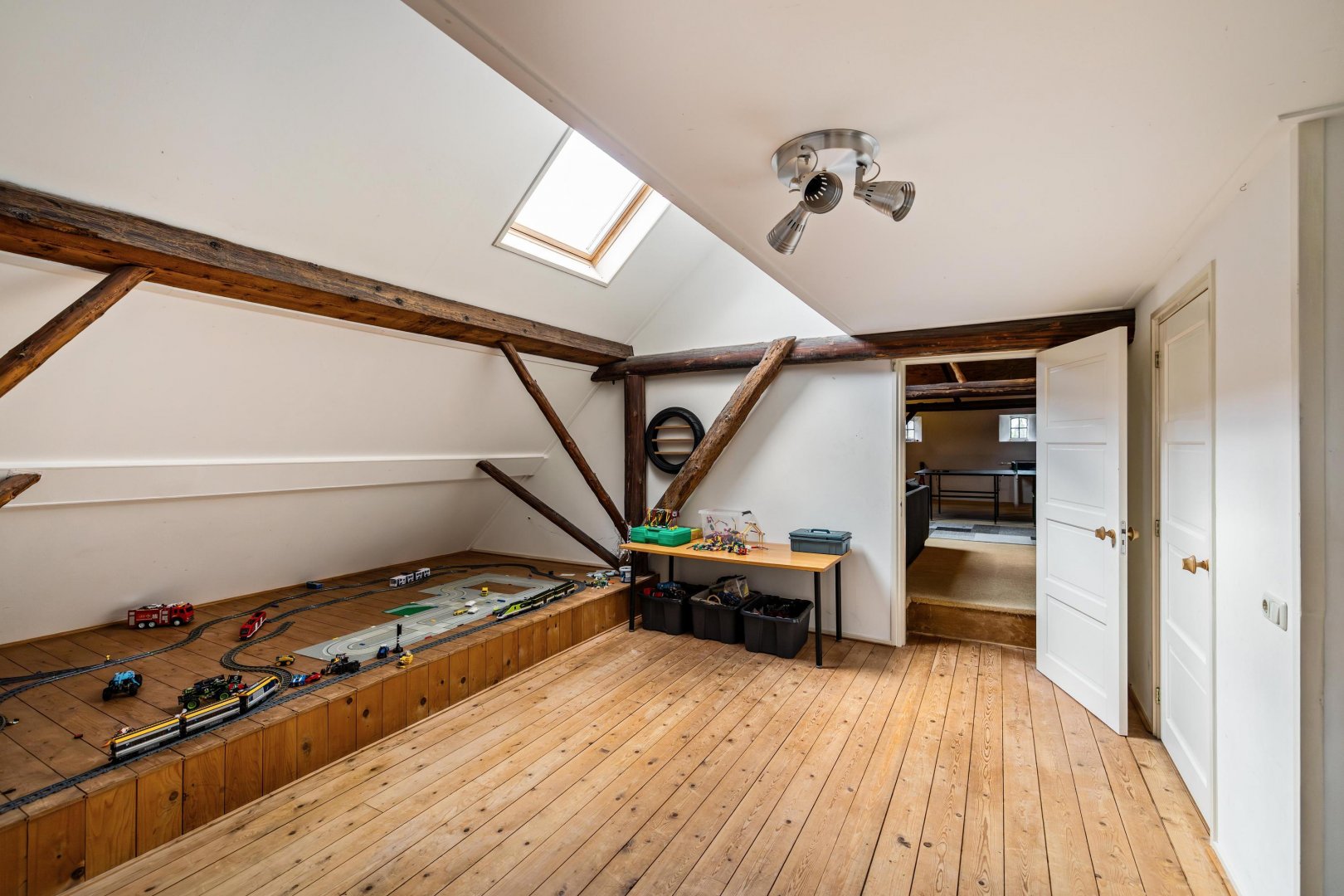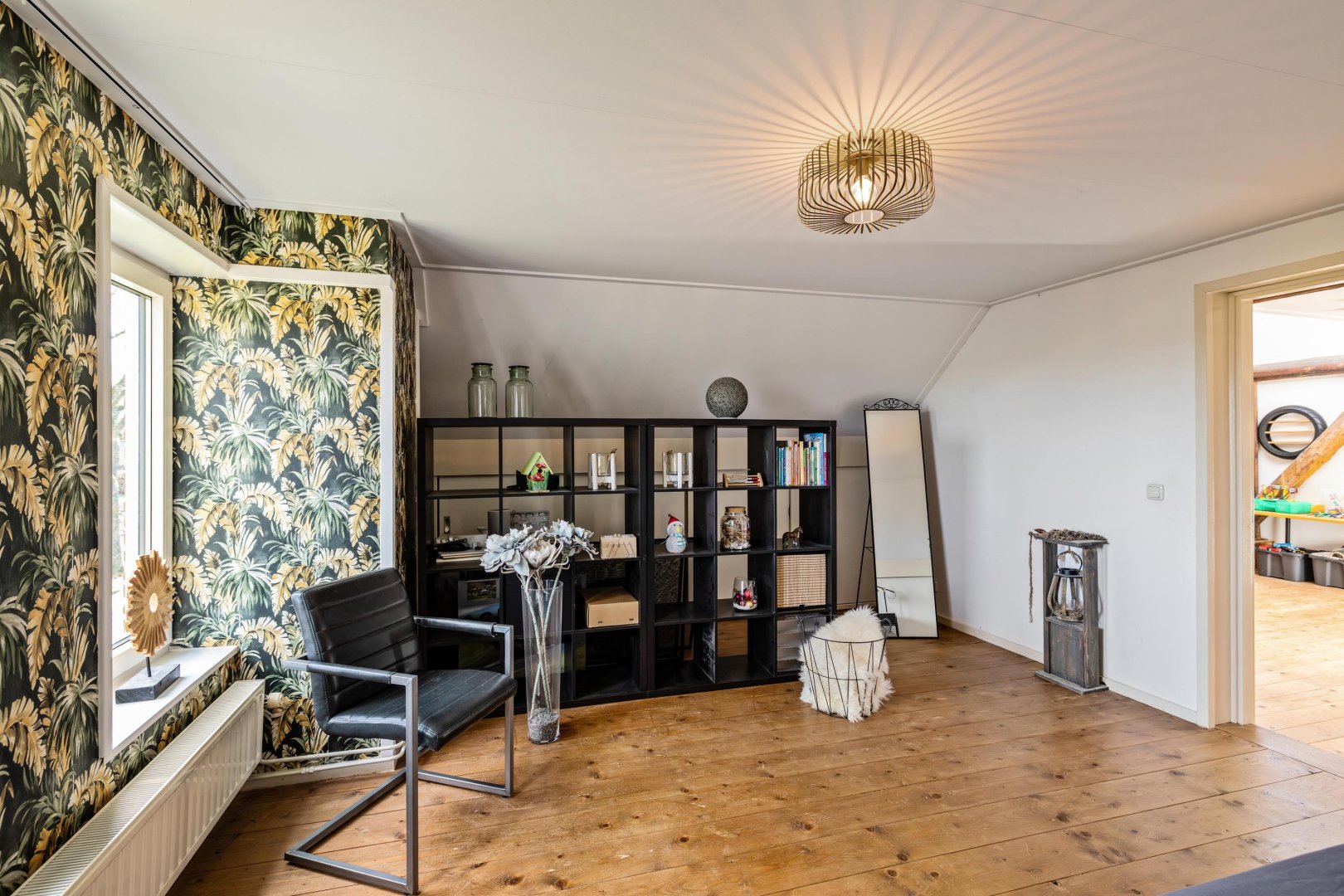 De eerste etage is riant. Hier bevindt zich aan de voorzijde van de boerderij een gezellige slaapkamer en aan de achterzijde een grote multifunctionele ruimte. Een geweldige ruimte om film te kijken of om als tiener je heerlijk terug te trekken met je vrienden.