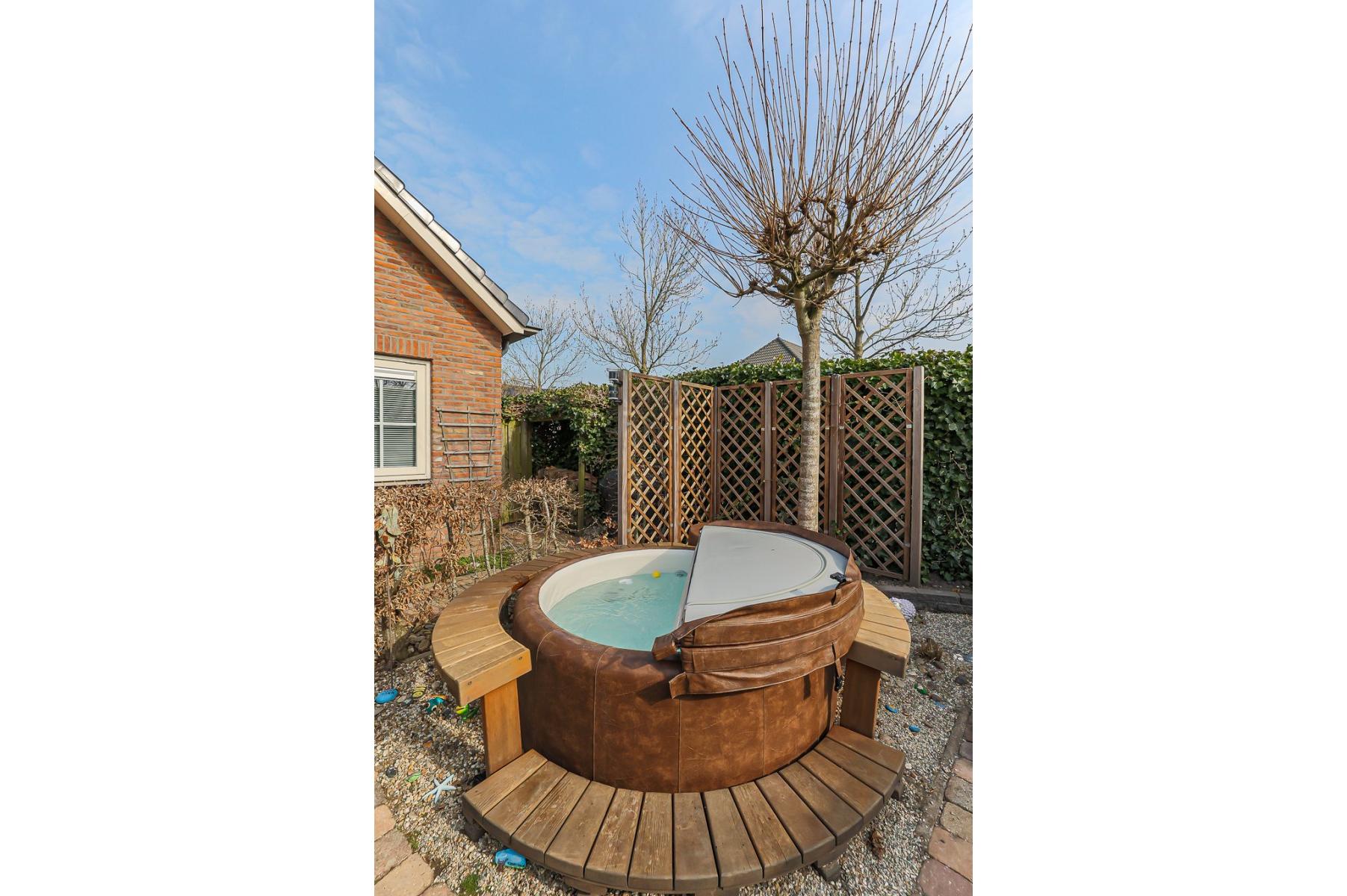 De tuin is op het zuid – westen gelegen en heeft een gezellig besloten terras, houten berging – met overkapping en een vlonder aan de waterzijde. Doordat het huis op een hoek is gelegen is er een achterom aanwezig.