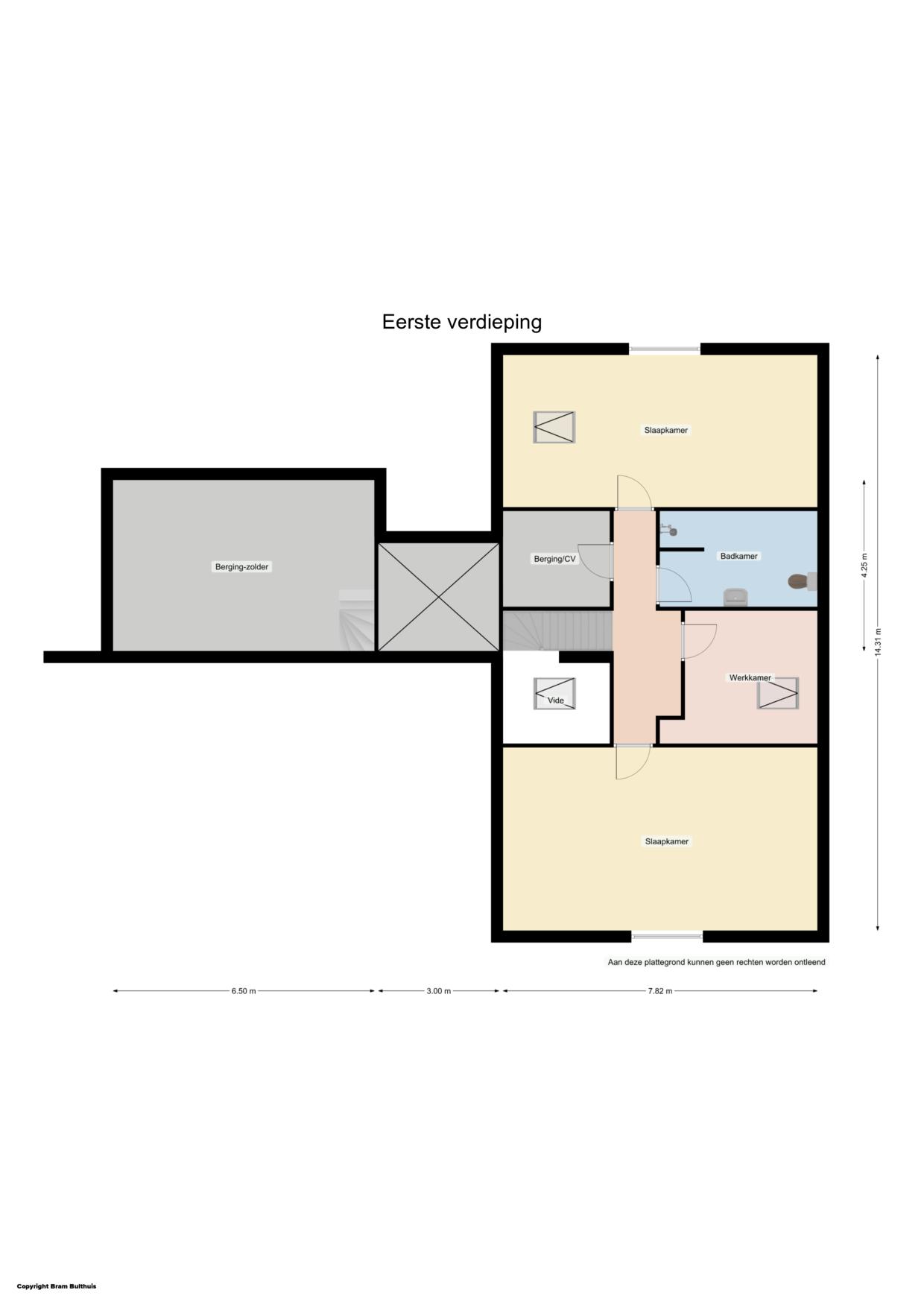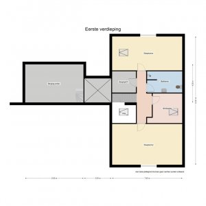 Overloop – vide, op zowel de voor als achterzijde zijn zeer riante slaapkamers van 22 en 16 m2, de ruimtelijkheid wordt hier versterkt doordat de hoge kap zichtbaar is gebleven bij het ontwerp en door het prachtige zicht op de weilanden. Op de overloop is nog een werkkamer van 6 m2, tweede badkamer met douche, toilet en wastafel. Daarnaast is nog een bergruimte met daarin de HR-ketel en de warmte terugwin unit (wtw).
