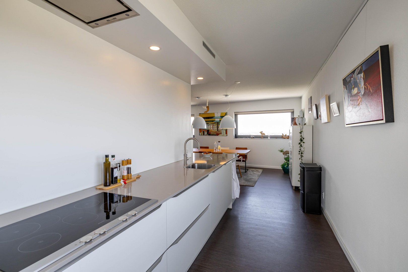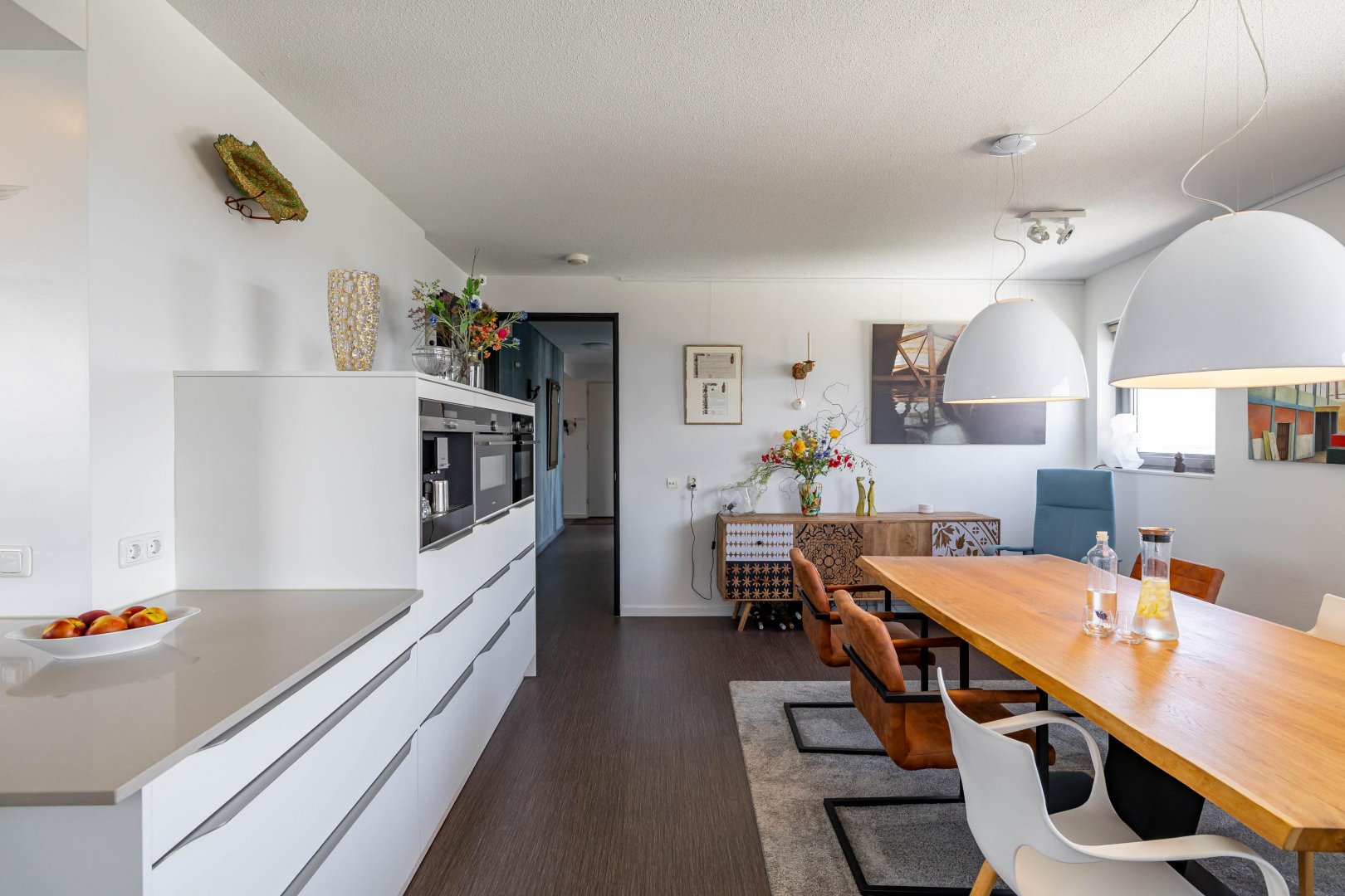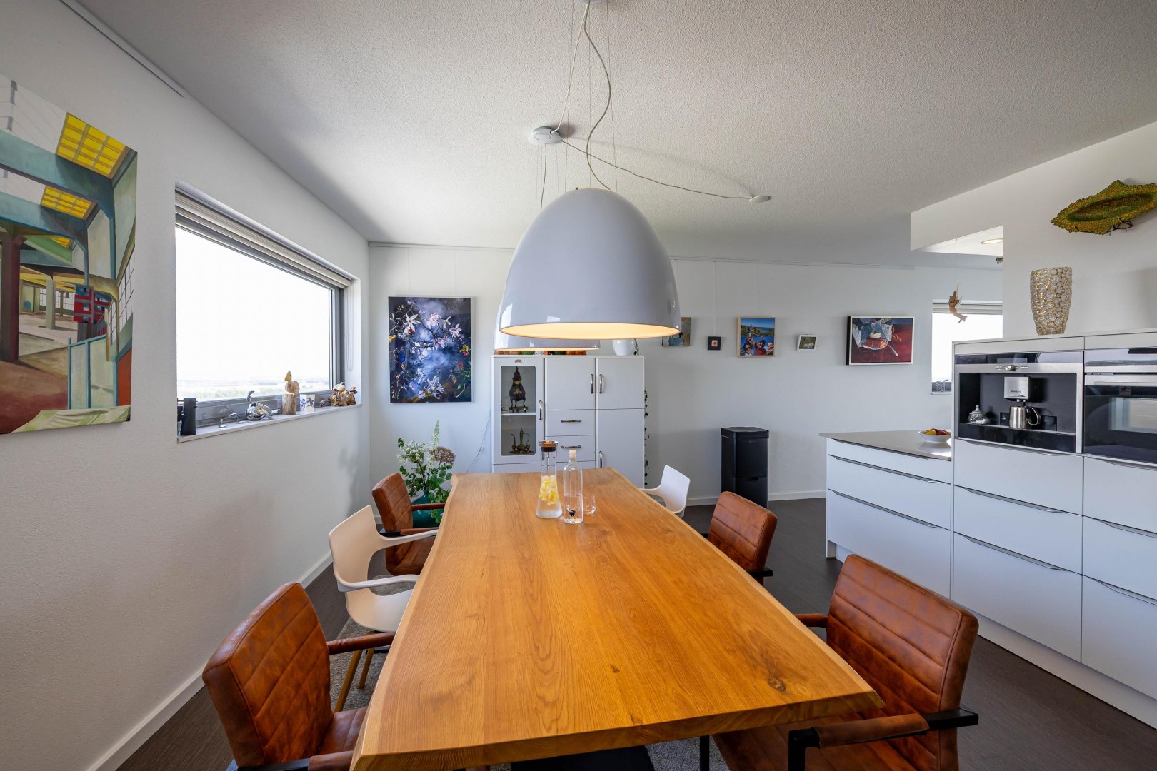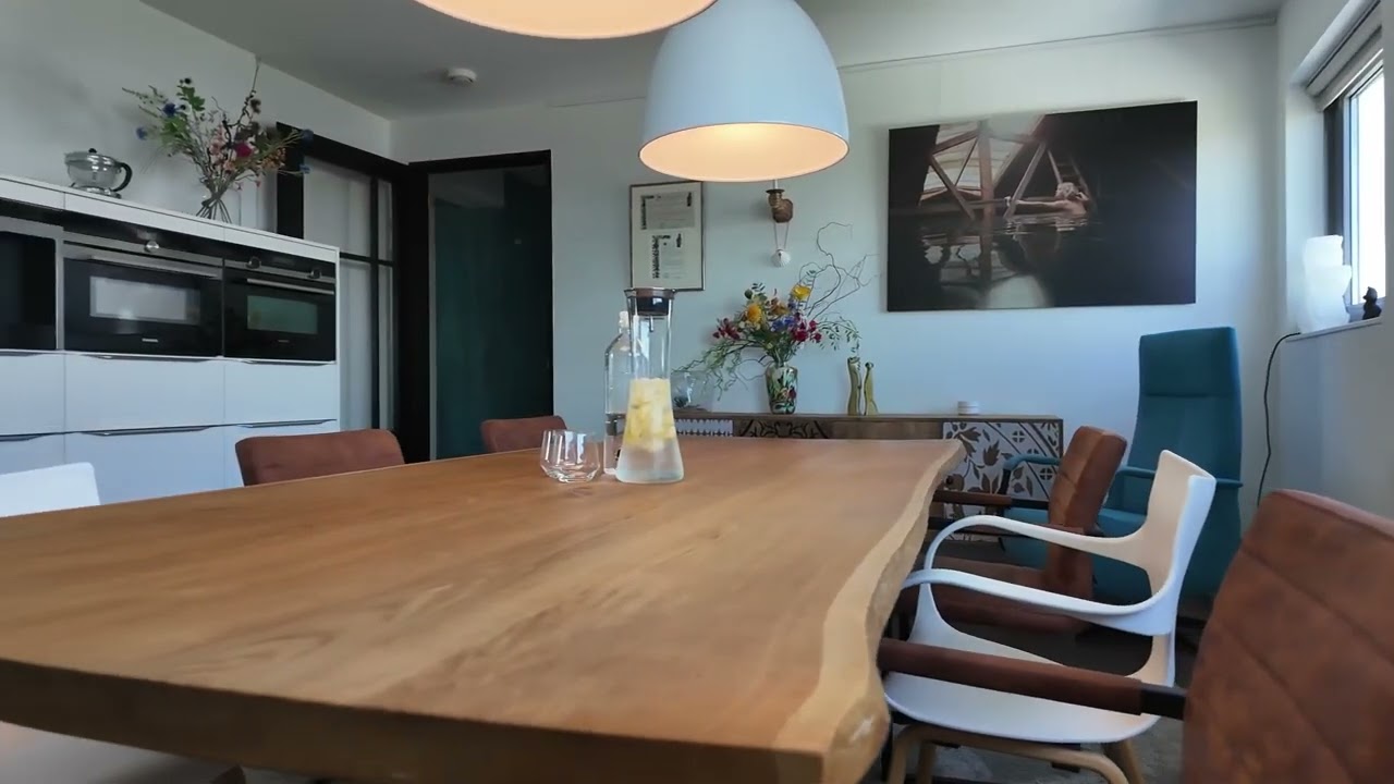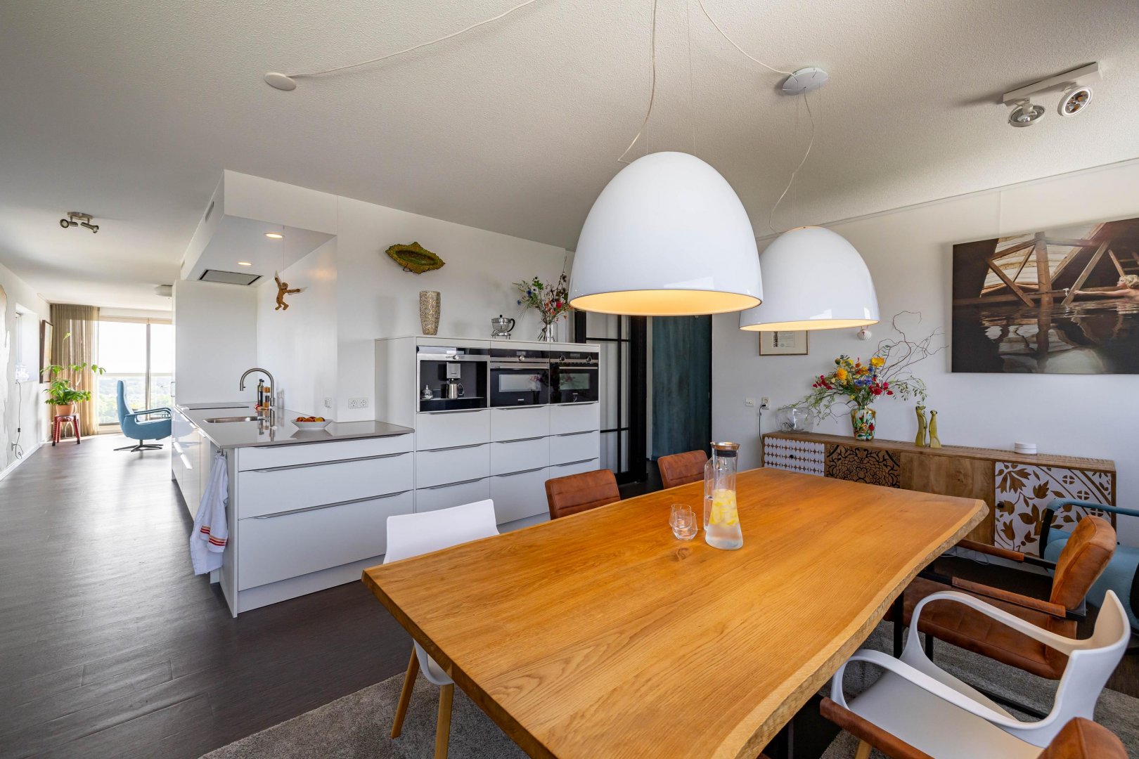Achter de voordeur treft u een zeer ruim en licht appartement met een speelse indeling. De hoekligging biedt vanuit de eetkamer, keuken, woonkamer, slaapkamers en het terras een prachtig, levendig en gevarieerd uitzicht. Het woonoppervlak van 158 m2 is verdeeld over ruime living, luxe moderne keuken voorzien van alle denkbare inbouwapparatuur en eetkamer, drie slaapkamers/werkkamers, hal, separaat toilet, badkamer met modern sanitair en tot slot een ruime bijkeuken/berging. Zowel vanuit de living als vanuit de twee slaapkamers/werkkamers aan de zuidzijde stapt u het zonnige terras op. De master bedroom is gelegen aan de noordzijde (natuurlijk koel) en heeft veel ruimte voor kasten.