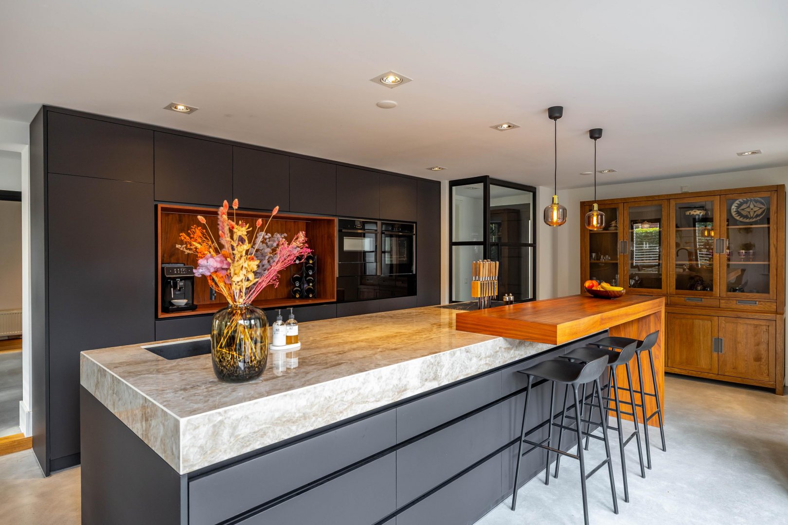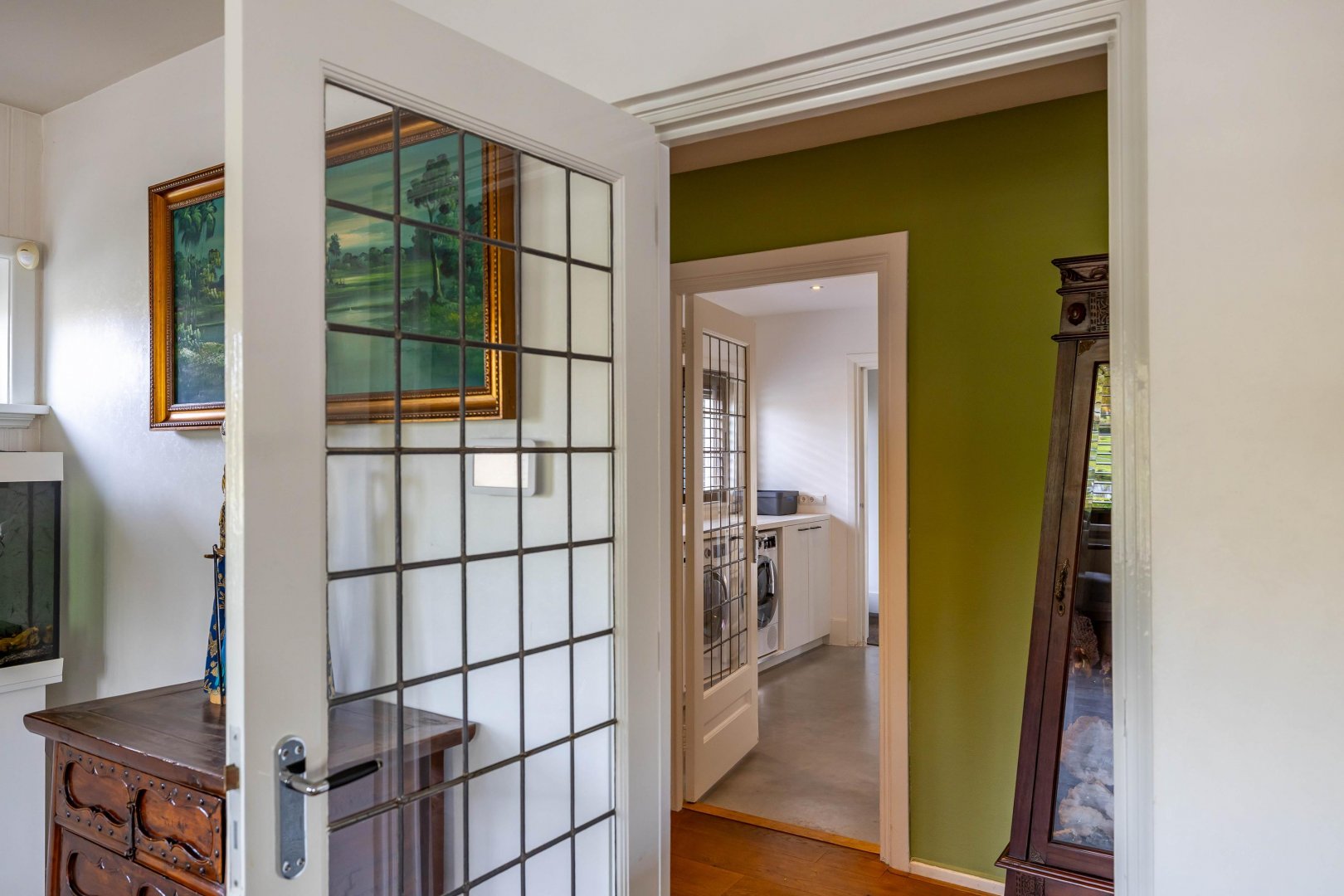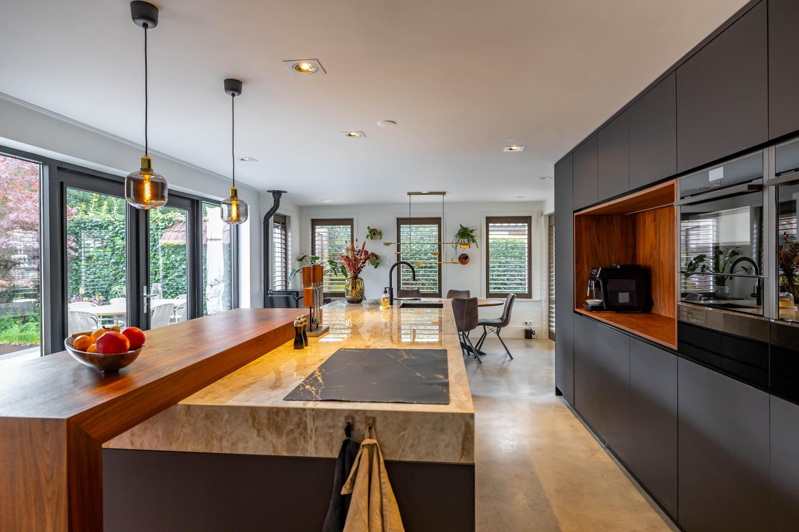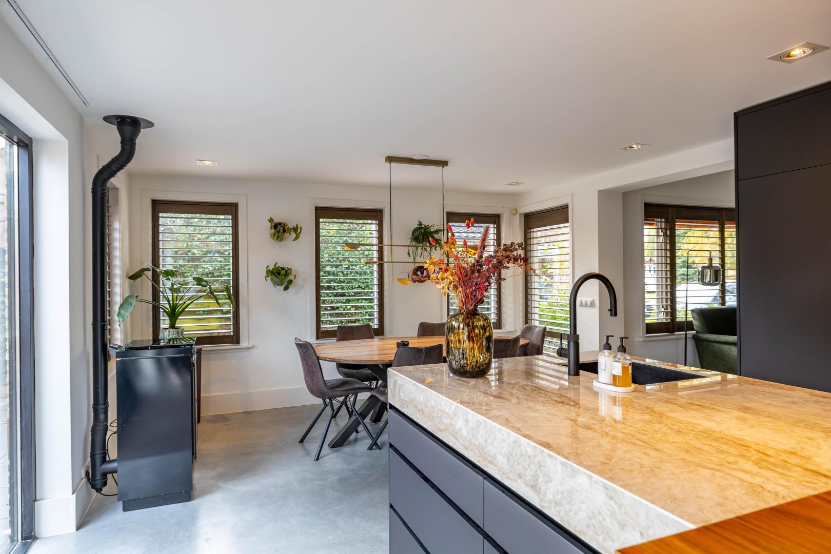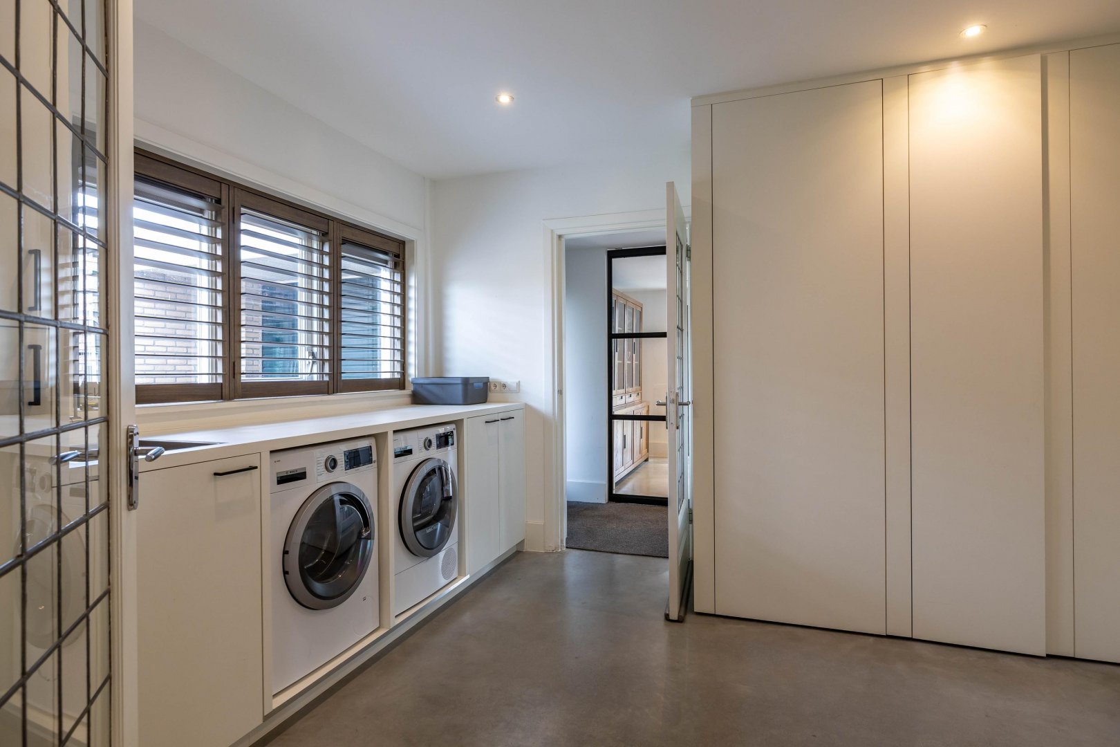 Bij binnenkomst via de entree/hal met stijlvolle trapopgang bereikt u het toilet, de 32 m² ruime woonkamer met gashaard en prachtig parkzicht, de bijkeuken met toegang tot de provisiekelder en voorzien van aansluitingen voor wasmachine en droger, cv-installatie. De woonkeuken is voorzien van een imposant werkeiland en uitgerust met hoogwaardige inbouwapparatuur, een pelletkachel en openslaande deuren naar de achtertuin. Via de zijkant van de woning is een tweede zit/tv kamer toegankelijk. Vanuit de achterhal is de voormalige garage bereikbaar; deze is getransformeerd tot een tuingerichte slaap/werkkamer van circa 20 m² met openslaande deuren en een berging aan de voorzijde met garagedeur. Desgewenst eenvoudig weer terug te brengen naar een garage-functie. Het achterhuis is voorzien van vloerverwarming.