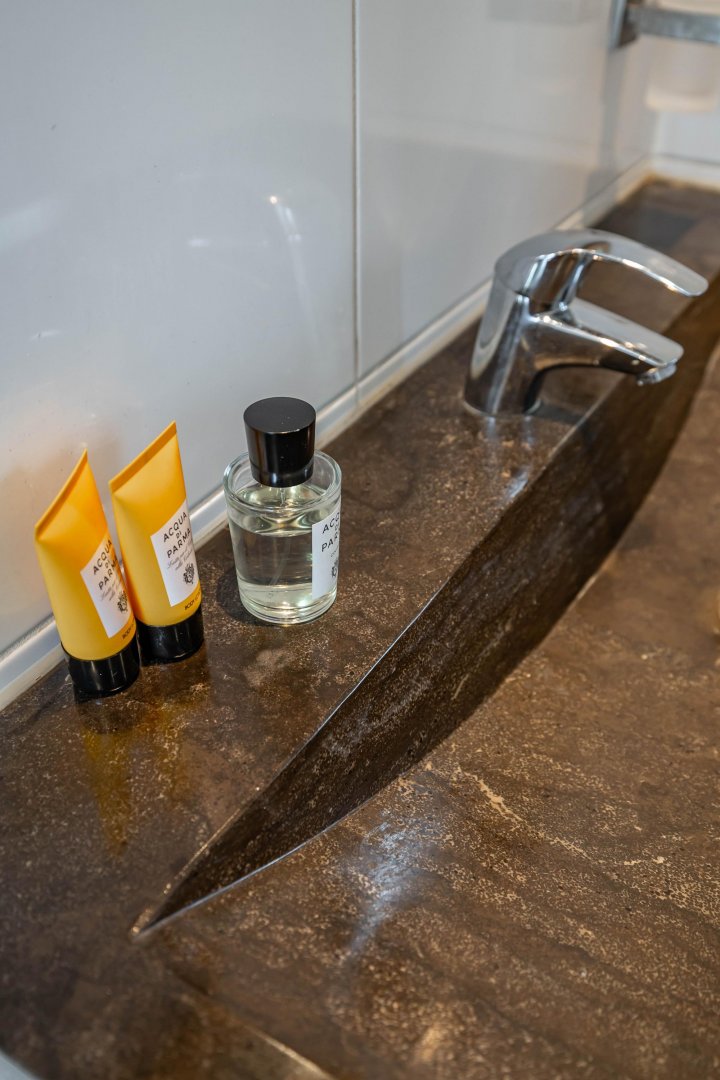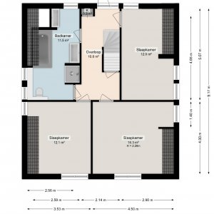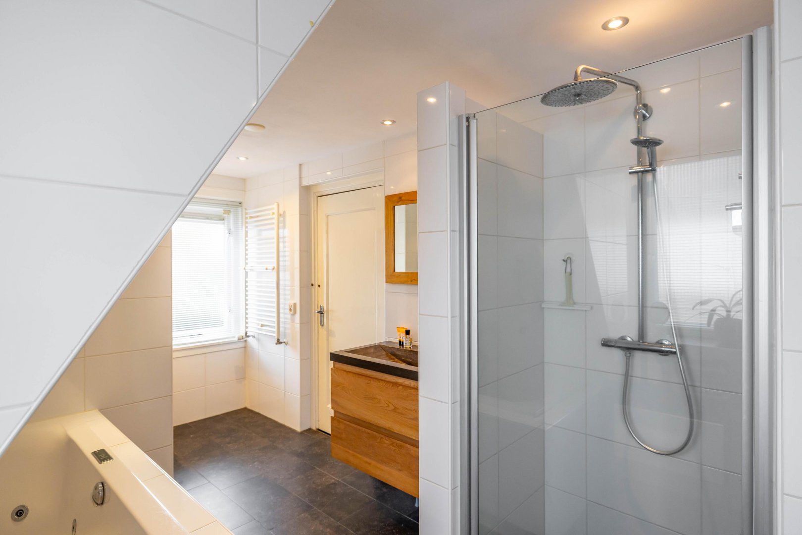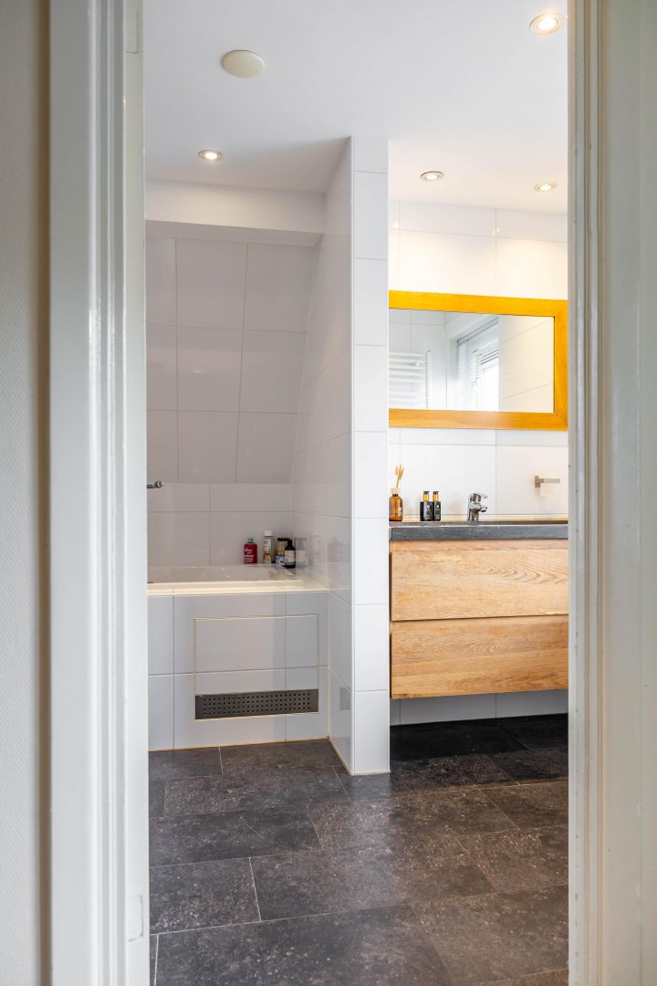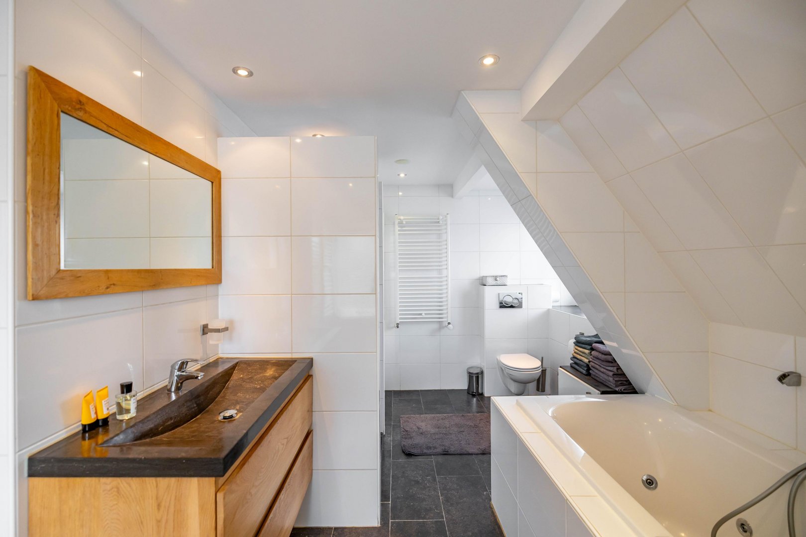 Overloop, drie goed bemeten slaapkamers en een luxe badkamer met ligbad, inloopdouche, tweede toilet en dubbele hardstenen wastafel.