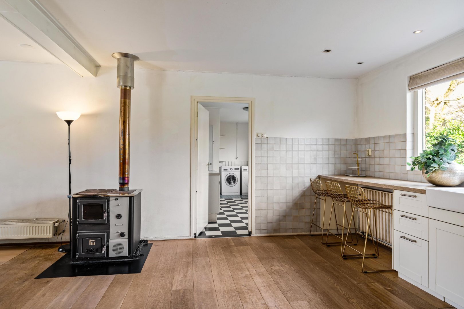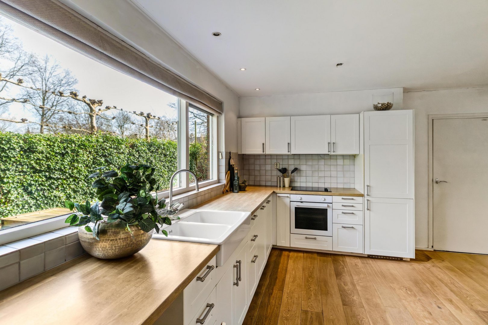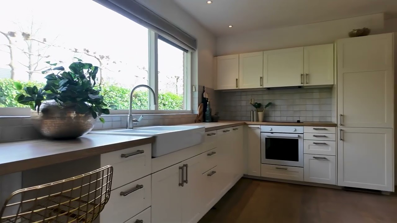 De keuken is voorzien van diverse inbouwapparatuur. Aansluitend bevindt zich de praktische bijkeuken met wasmachineaansluiting, toegang tot de tuin en directe doorgang naar de inpandige dubbele garage met zolderberging.