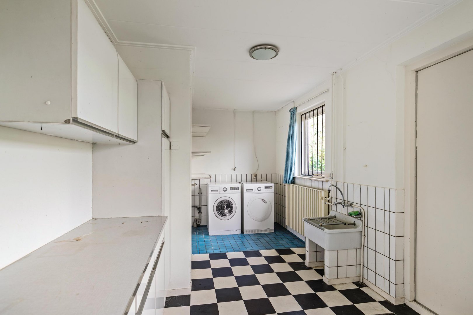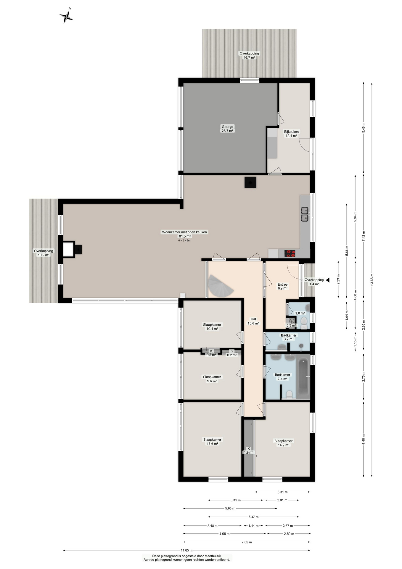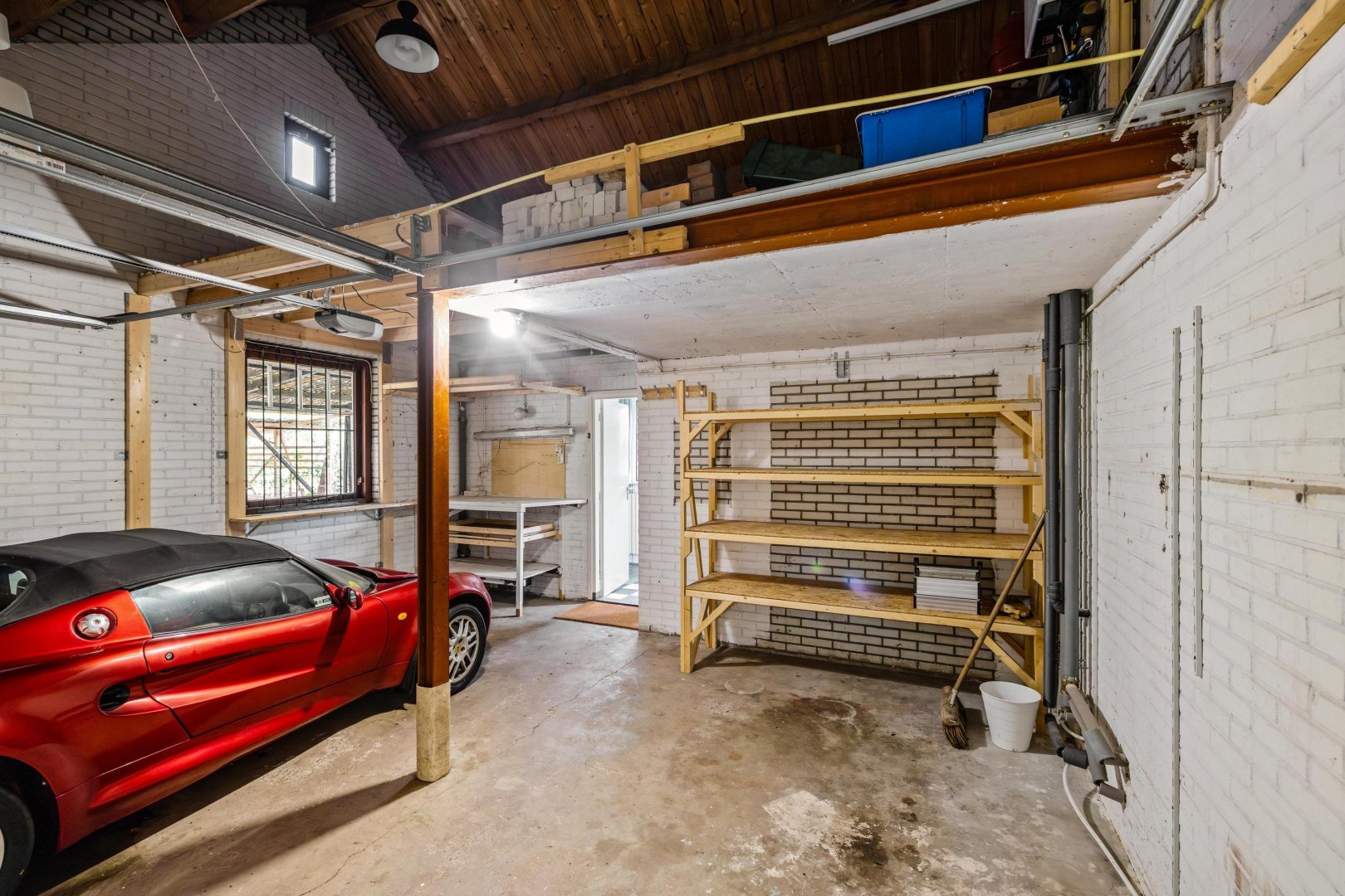 De keuken is voorzien van diverse inbouwapparatuur. Aansluitend bevindt zich de praktische bijkeuken met wasmachineaansluiting, toegang tot de tuin en directe doorgang naar de inpandige dubbele garage met zolderberging.