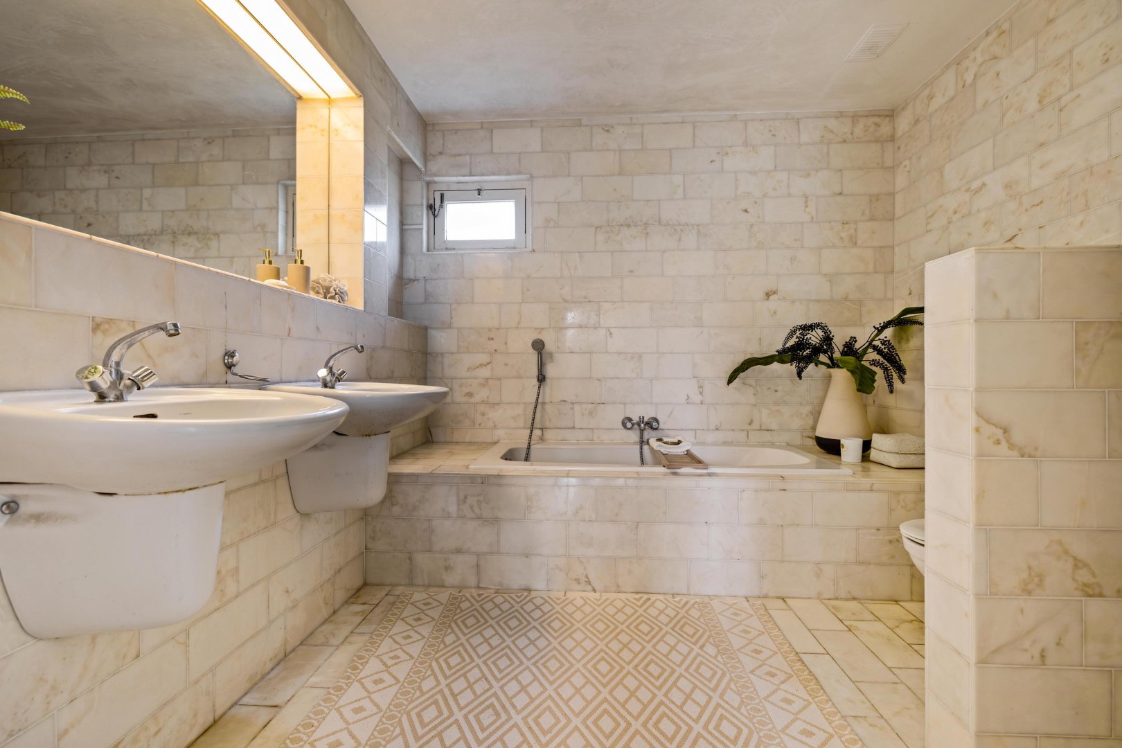 De badkamer is compleet uitgevoerd met ligbad, douche, toilet en dubbele wastafel. Daarnaast is er een tweede badkamer met douche en wastafel.