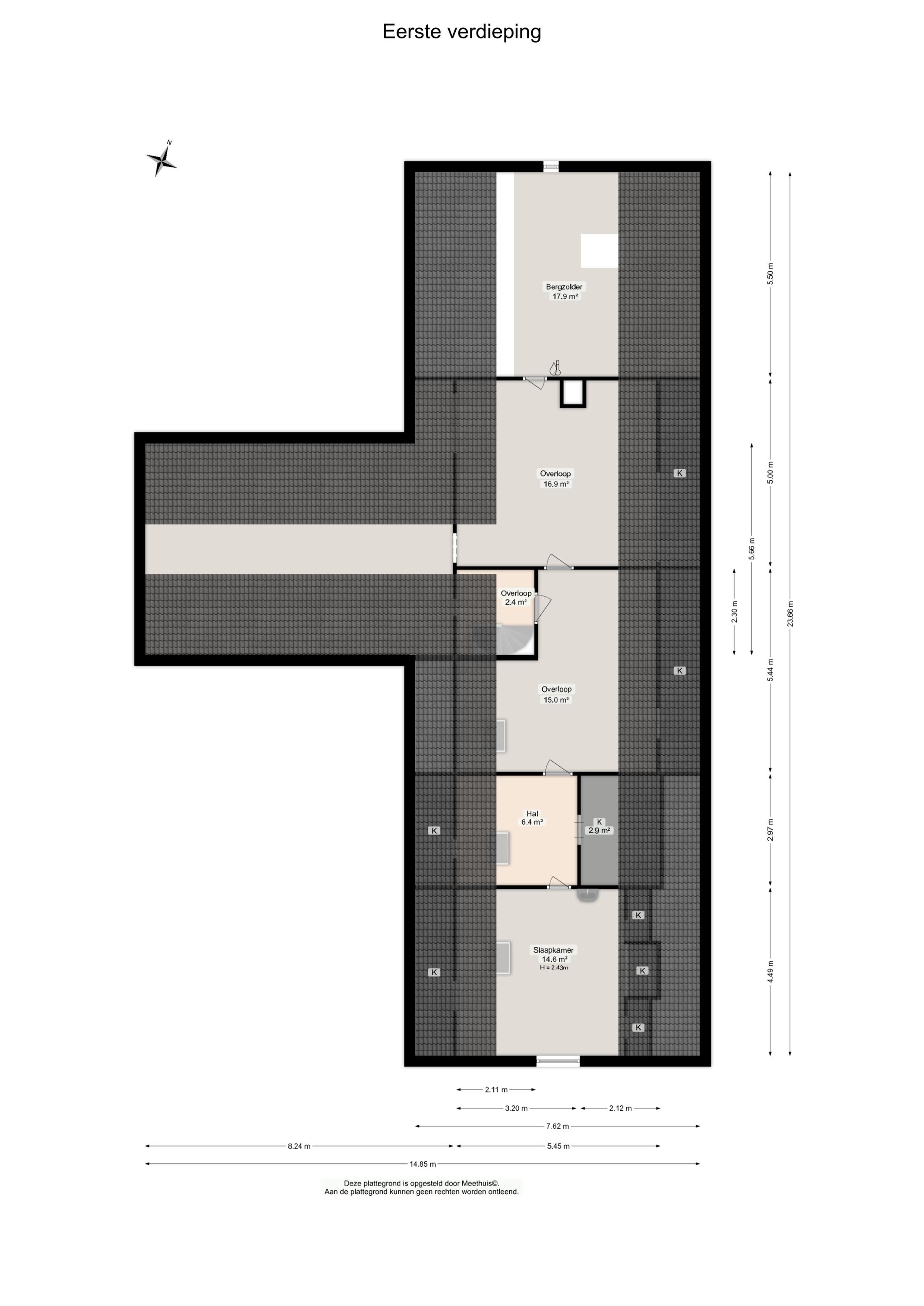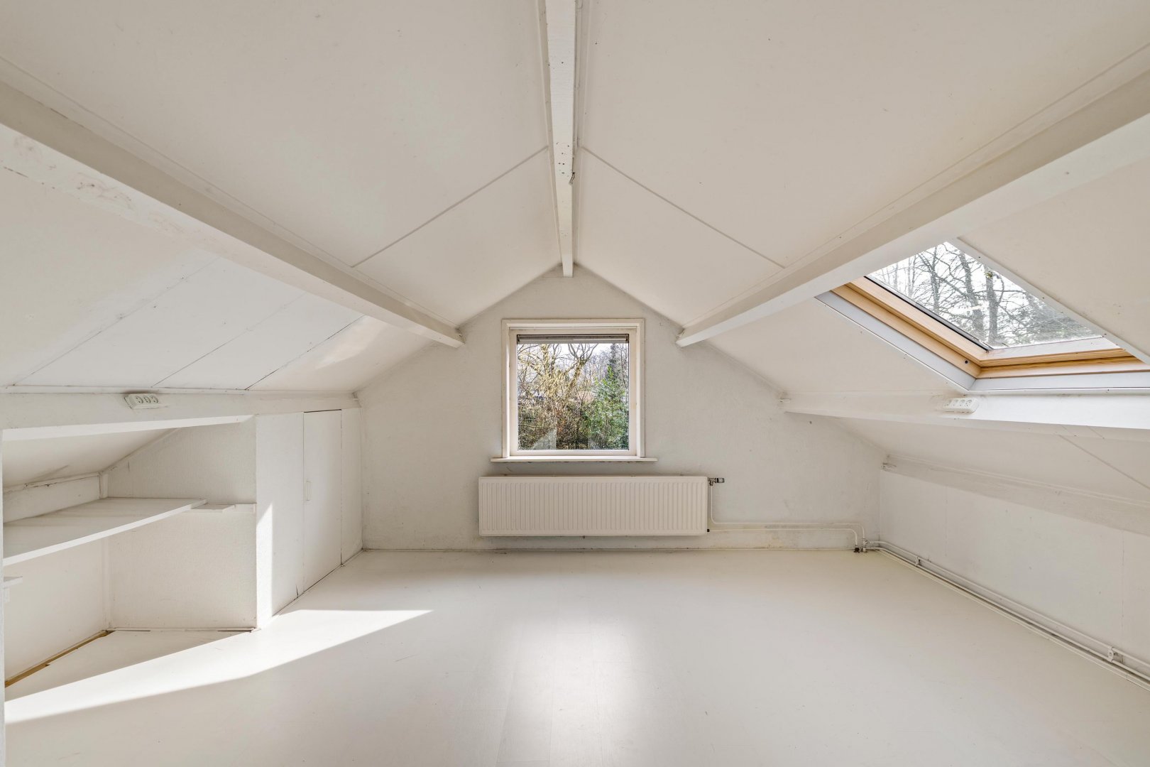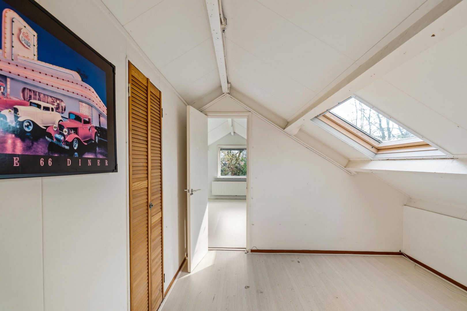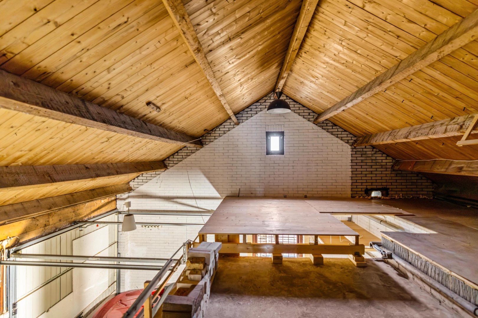 De verdieping beschikt over een ruime overloop en twee in elkaar overlopende kamers, ideaal als slaap-, werk- of hobbyruimte en deels voorzien van praktische kastruimte. Tevens bevindt zich hier extra bergruimte boven zowel de keuken en de garage.