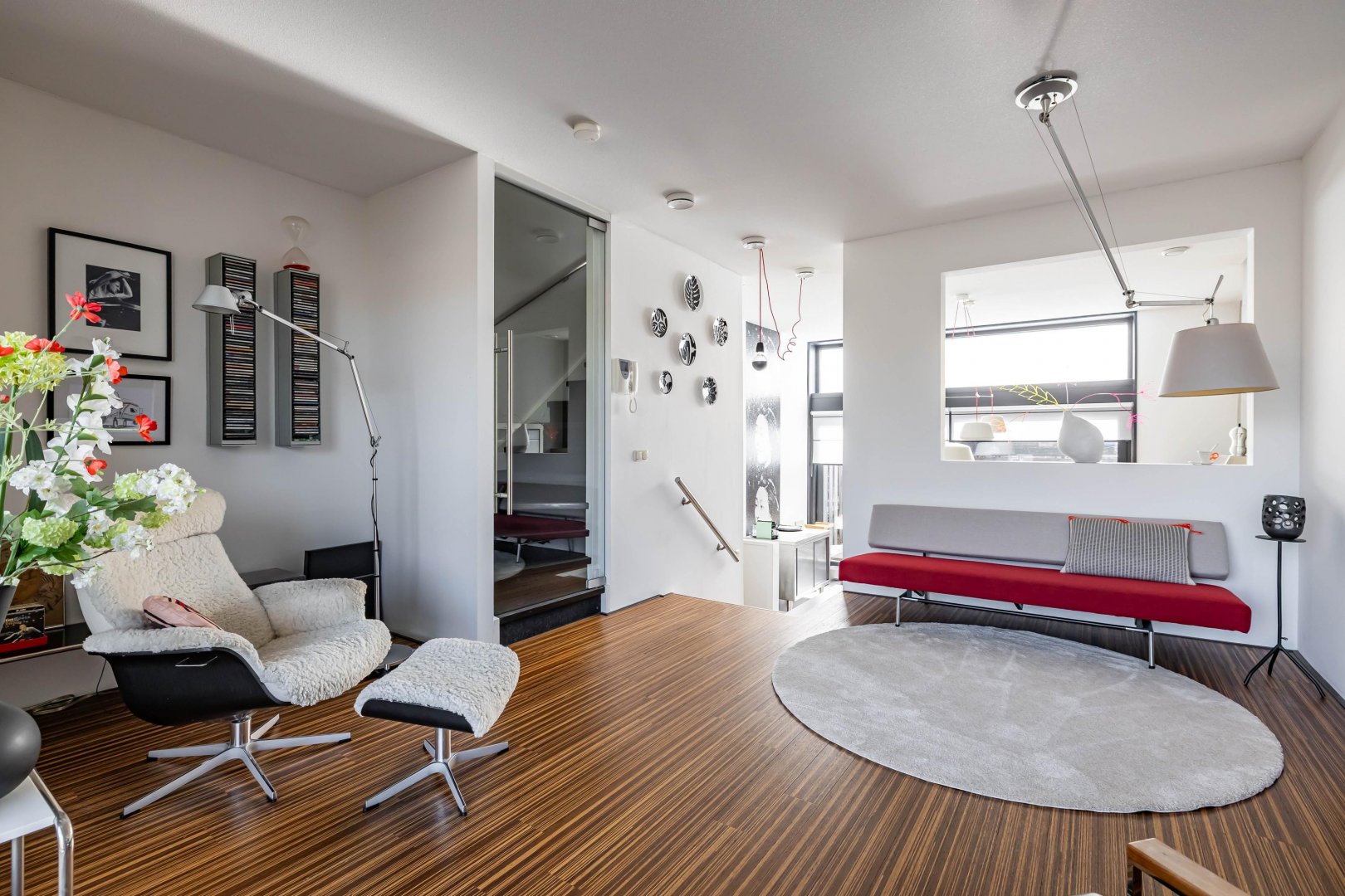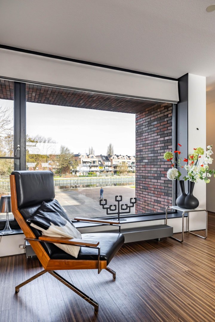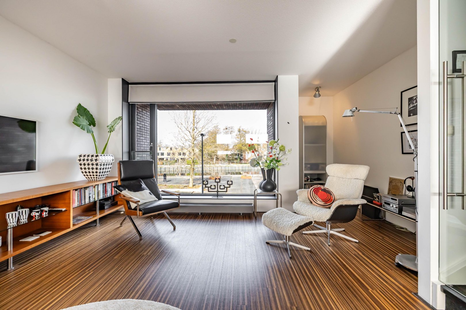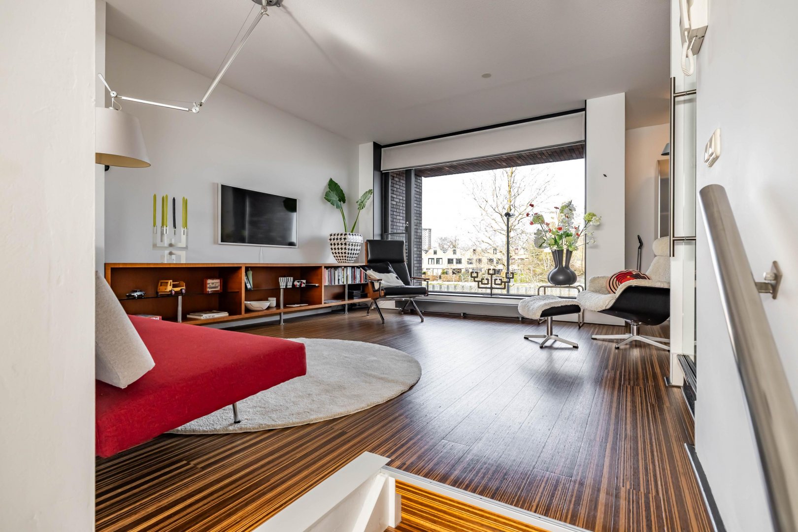 ruime, lichte en hoge living circa 45m² met aan de voorzijde het woonkamerdeel (fraai panoramisch uitzicht over stad en water). Aan de achterzijde de woonkeuken met plaats voor een grote eettafel. De keuken is een retro Piet Zwart van Bruynzeel. Vanuit de keuken via de grote schuifpui toegang tot de achtertuin op het zuiden.