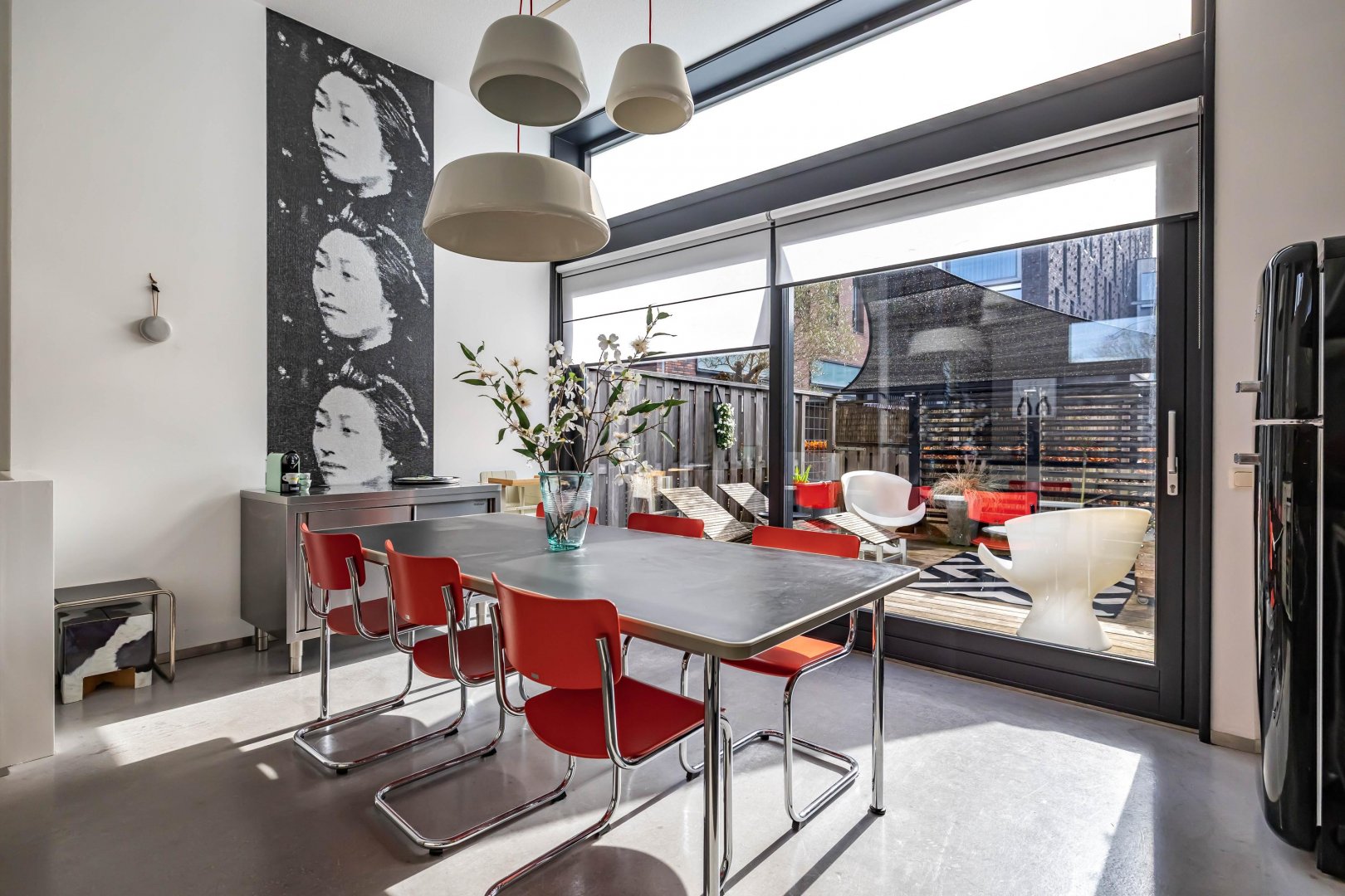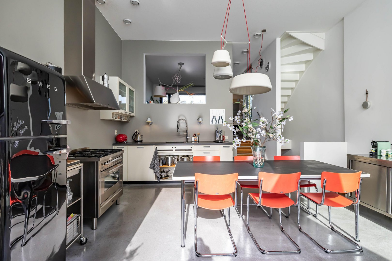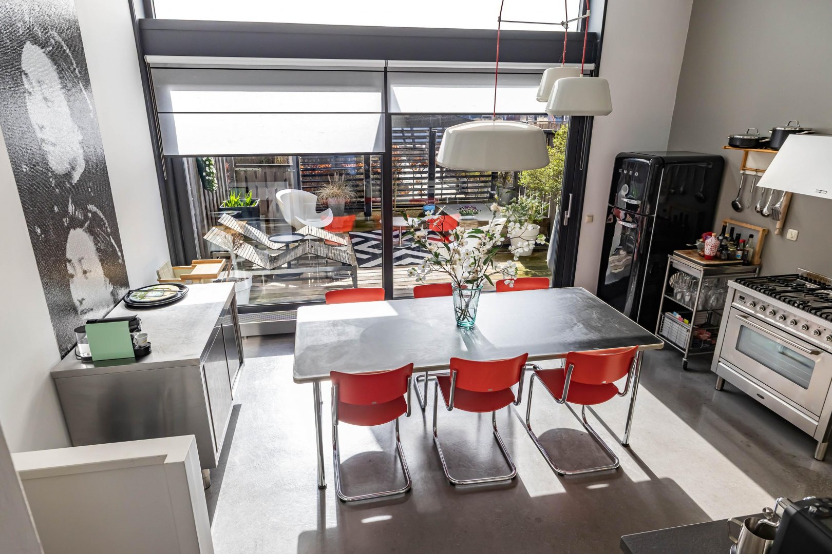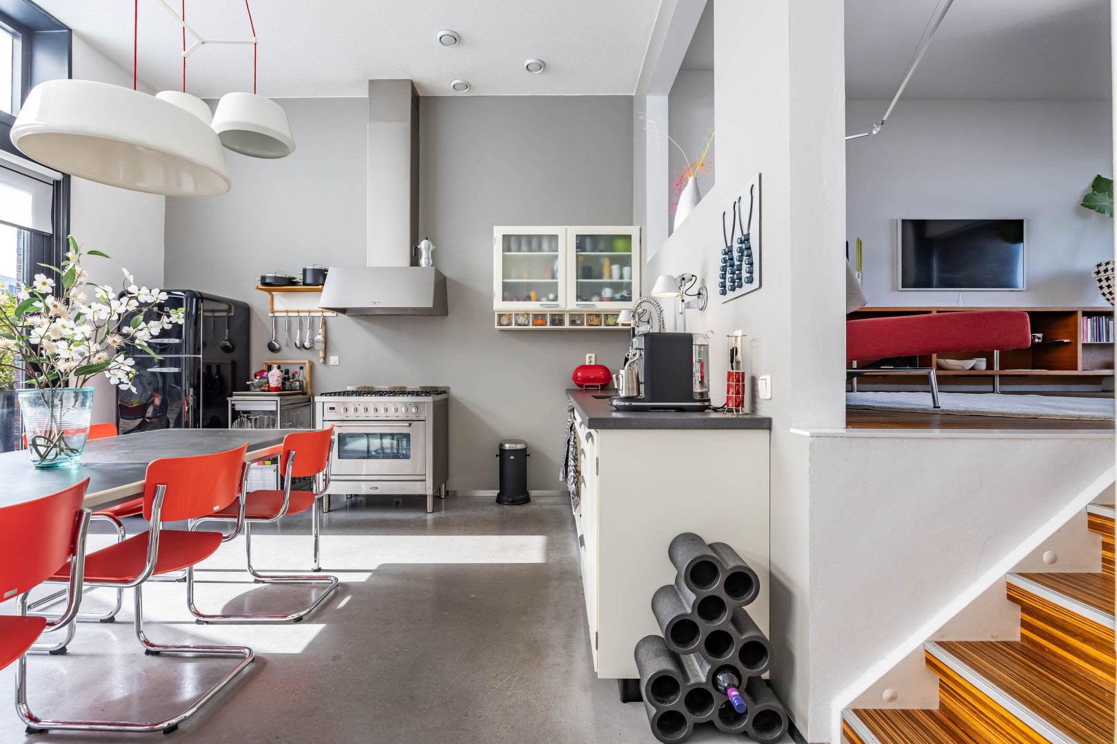 ruime, lichte en hoge living circa 45m² met aan de voorzijde het woonkamerdeel (fraai panoramisch uitzicht over stad en water). Aan de achterzijde de woonkeuken met plaats voor een grote eettafel. De keuken is een retro Piet Zwart van Bruynzeel. Vanuit de keuken via de grote schuifpui toegang tot de achtertuin op het zuiden.