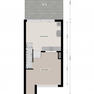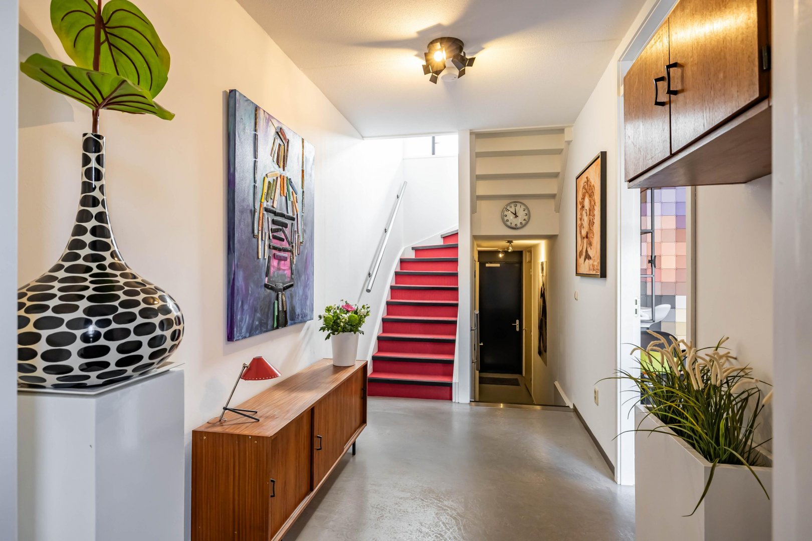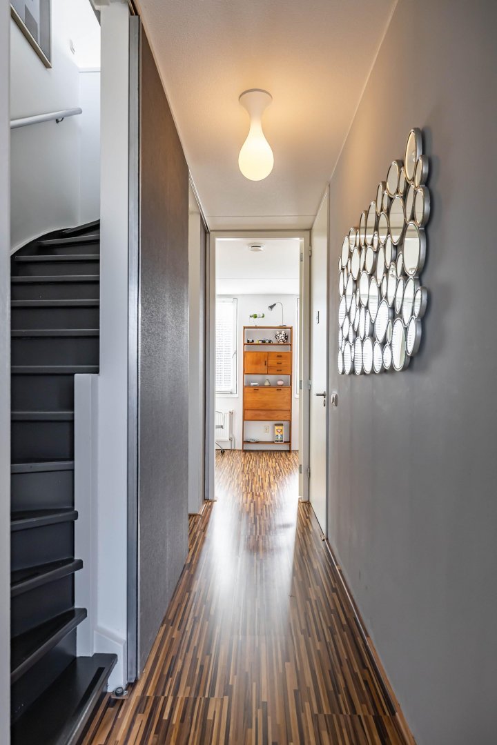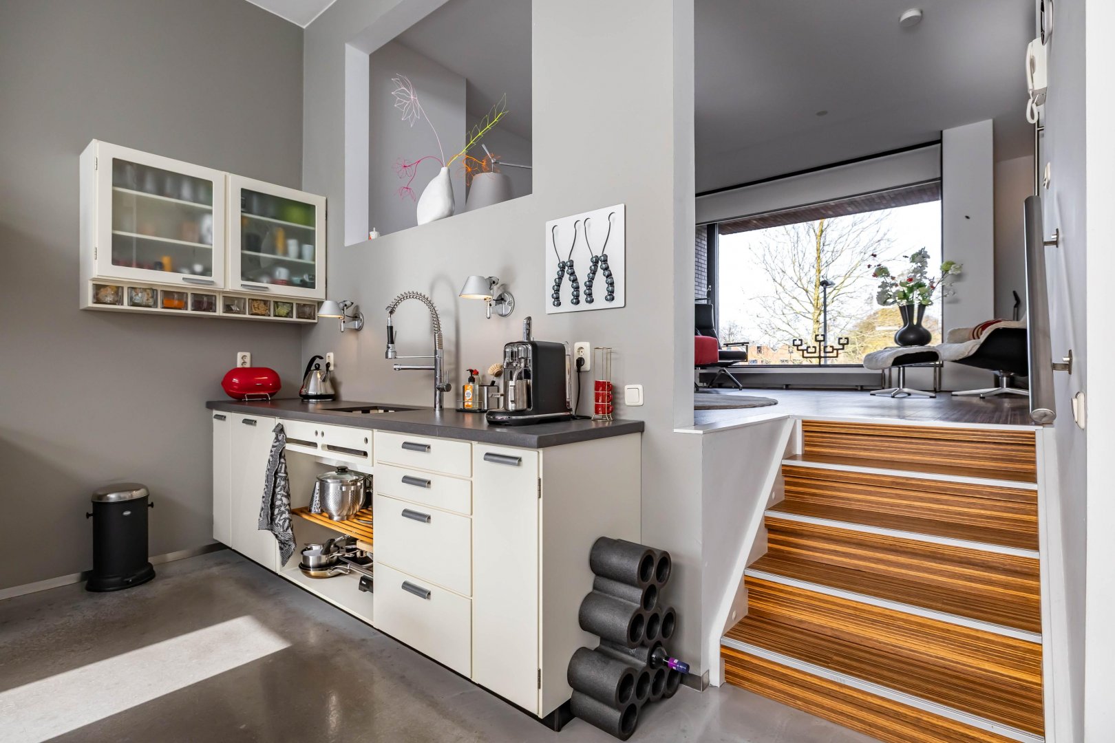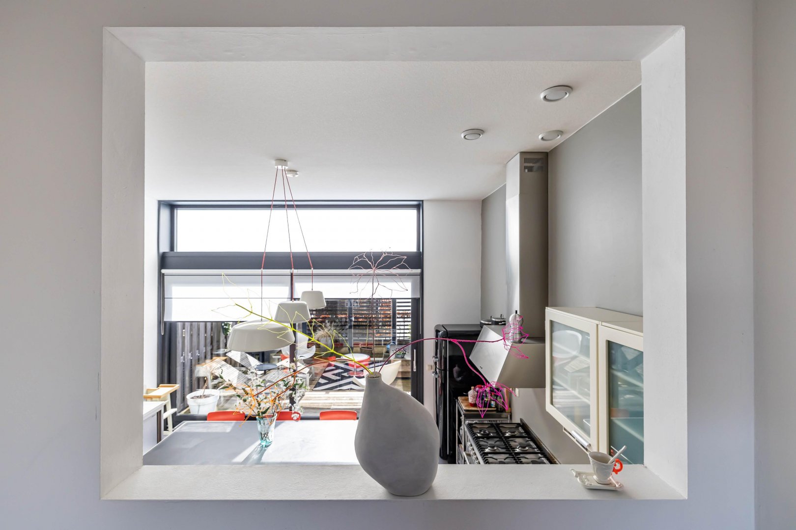 ruime, lichte en hoge living circa 45m² met aan de voorzijde het woonkamerdeel (fraai panoramisch uitzicht over stad en water). Aan de achterzijde de woonkeuken met plaats voor een grote eettafel. De keuken is een retro Piet Zwart van Bruynzeel. Vanuit de keuken via de grote schuifpui toegang tot de achtertuin op het zuiden.