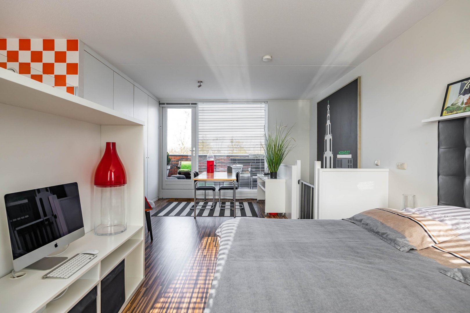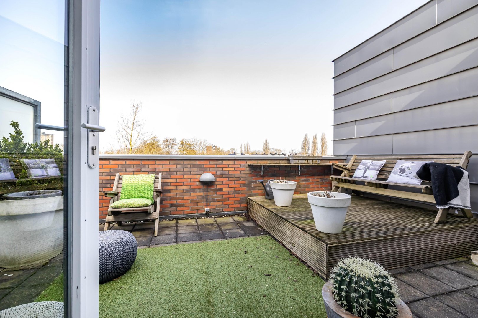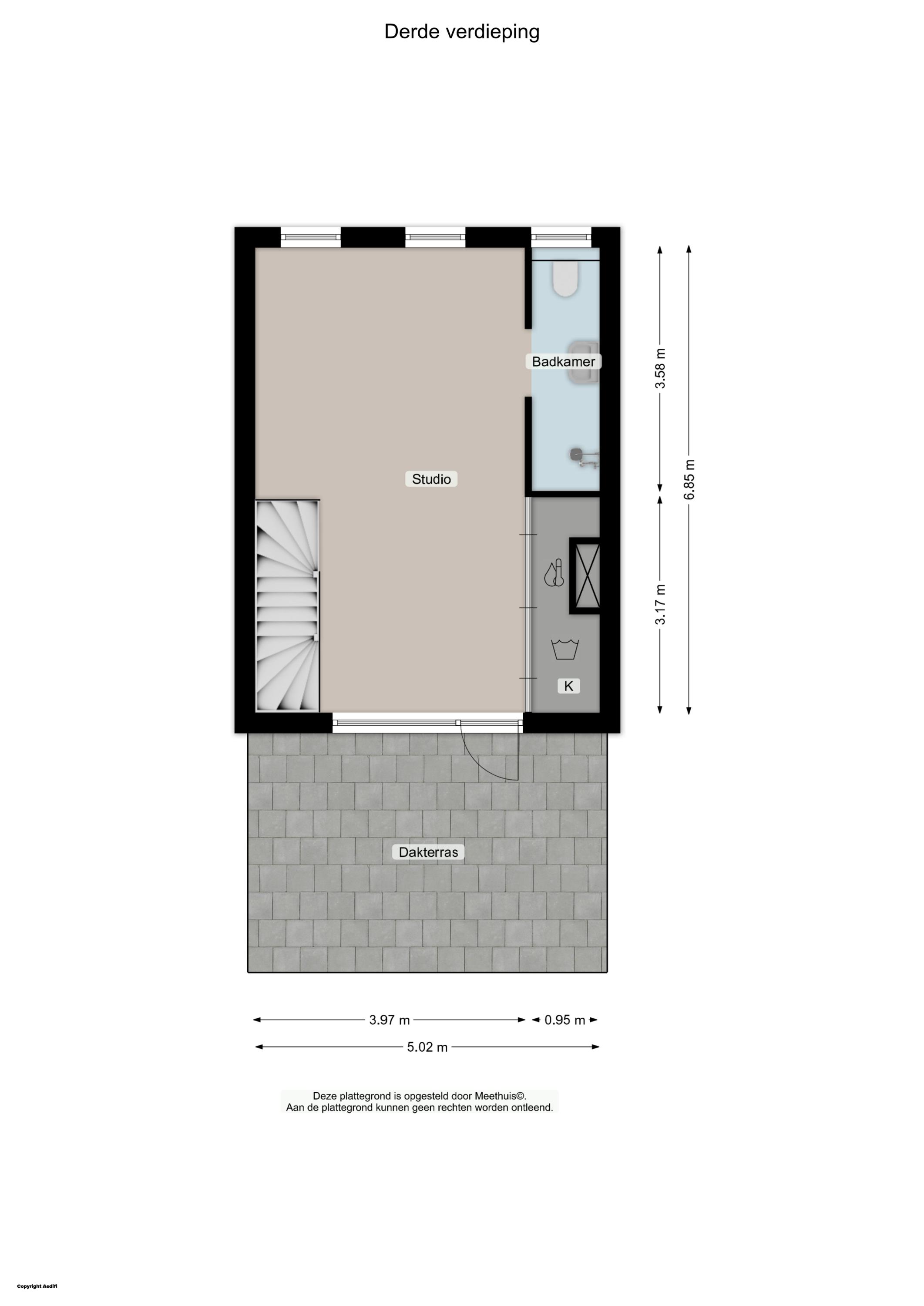 grote open ruimte (circa 30m²) voor diverse doeleinden geschikt: extra slaap-/werkkamer, hobbyruimte, bergruimte etc. Deze ruimte is nu ingericht als open en lichte 'studio' met slaapruimte, grote werk of eettafel en eigen sanitair: douche, toilet en wastafel. Aansluitend aan deze ruimte het dakterras op het noordwesten (heerlijk de middag en avondzon tot laat) met fraai panoramisch uitzicht richting de binnenstad.