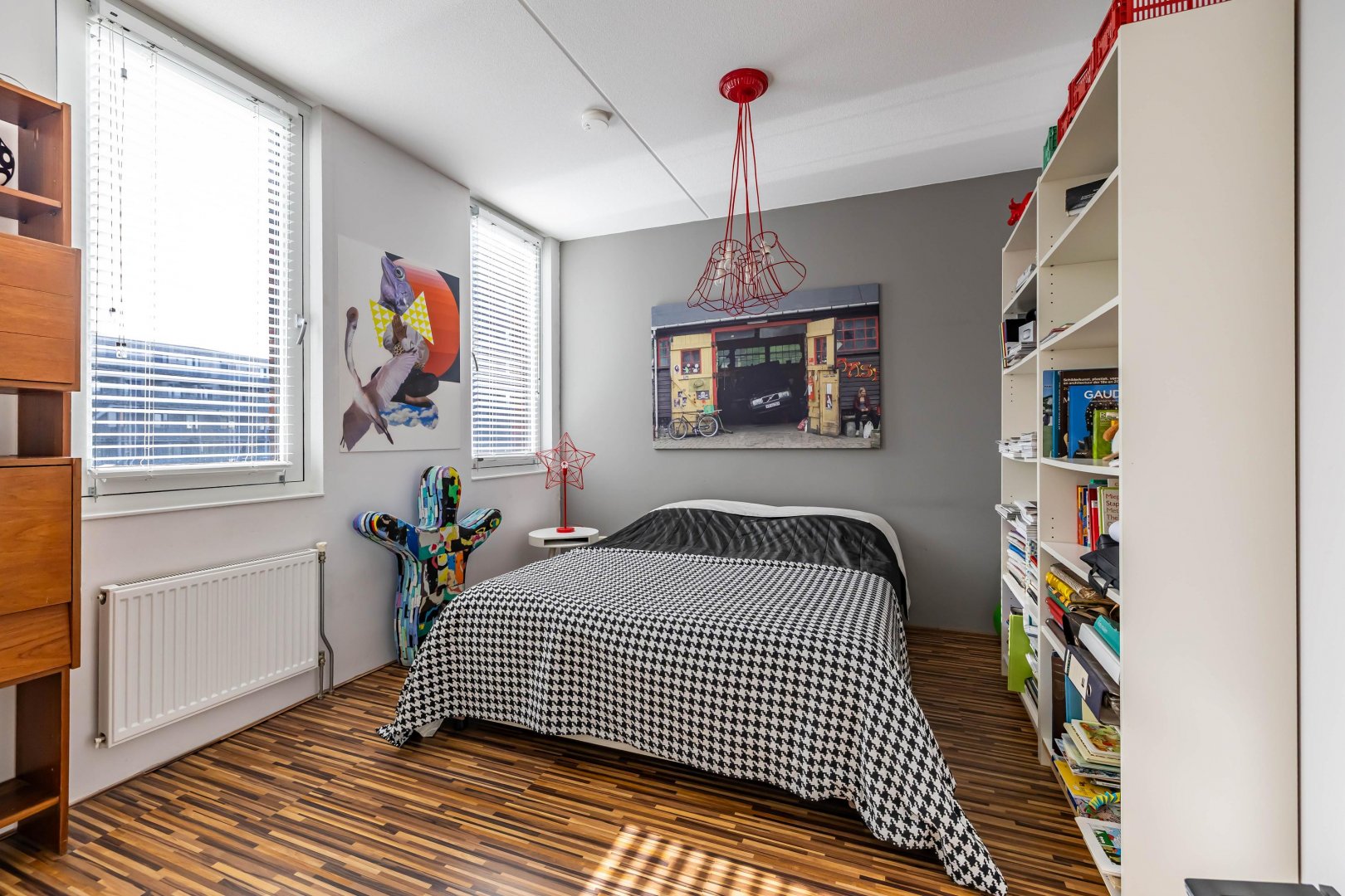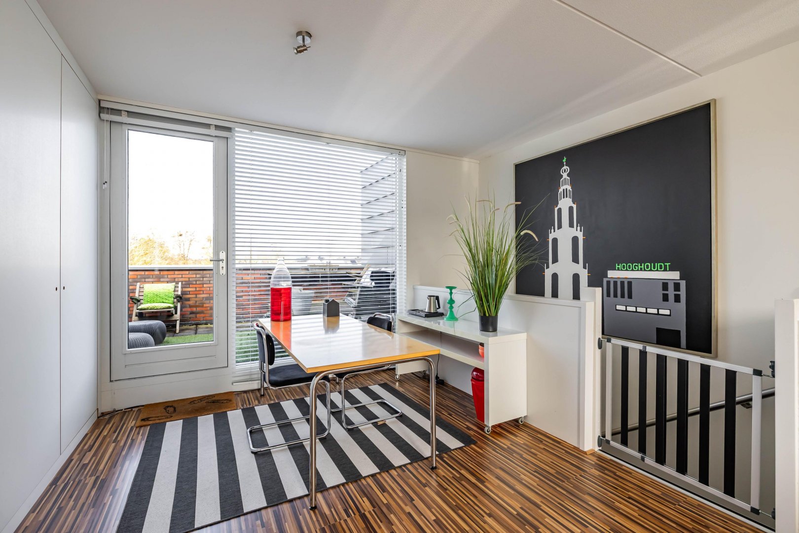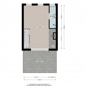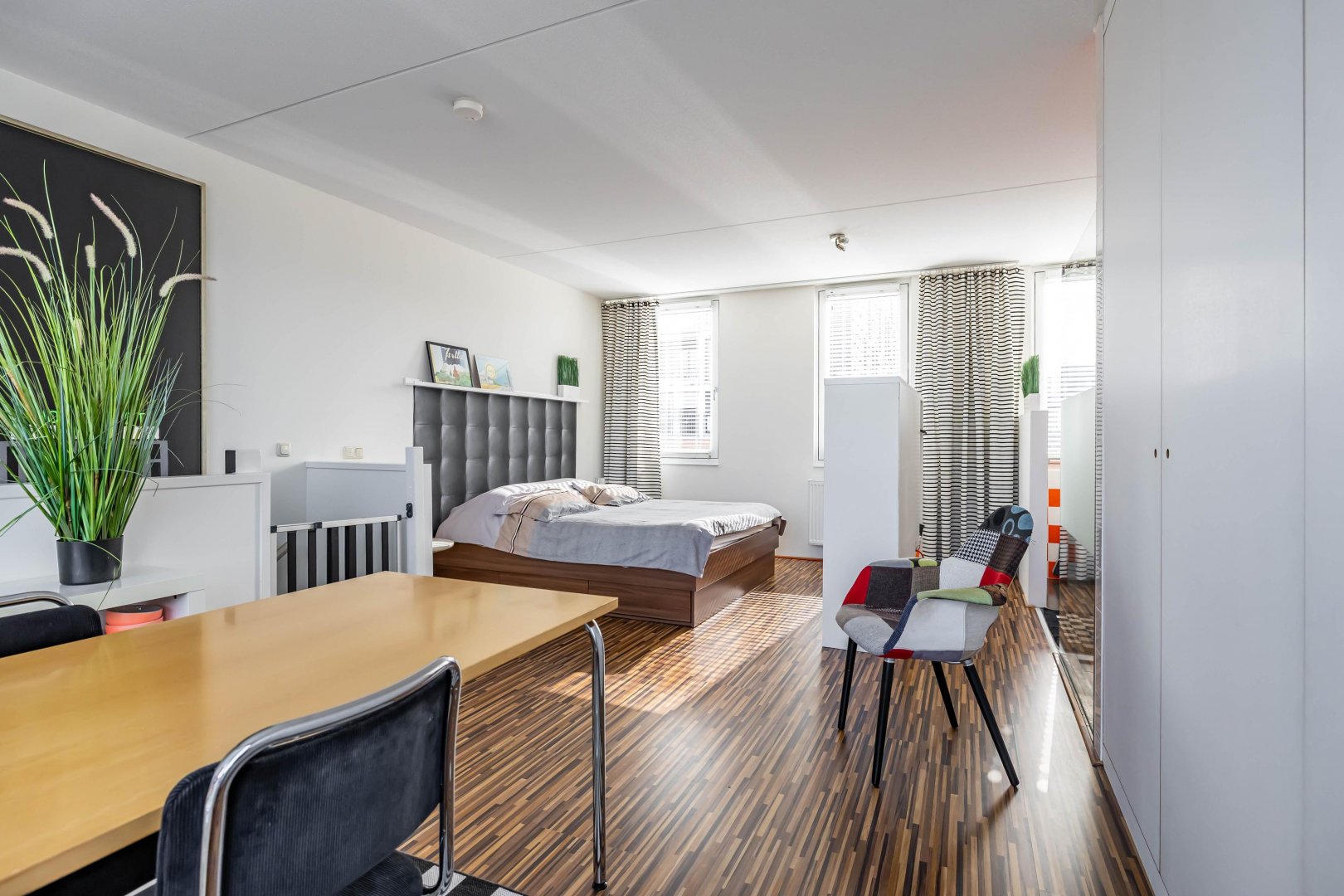grote open ruimte (circa 30m²) voor diverse doeleinden geschikt: extra slaap-/werkkamer, hobbyruimte, bergruimte etc. Deze ruimte is nu ingericht als open en lichte 'studio' met slaapruimte, grote werk of eettafel en eigen sanitair: douche, toilet en wastafel. Aansluitend aan deze ruimte het dakterras op het noordwesten (heerlijk de middag en avondzon tot laat) met fraai panoramisch uitzicht richting de binnenstad.