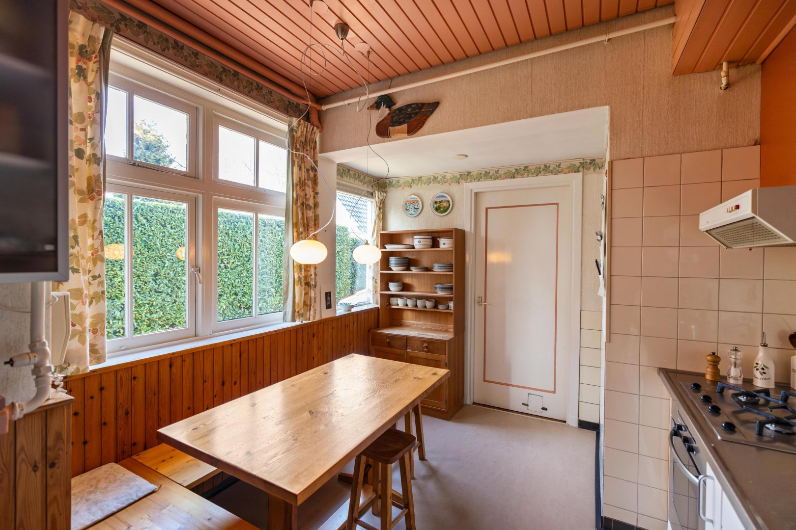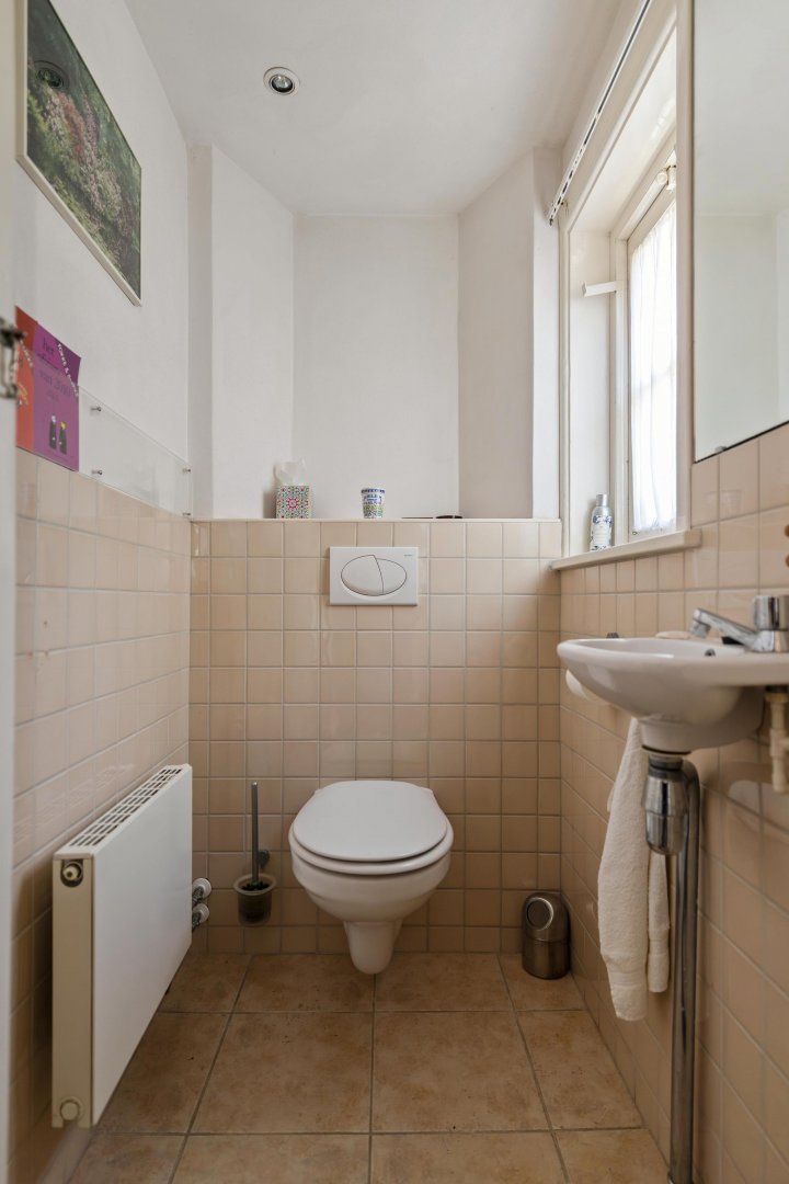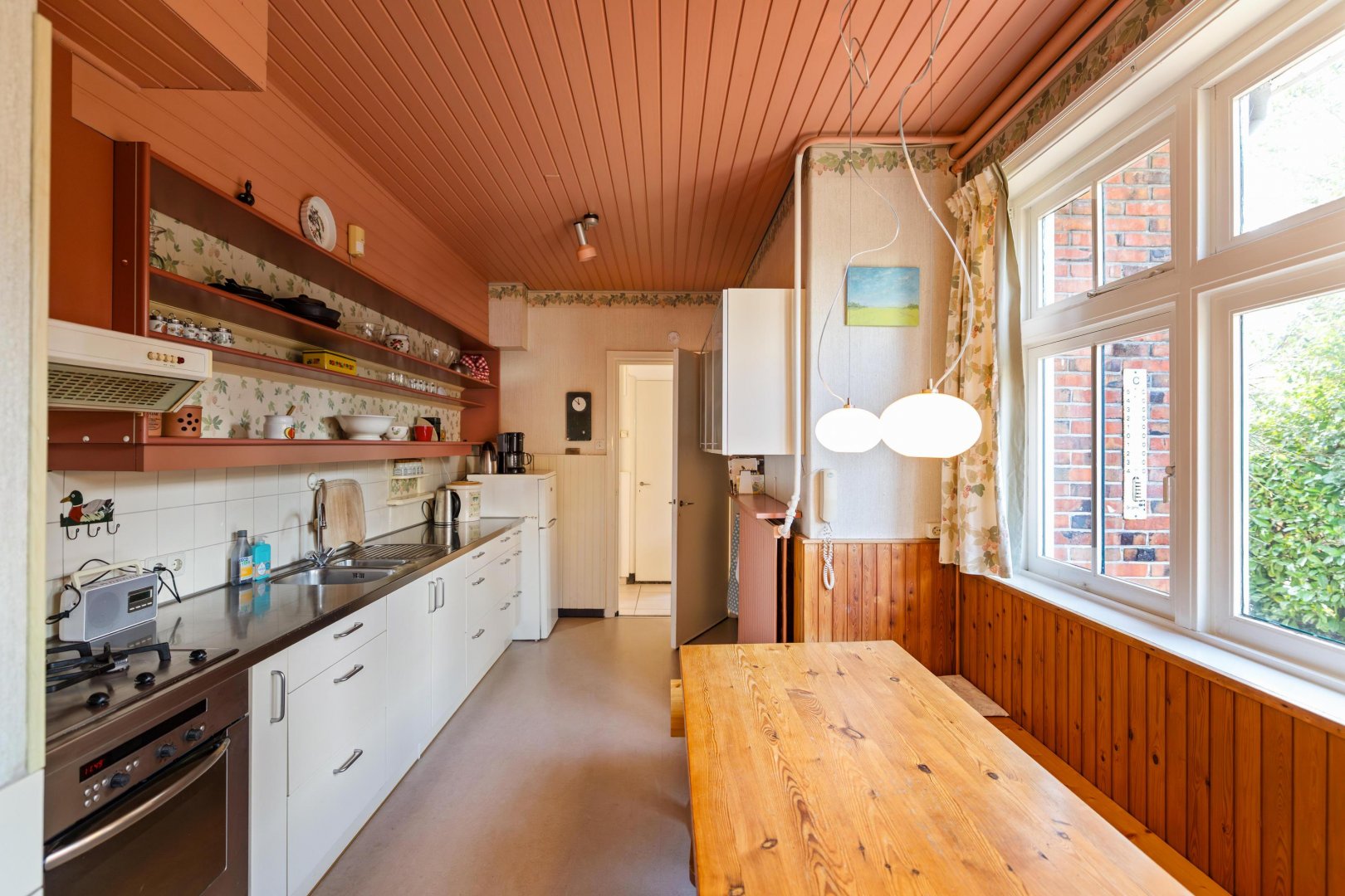 De dichte keuken is voorzien van een eenvoudig keukenblok en biedt toegang tot de achtergelegen bijkeuken – achteringang met CV- en witgoedaansluitingen. Vanuit de hal is tevens de (provisie-)kelder bereikbaar.