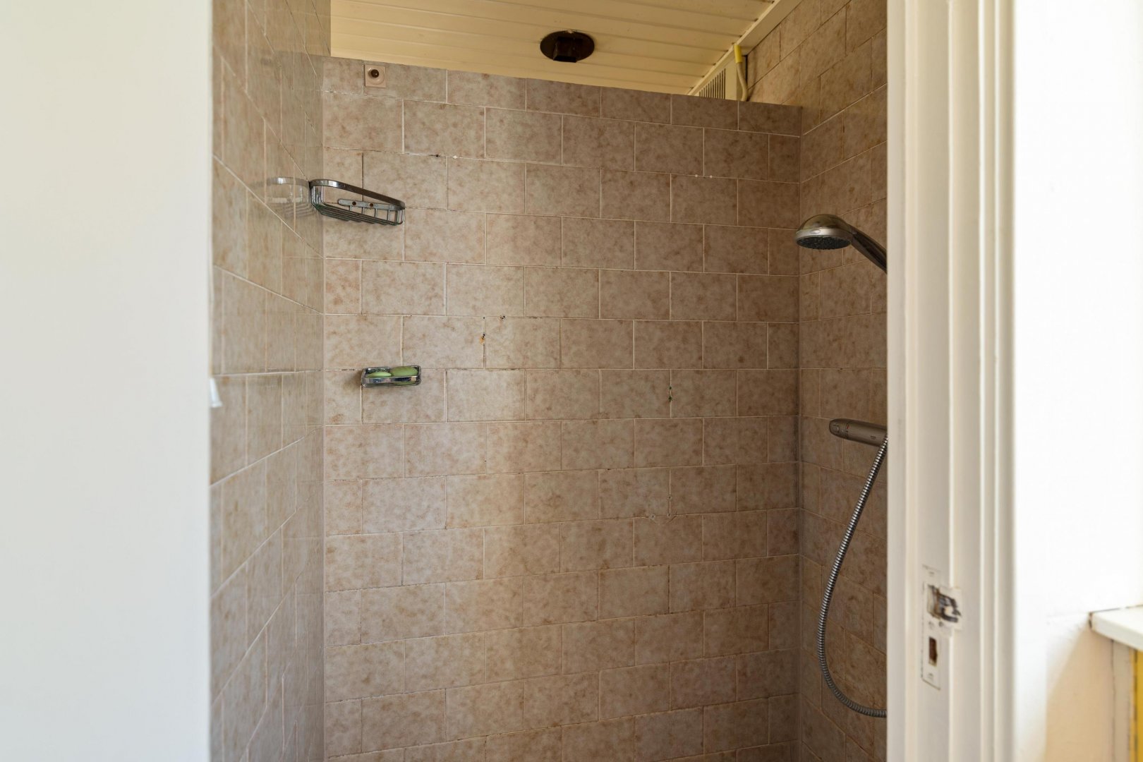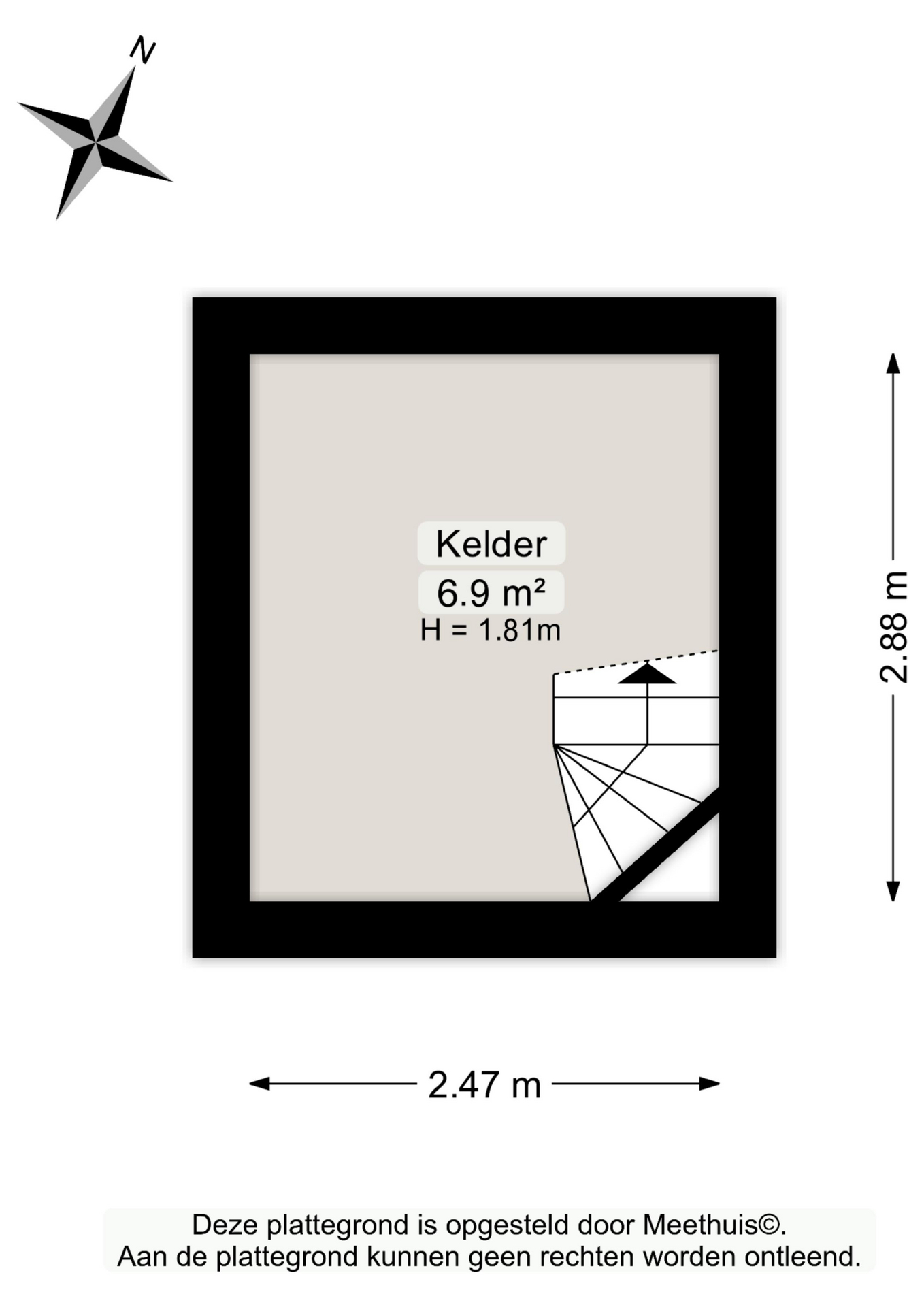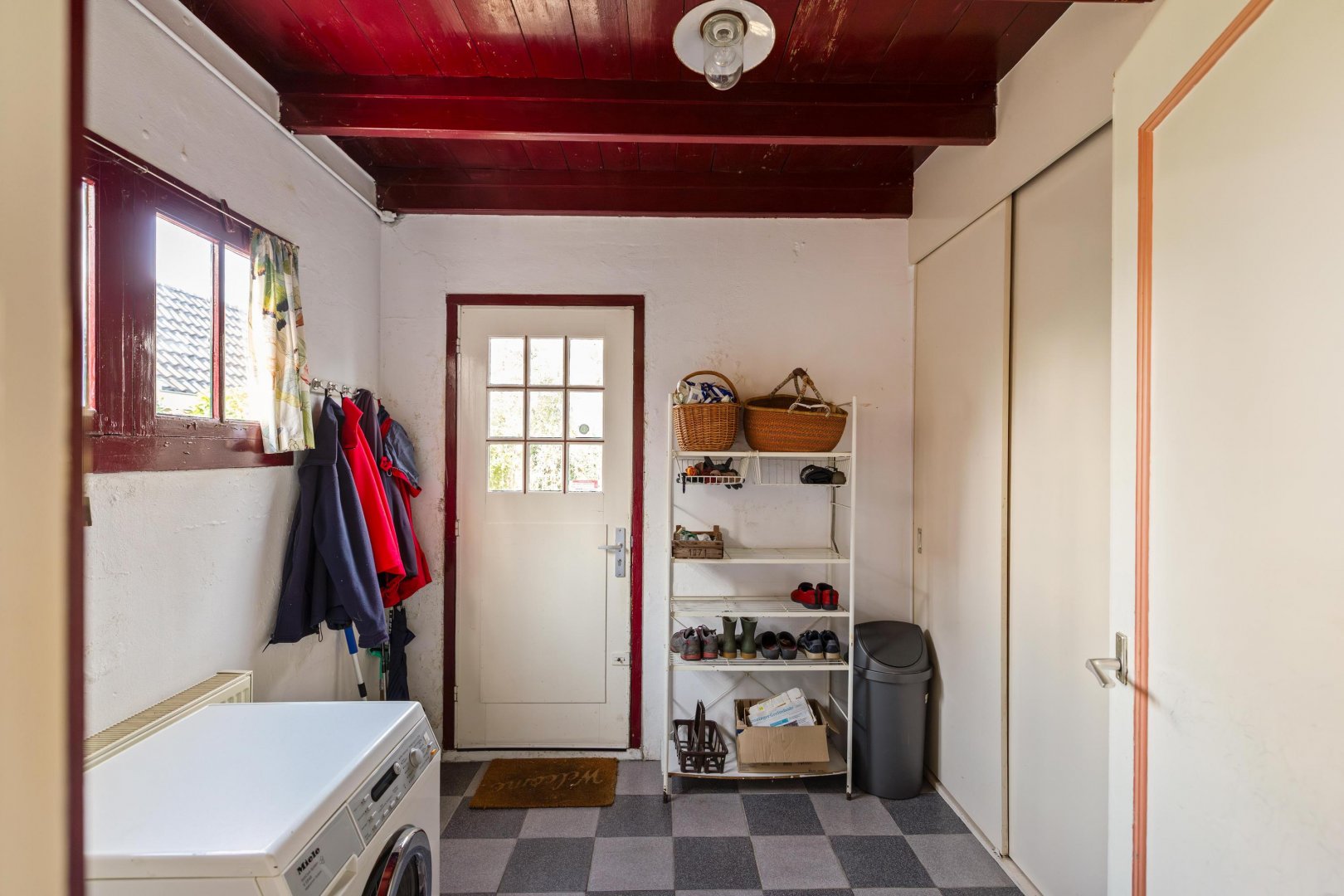 De dichte keuken is voorzien van een eenvoudig keukenblok en biedt toegang tot de achtergelegen bijkeuken – achteringang met CV- en witgoedaansluitingen. Vanuit de hal is tevens de (provisie-)kelder bereikbaar.