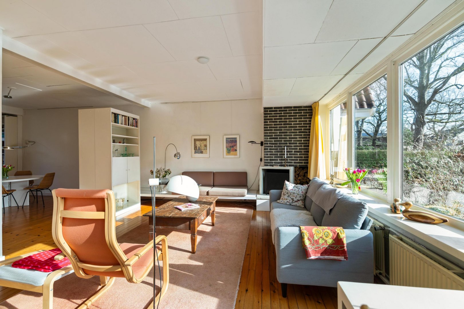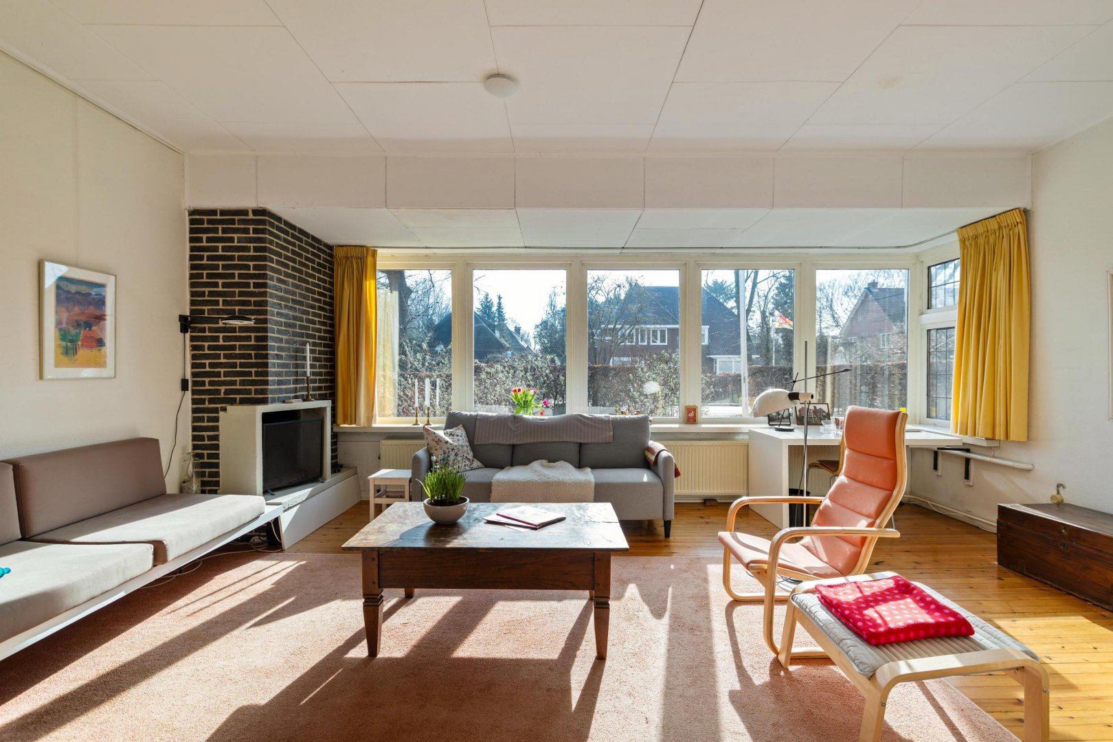 Entree via een vestibule naar de hal met toilet en trapopgang. De speels ingedeelde woonkamer beschikt over een haard en deuren naar de achtertuin. Het huis heeft zijn naam gekregen door de 5 grote ramen aan de voorzijde die naast een prettige lichtinval ook een fraai binnen – buitengevoel geven met zicht op de voortuin.