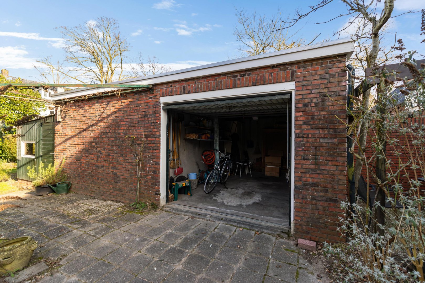 De besloten achtertuin is gunstig gelegen op het westen en beschikt over meerdere terrassen waar fijn van de zon en ook van schaduwrijke plekjes kan worden genoten. De garage en aparte berging zijn ideaal voor fietsen, opslag of als hobbyruimte. Aan de voorzijde bevindt zich een royale oprit met parkeergelegenheid voor meerdere auto’s. De garage biedt ruimte voor één auto.