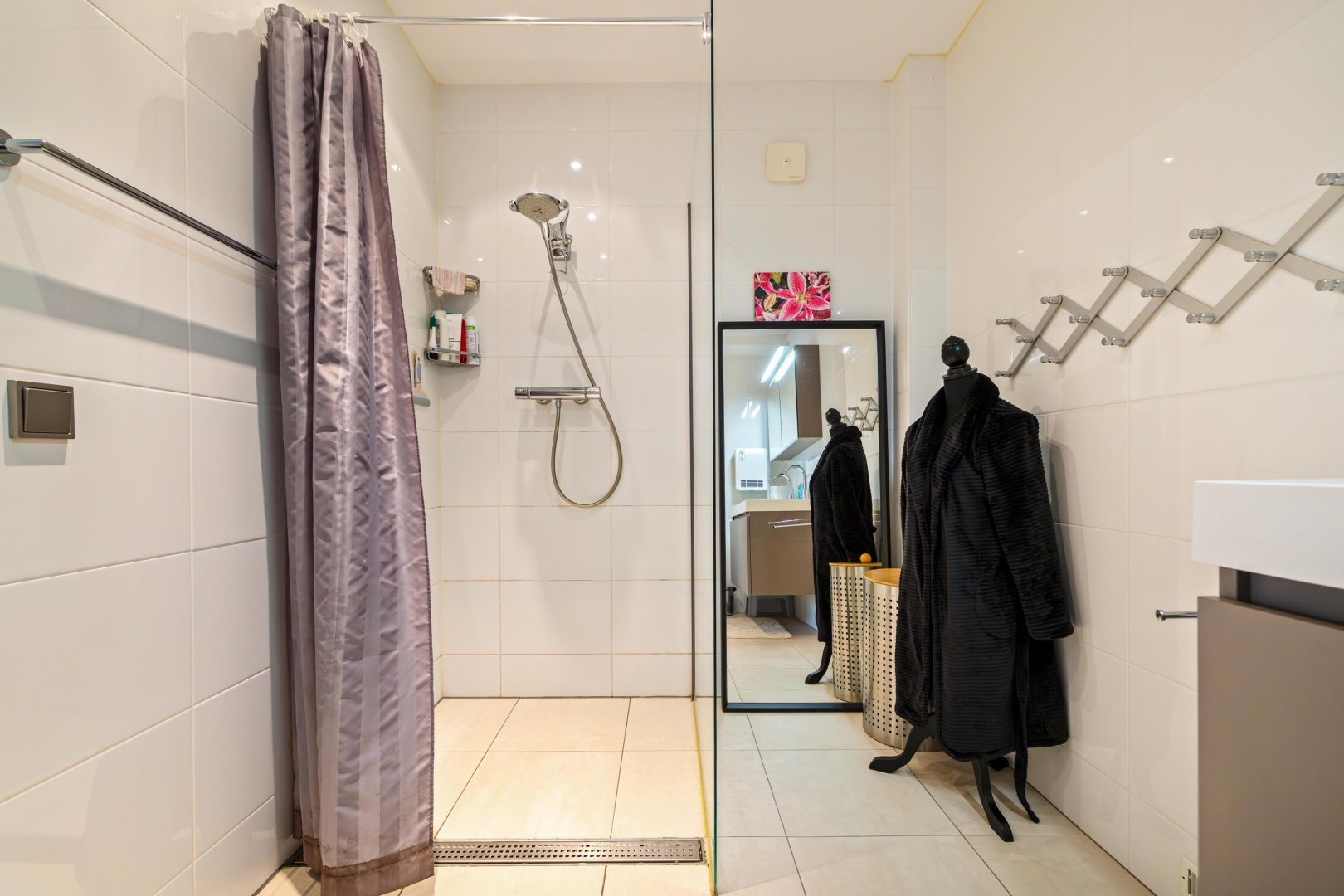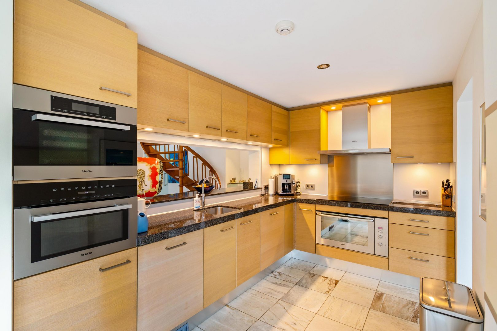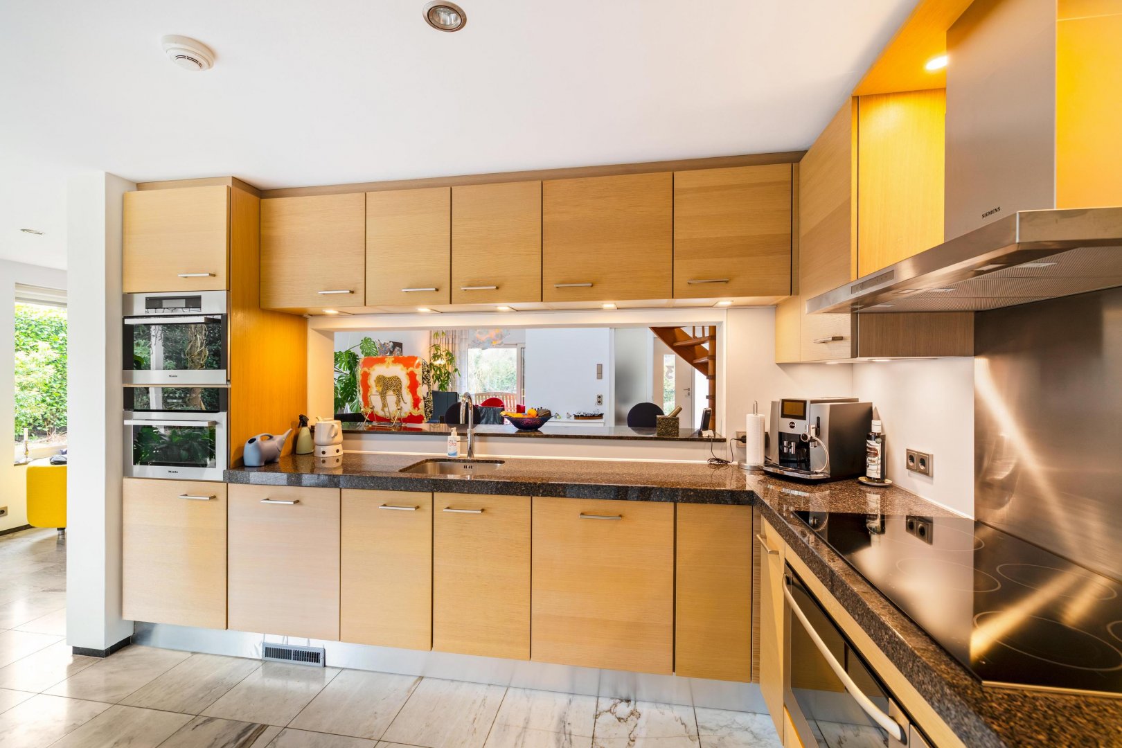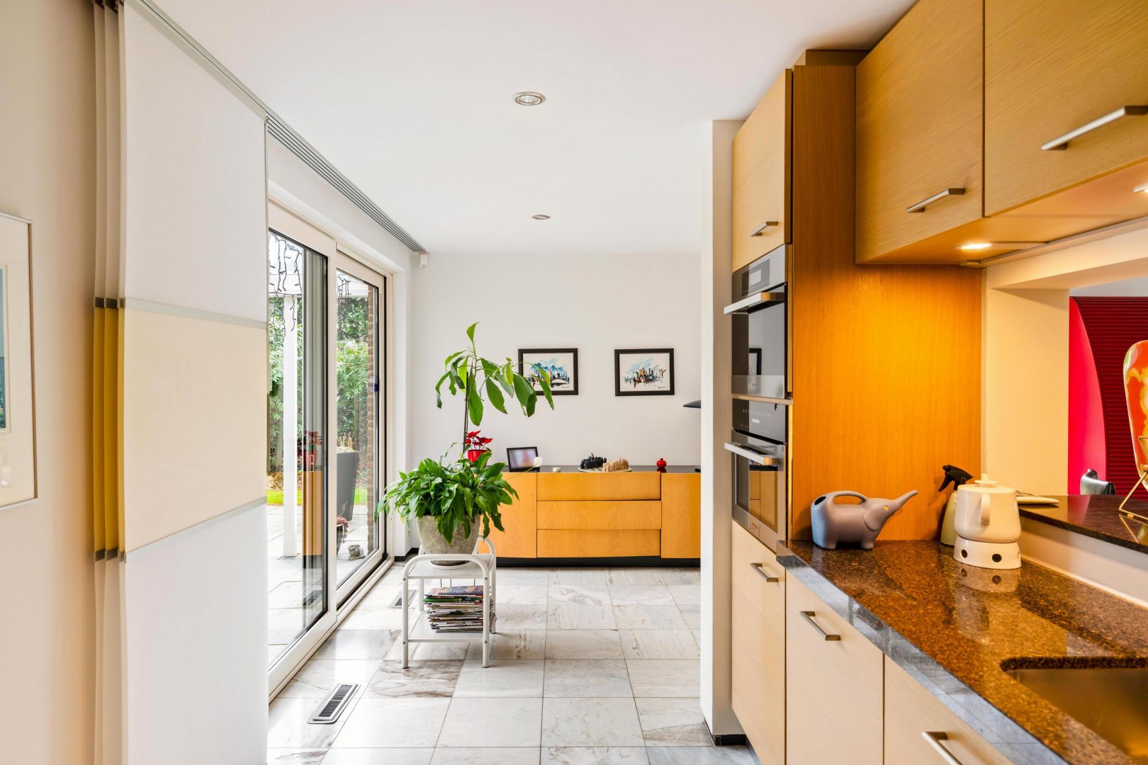 De moderne keuken is voorzien van diverse inbouwapparatuur en biedt volop werk- en opbergruimte. Aansluitend bevindt zich een praktische bijkeuken en toegang tot het overdekte terras. Deze is overigens ook vanuit de living te bereiken.