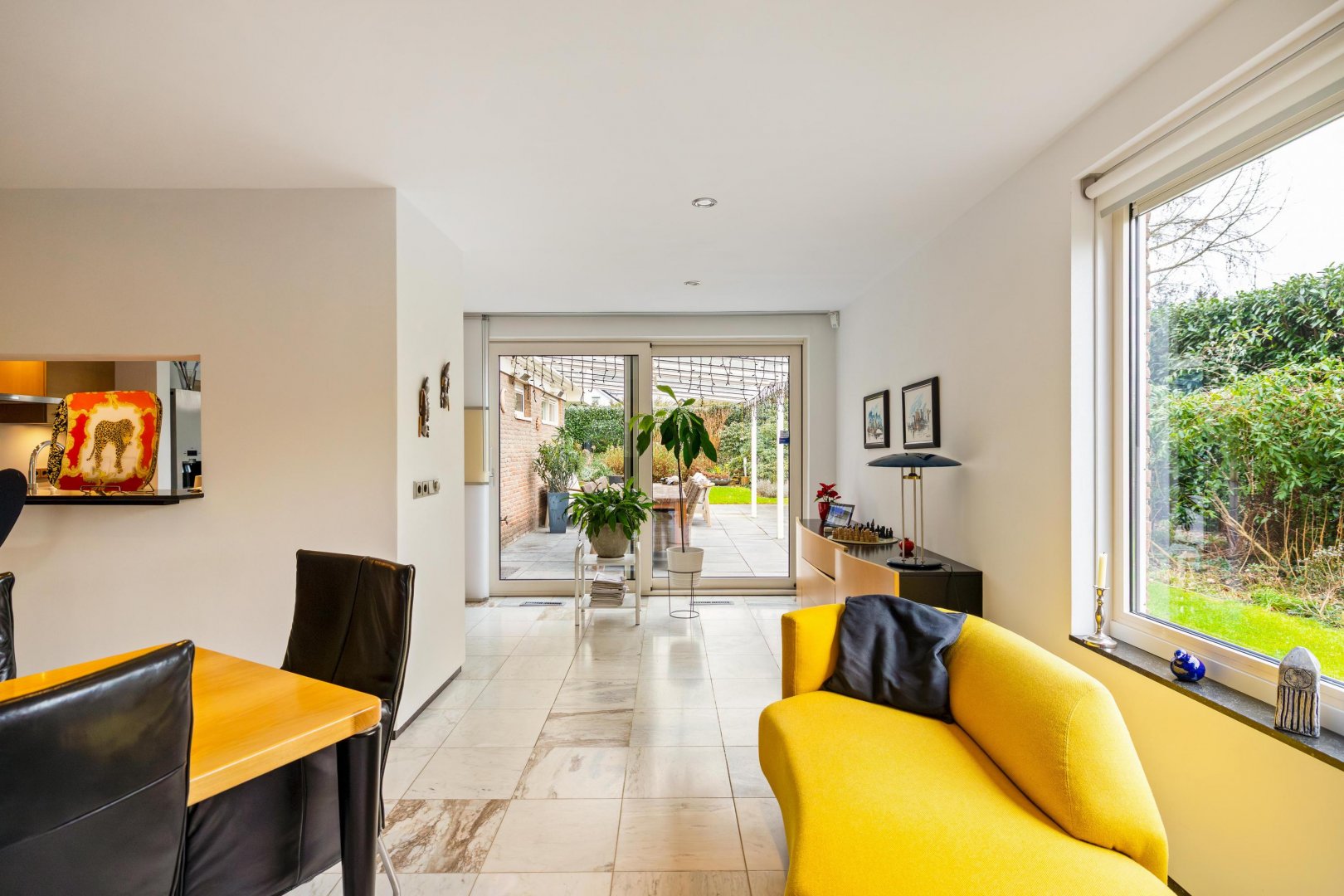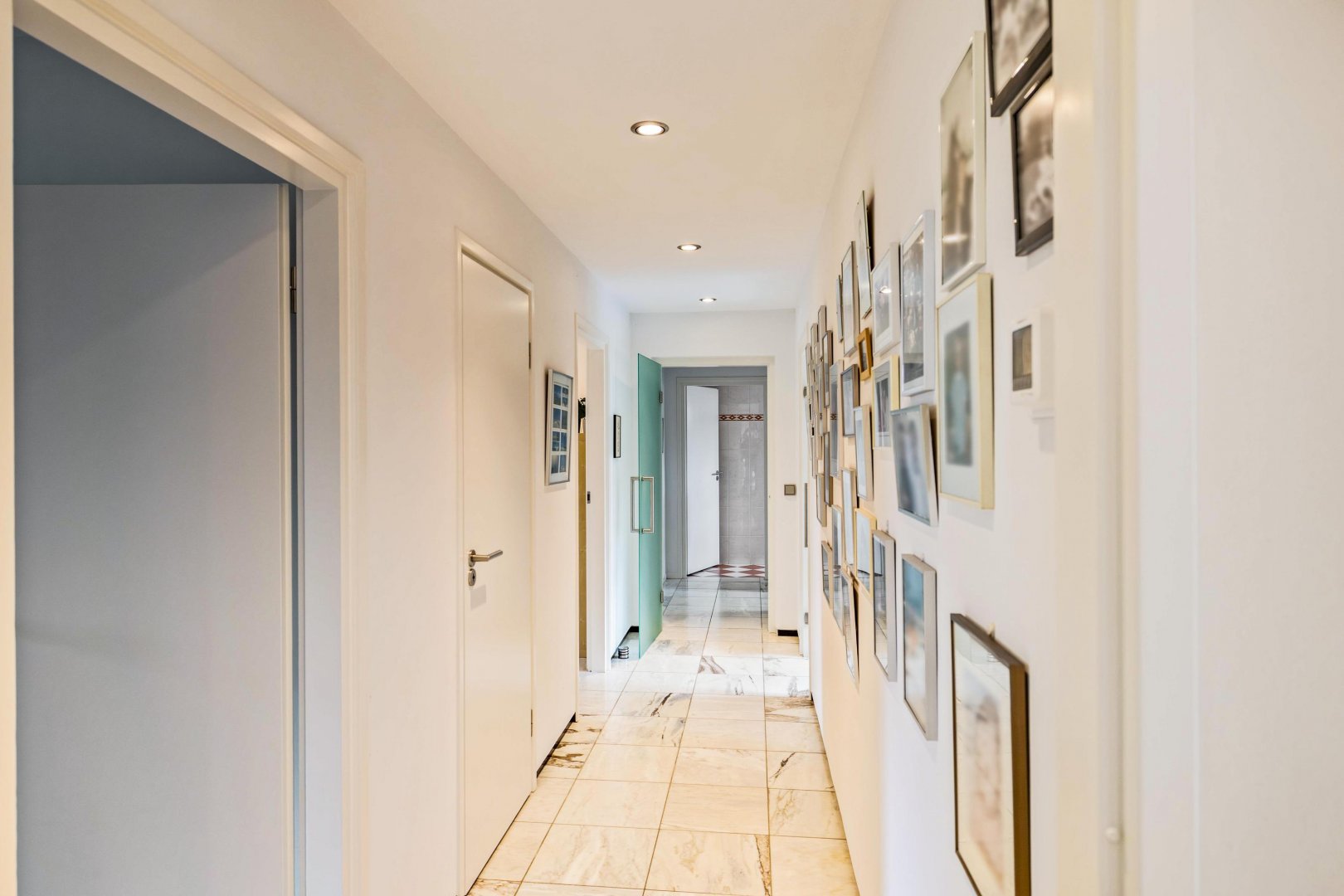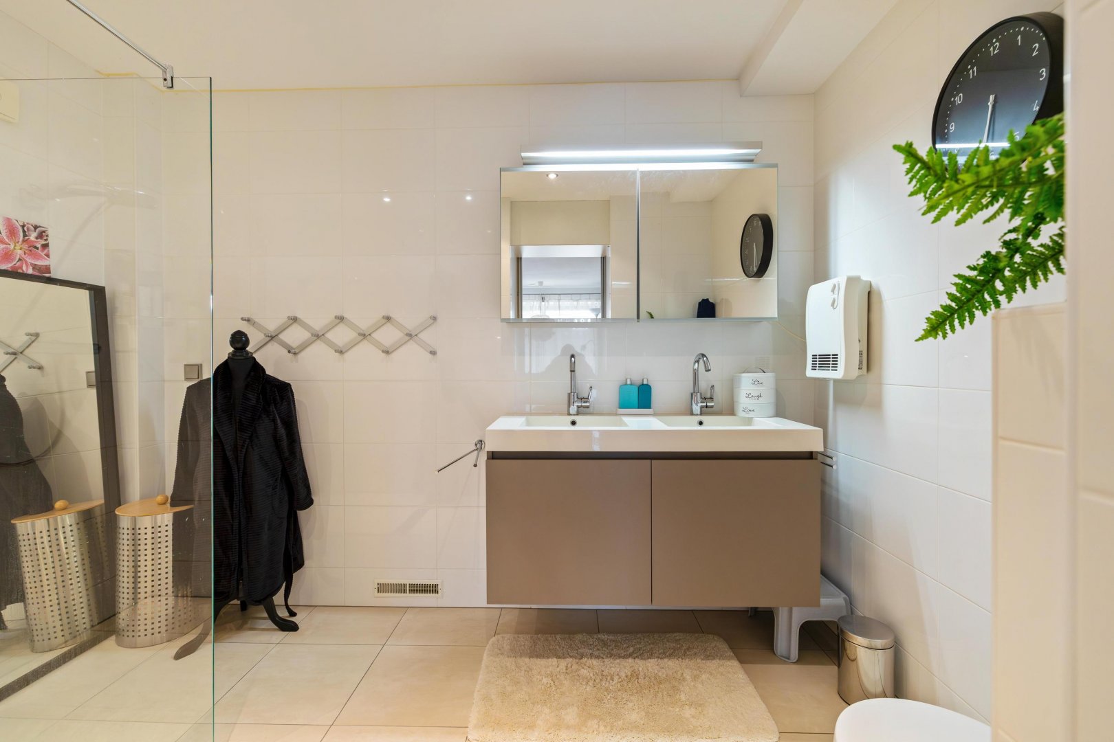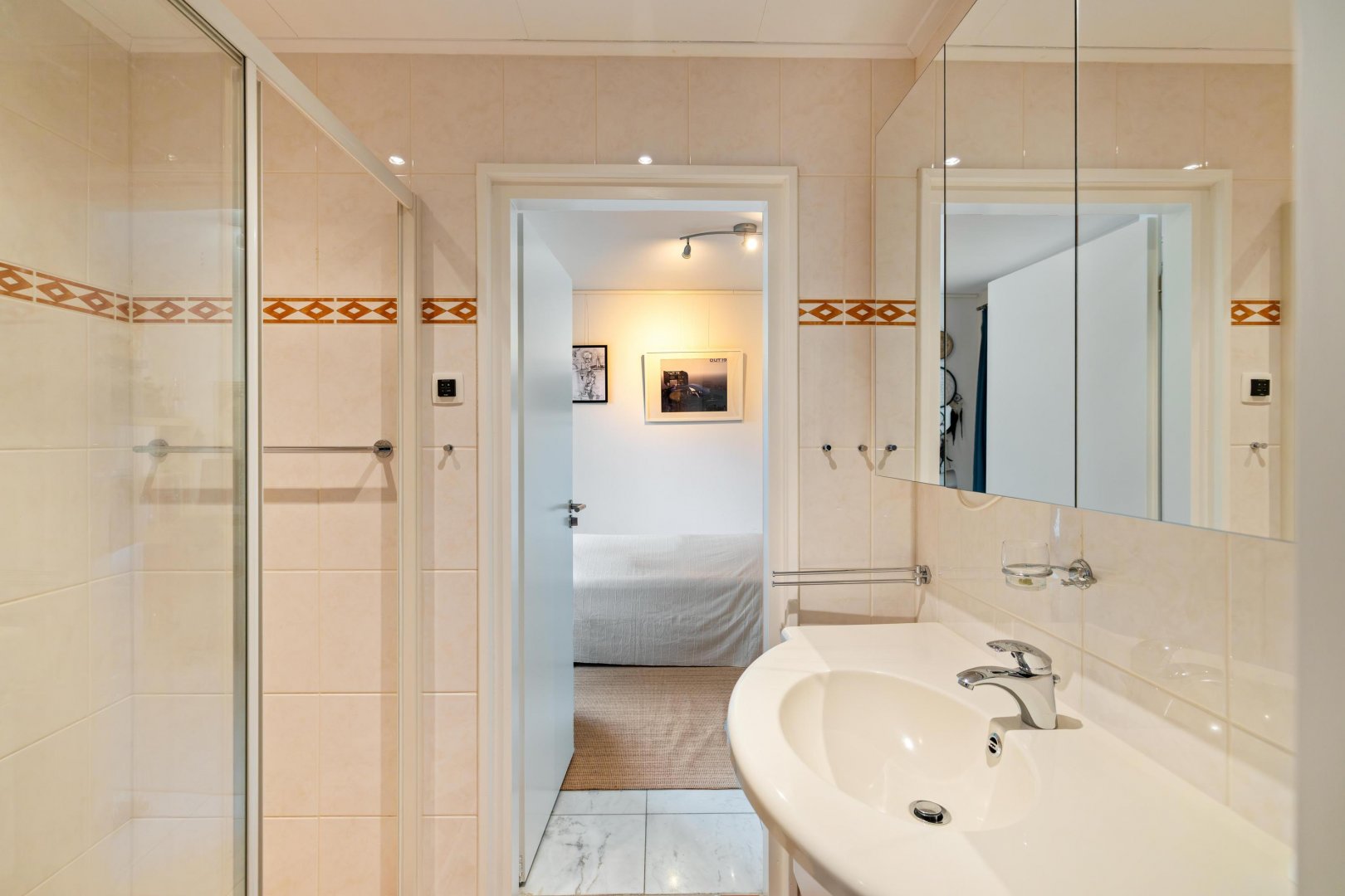 De moderne keuken is voorzien van diverse inbouwapparatuur en biedt volop werk- en opbergruimte. Aansluitend bevindt zich een praktische bijkeuken en toegang tot het overdekte terras. Deze is overigens ook vanuit de living te bereiken.