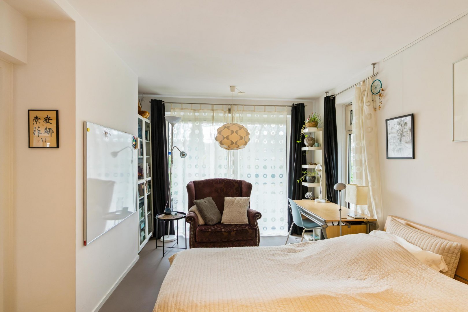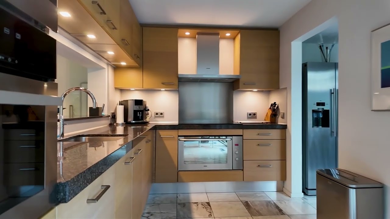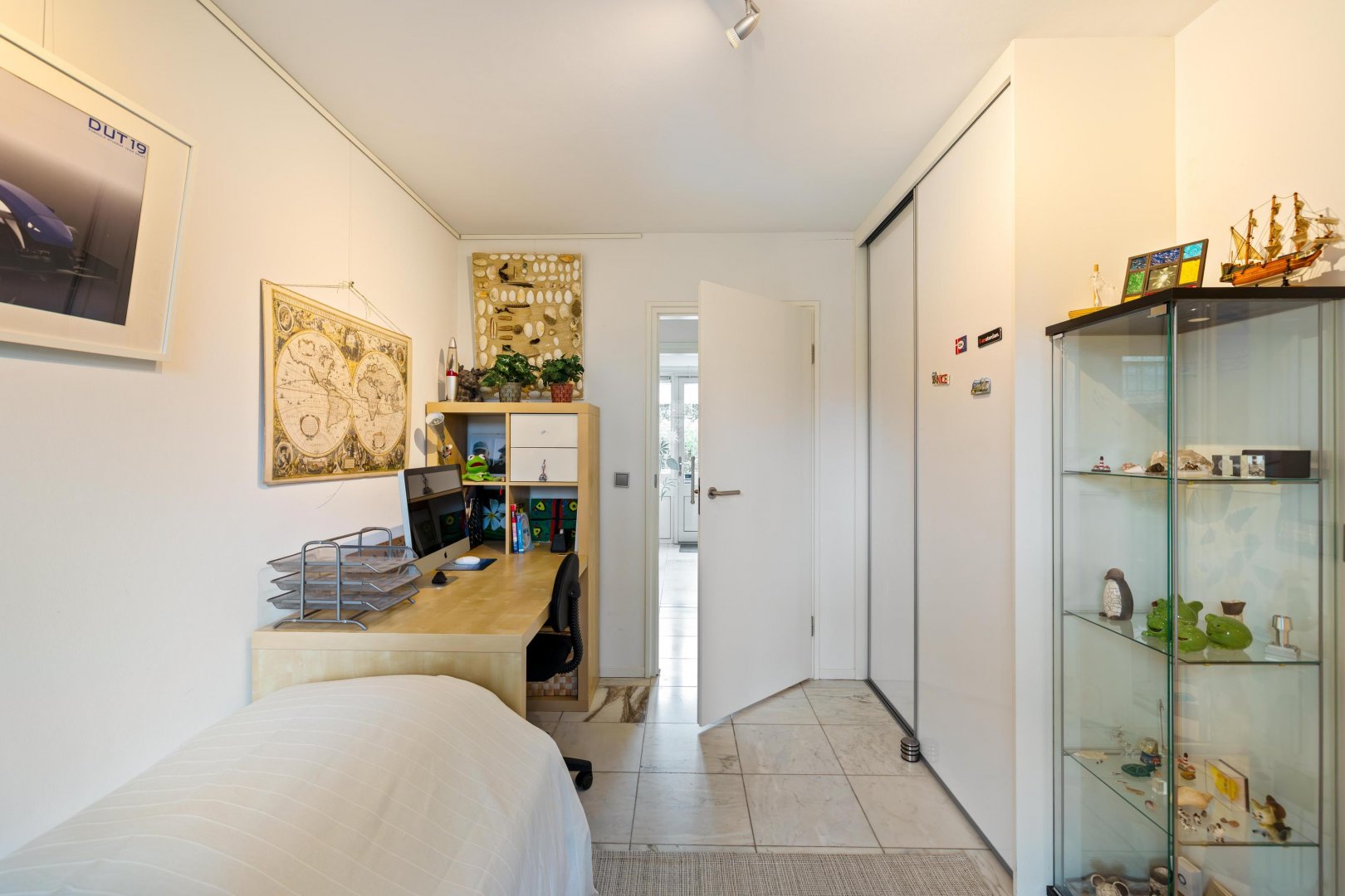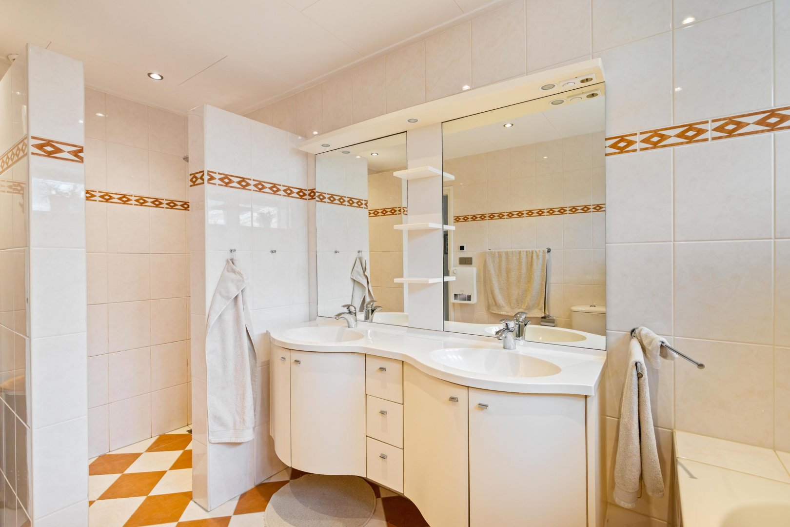 De moderne keuken is voorzien van diverse inbouwapparatuur en biedt volop werk- en opbergruimte. Aansluitend bevindt zich een praktische bijkeuken en toegang tot het overdekte terras. Deze is overigens ook vanuit de living te bereiken.
