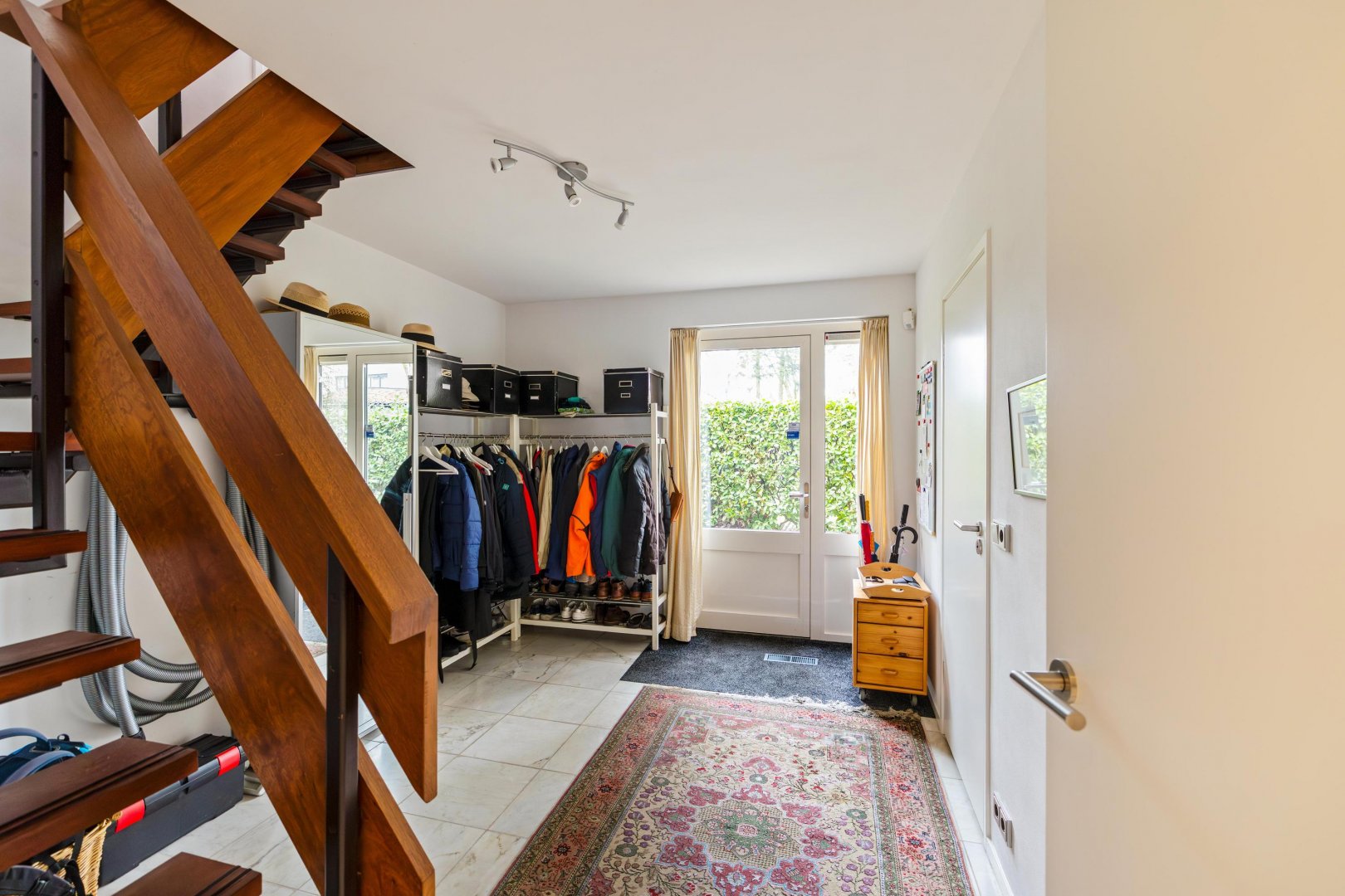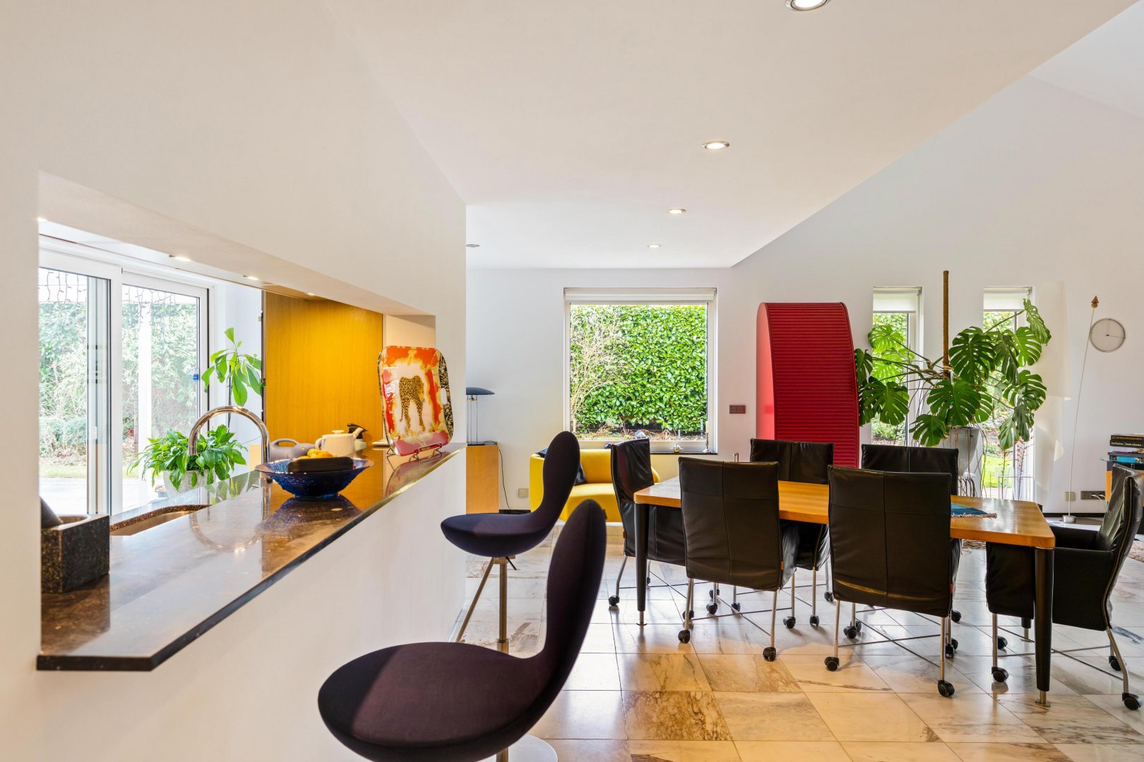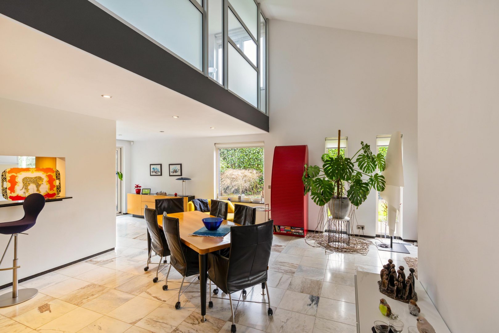 De ruime entree met garderobe geeft direct toegang tot de royale leefruimtes. De sfeervolle woonkamer met gashaard en fraaie natuurstenen vloer vormt samen met de halfopen keuken een indrukwekkende living van leefruimte van 72 m². Dankzij de grote raampartijen en hoge plafonds geniet u hier van veel licht en een prettig uitzicht op het omliggende groen.