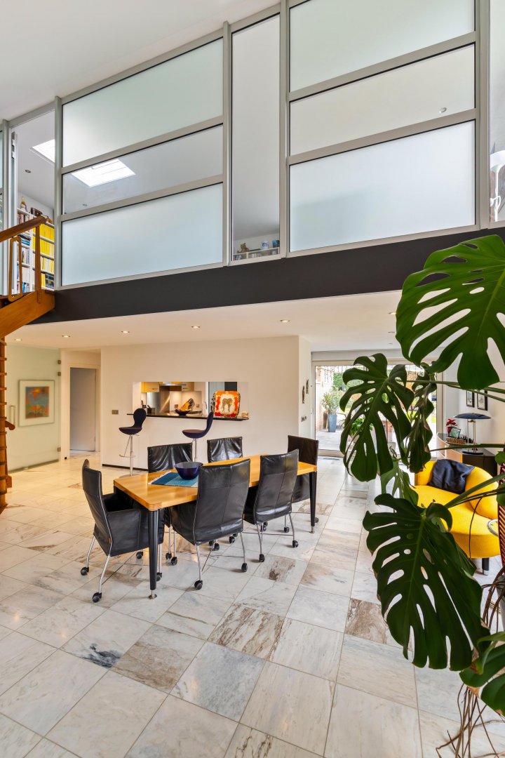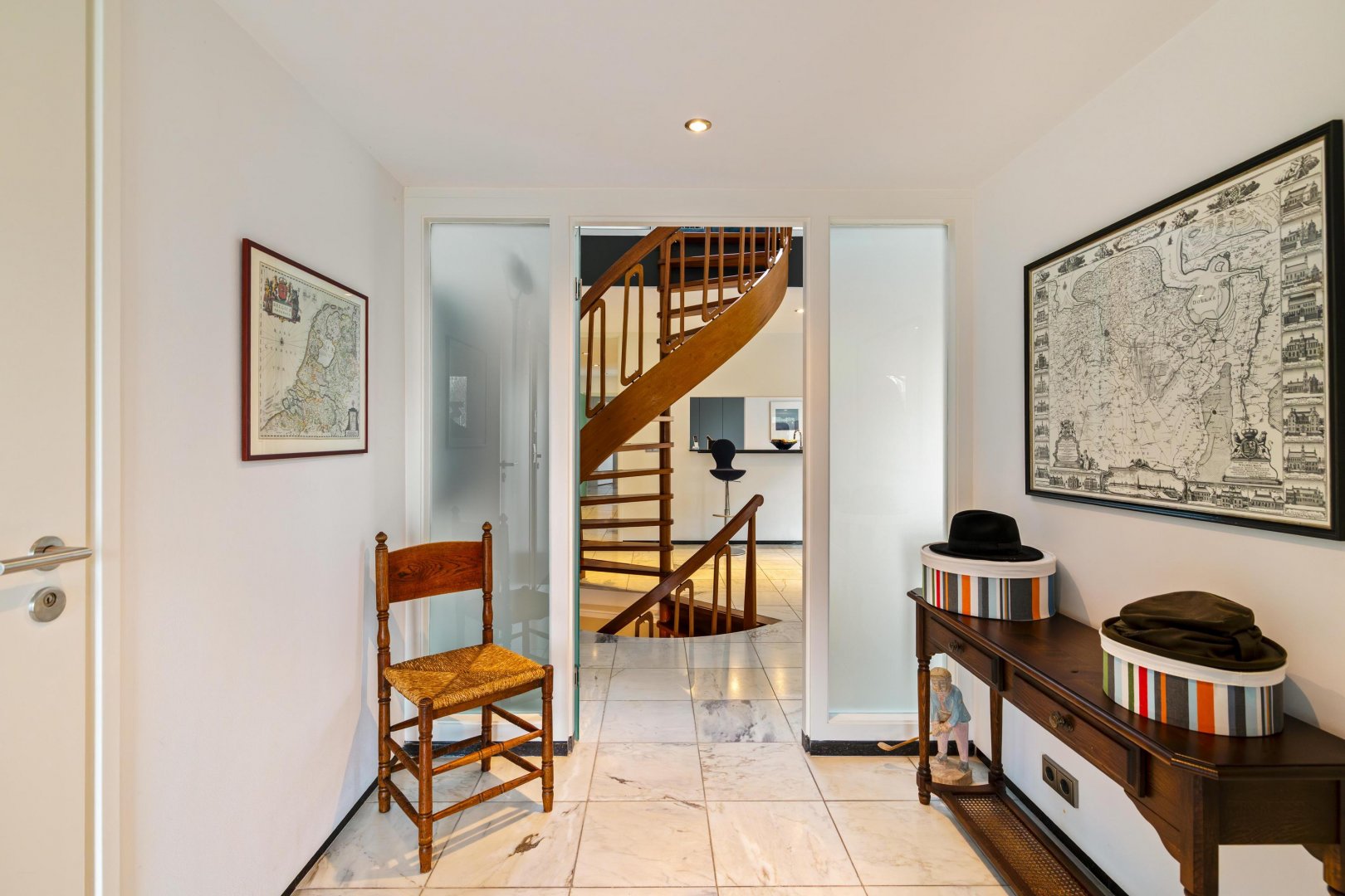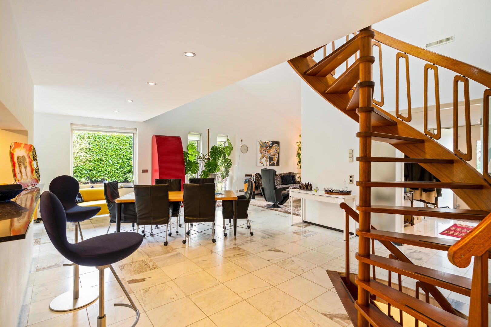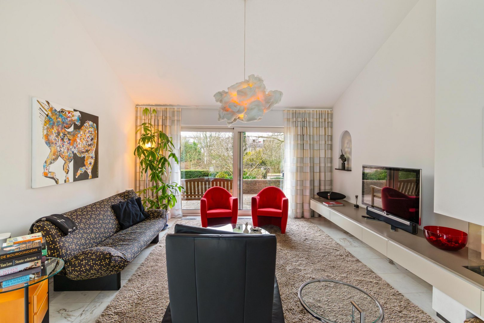 De ruime entree met garderobe geeft direct toegang tot de royale leefruimtes. De sfeervolle woonkamer met gashaard en fraaie natuurstenen vloer vormt samen met de halfopen keuken een indrukwekkende living van leefruimte van 72 m². Dankzij de grote raampartijen en hoge plafonds geniet u hier van veel licht en een prettig uitzicht op het omliggende groen.