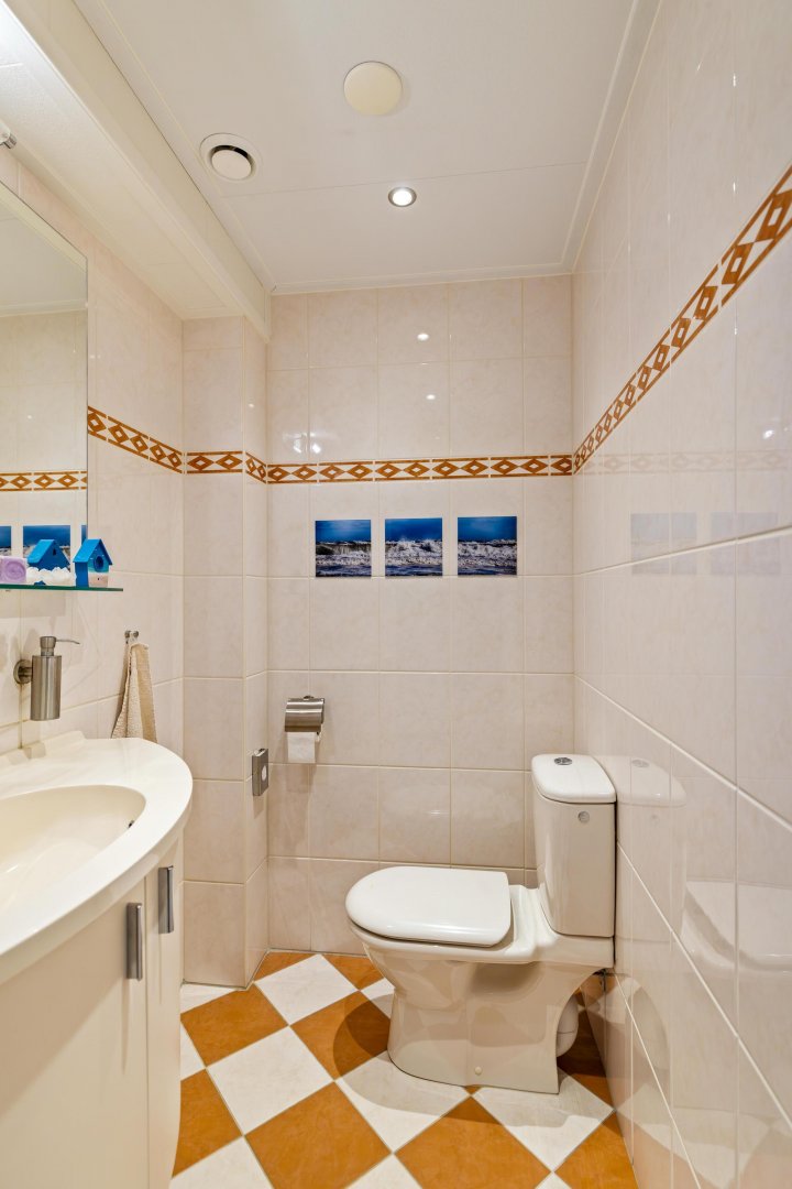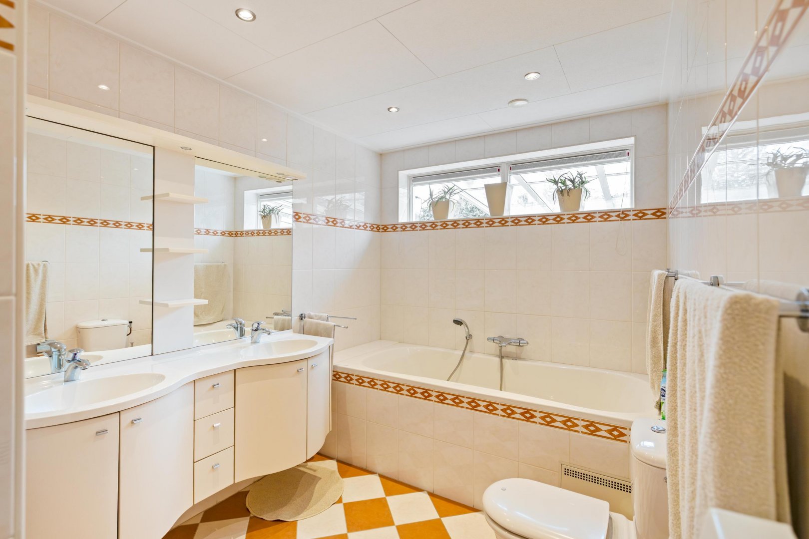 De begane grond beschikt bovendien over een ruime slaapkamer (17 m²) met garderoberuimte en een eigen badkamer met ligbad, inloopdouche, wastafelmeubel en toilet. Daarnaast zijn er nog twee slaapkamers van 10 en 14 m2. Beide slaapkamers hebben een eigen badkamer waarbij de slaapkamer op de voorzijde een kastwand heeft met daarachter de badkamer met inloopdouche, wastafelmeubel en toilet. De derde badkamer is zowel vanaf de zij – entree als een slaapkamer te bereiken en beschikt over een douche en wastafel. In de hal is nog een gastentoilet aanwezig. Dit maakt de woning uitstekend geschikt voor gelijkvloers wonen of een gastenverblijf.