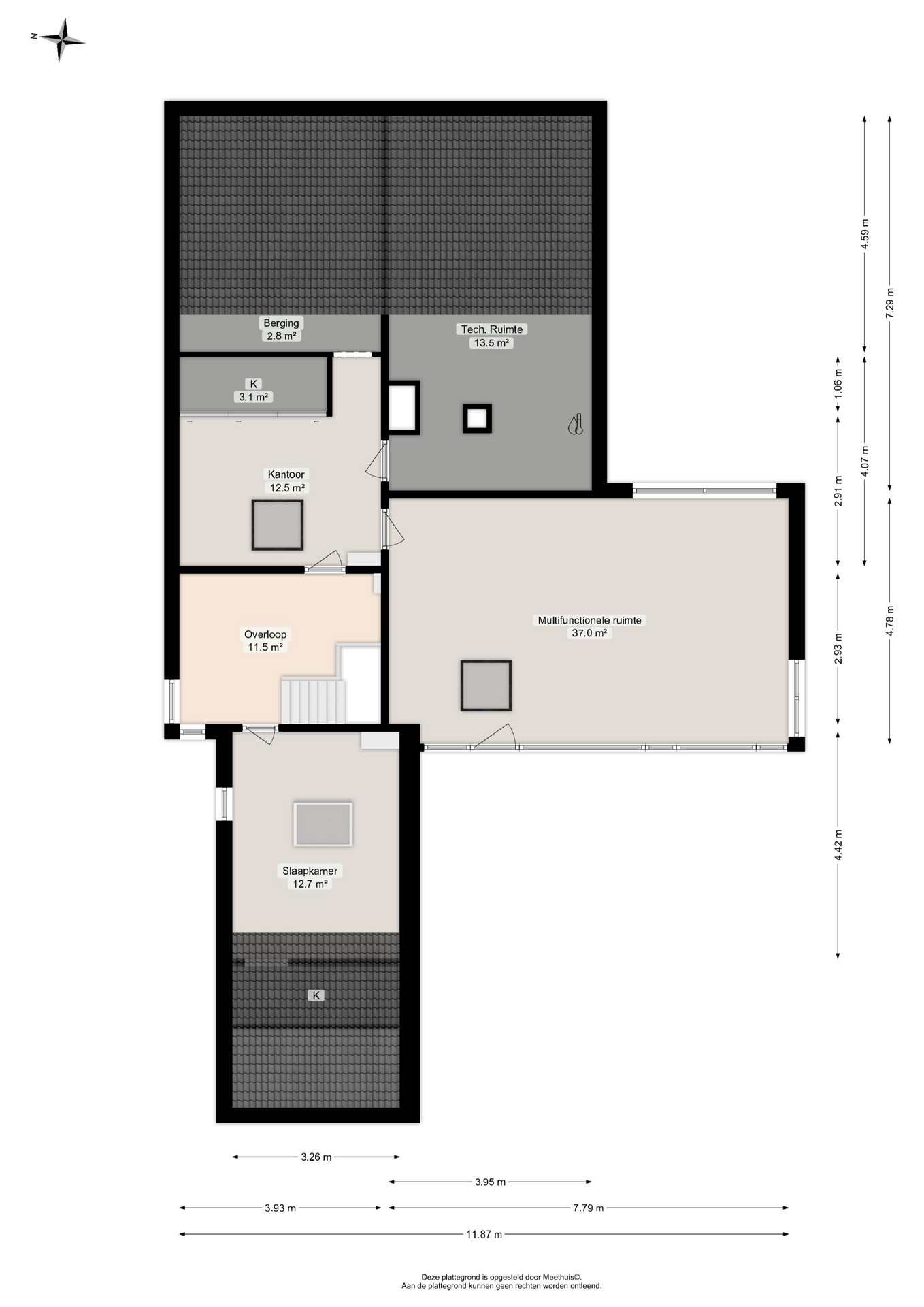 De zeer ruime multifunctionele ruimte van 37 m2 geeft deze verdieping een ruimtelijk en open karakter en biedt desgewenst ruimte voor extra slaapkamers. De ruimte is thans als werk – hobbyruimte in gebruik. De verdieping is zowel vanuit de woonkamer als de zij – entree te bereiken. Er is een ruime overloop met aansluitend een slaapkamer en een aparte werkkamer. Tevens zijn op de verdieping diverse praktische bergruimtes en de technische ruimte.