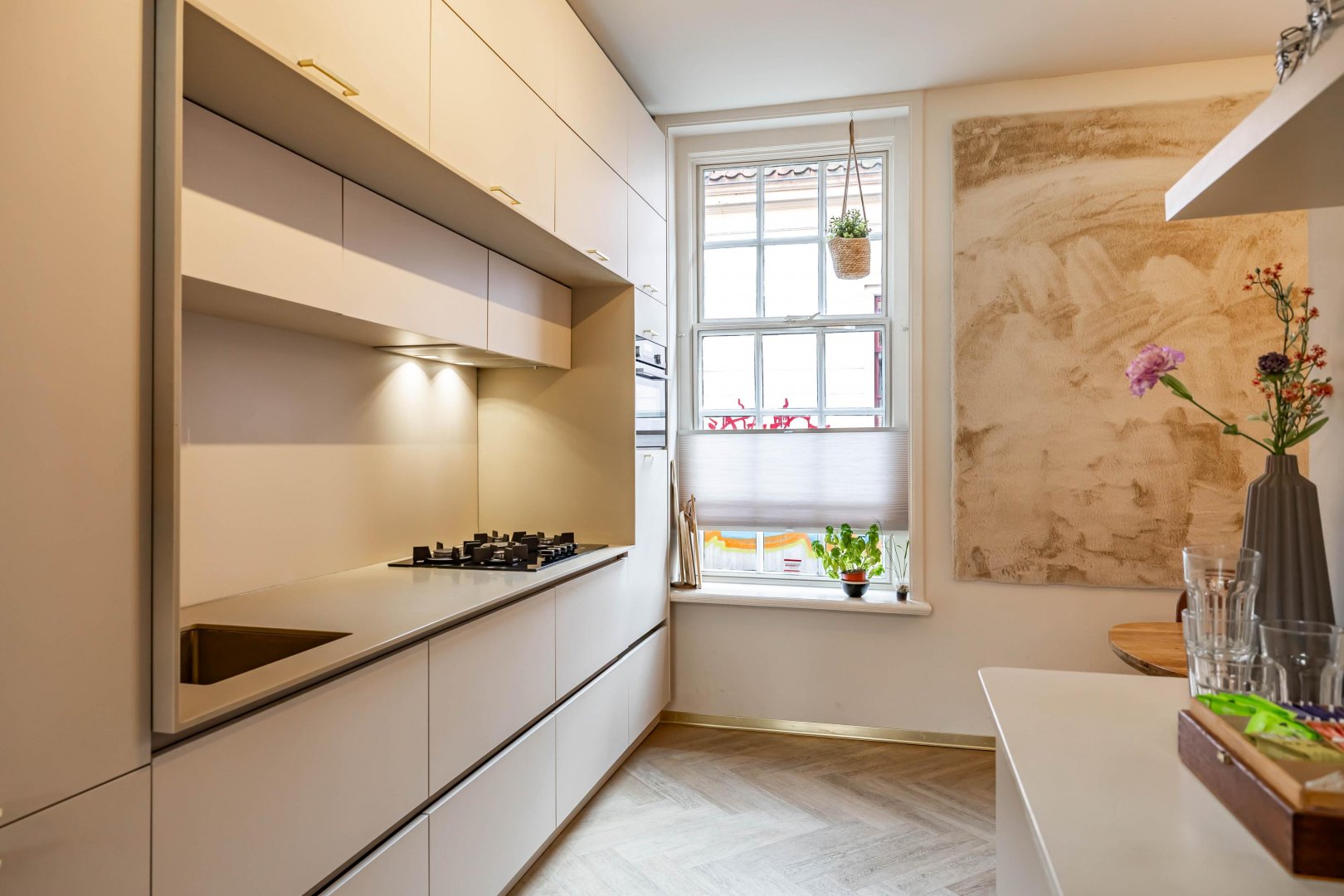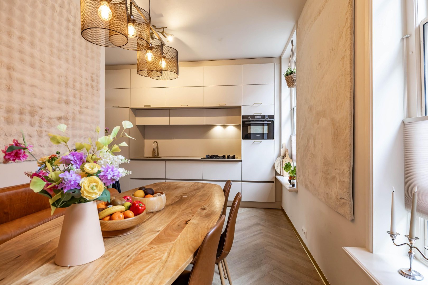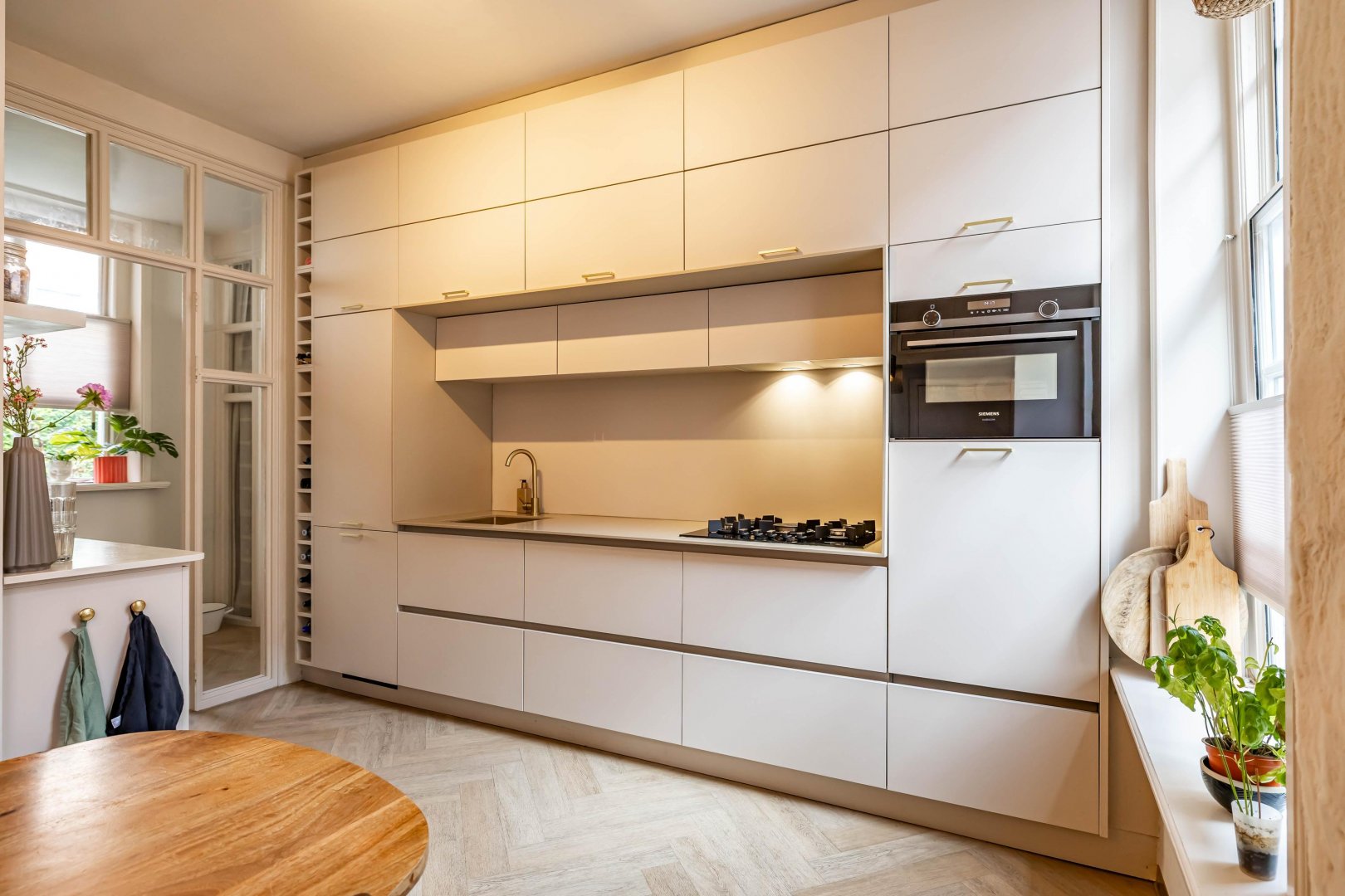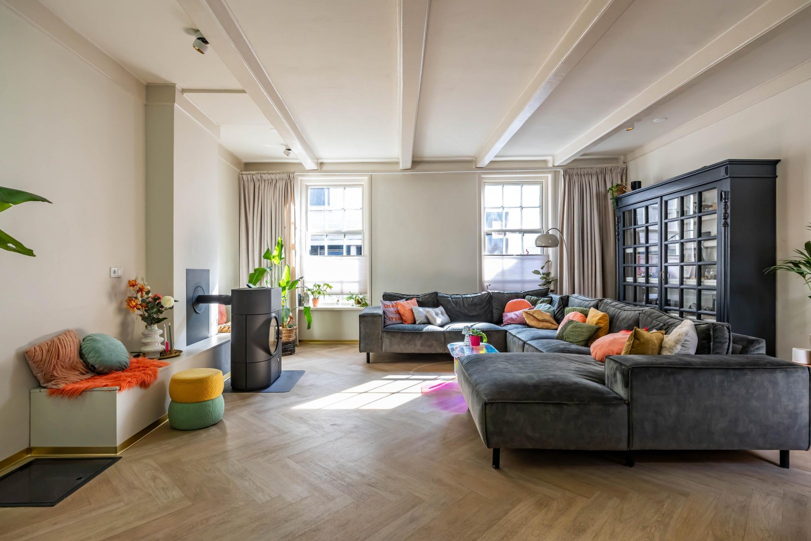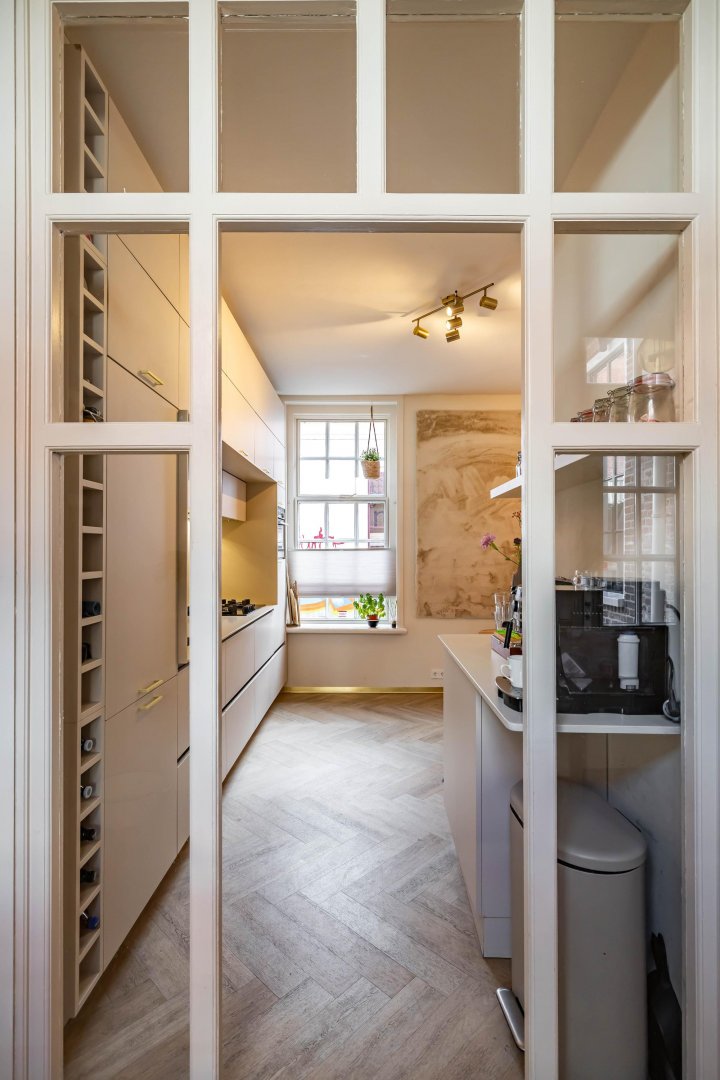 De neutrale visgraat PVC-vloer, de op maat gemaakte kasten, messing plinten & deurbeslag en de traditionele indeling maken het een waar stadsjuweel. De ruime woonkamer met hoge plafonds met monumentale balken heeft een fraaie zithoek rondom de pellet kachel en een glazen luik naar de wijnkelder. De luxe woonkeuken is voorzien inbouwapparatuur, een vaste bergkast en een royale eethoek.