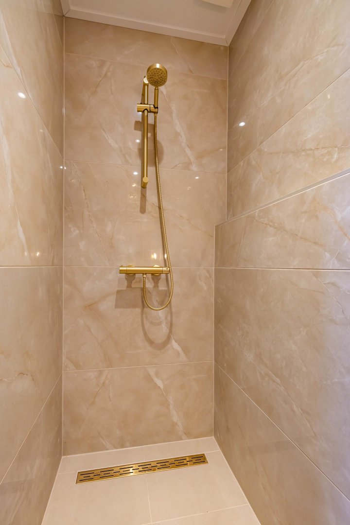 De parterre is levensloopbestendig ingedeeld. De master bedroom is hier gesitueerd met een badkamer en suite met een inloopdouche, wastafel en een nis met kaptafel. De werkkamer is via 1 trede bereikbaar en voorzien van een pellet kachel.