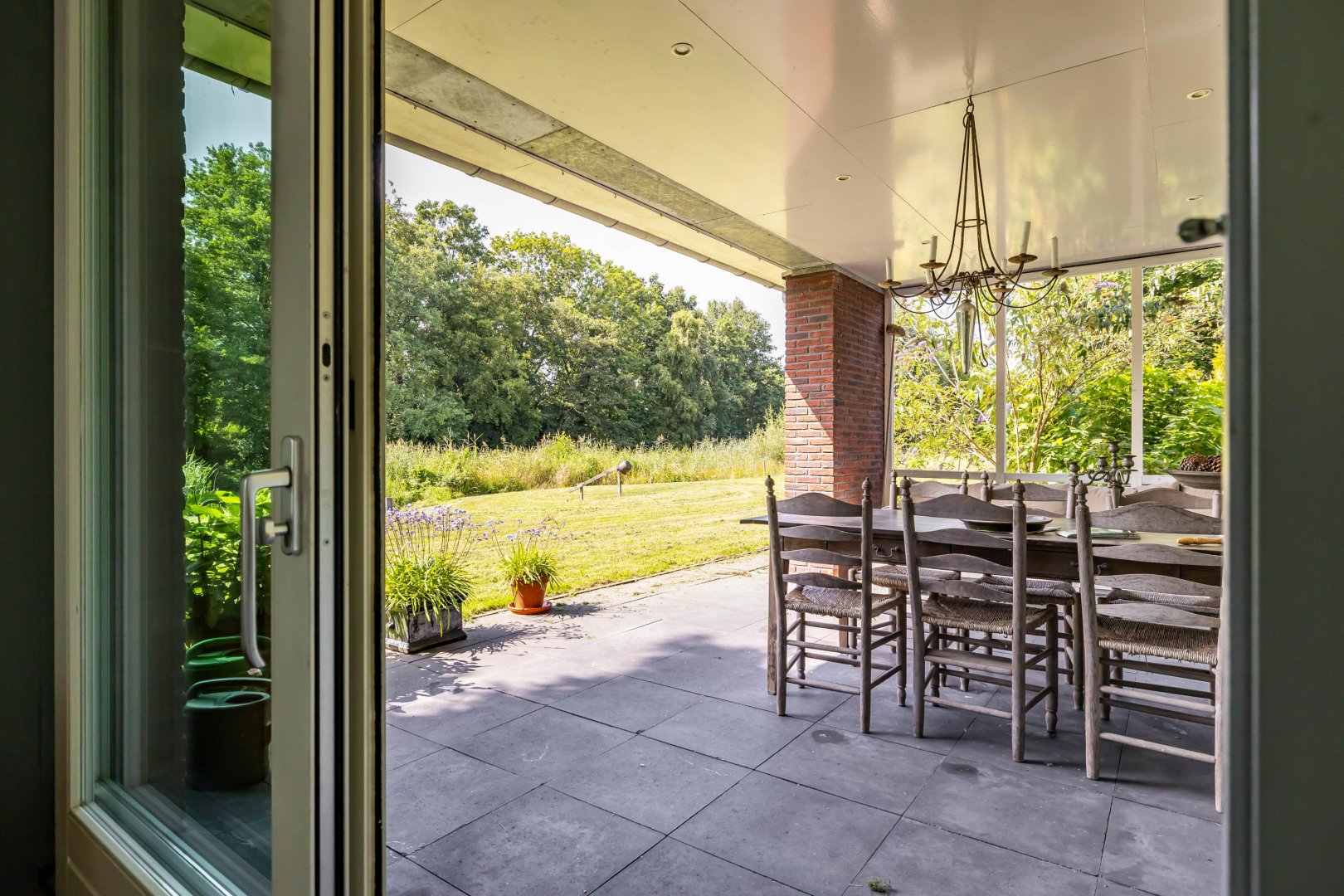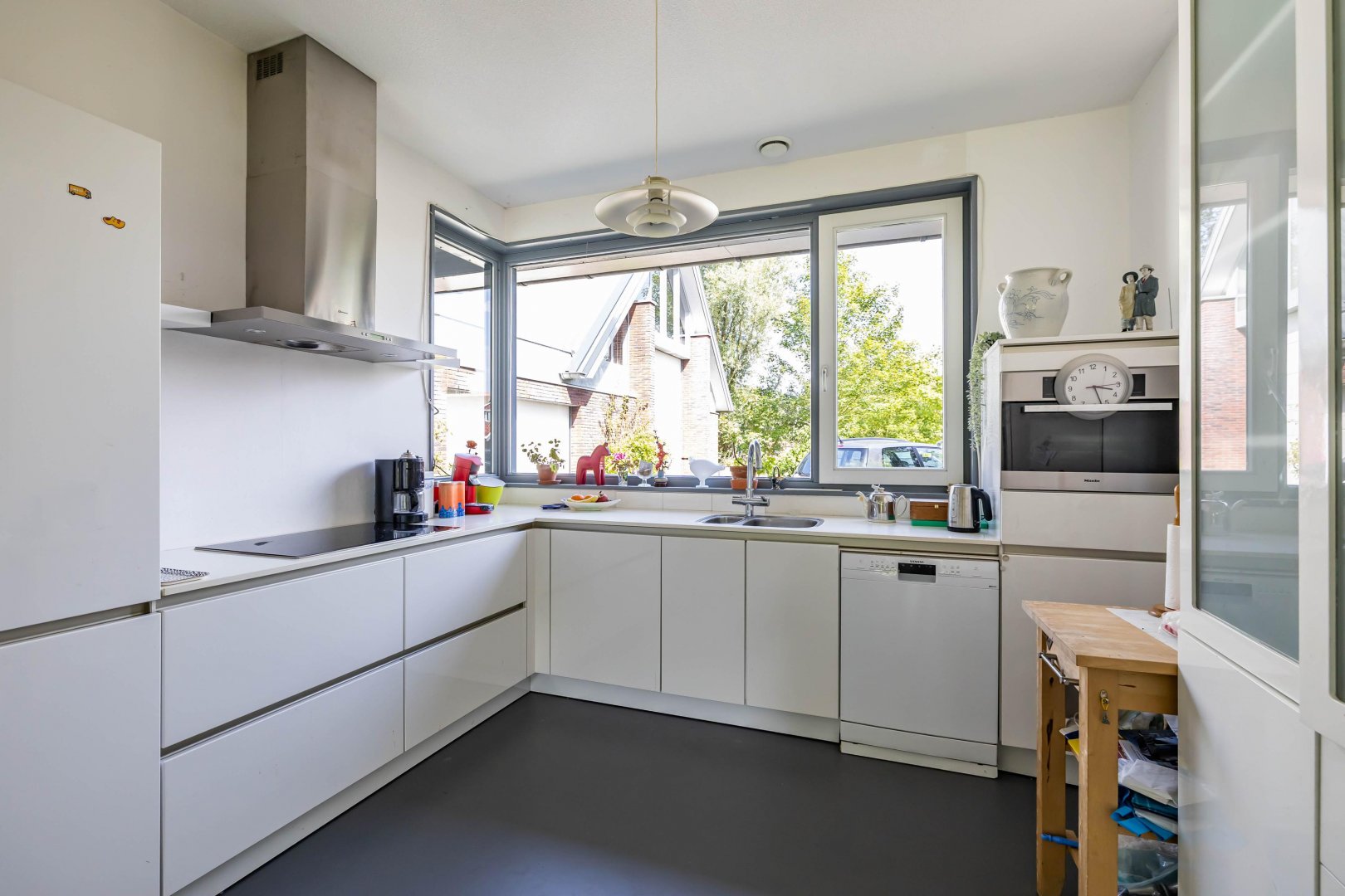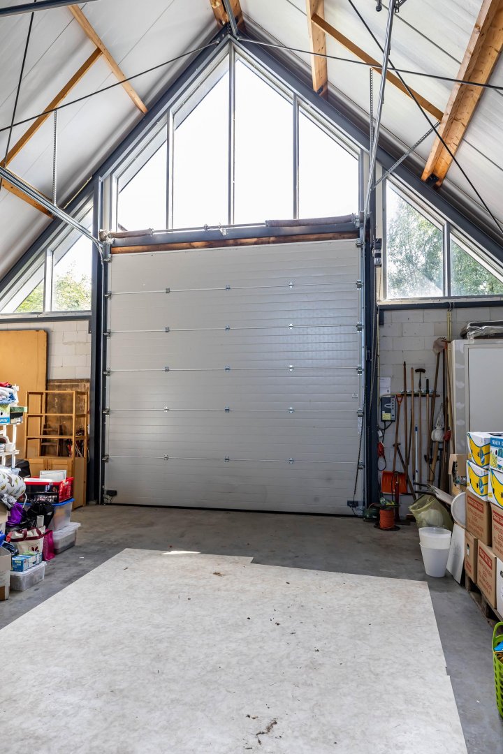 Vanuit de hal is de bijkeuken te bereiken met deur naar de achtertuin. De aangrenzende garage vormt de verbinding met de schuur – loods.