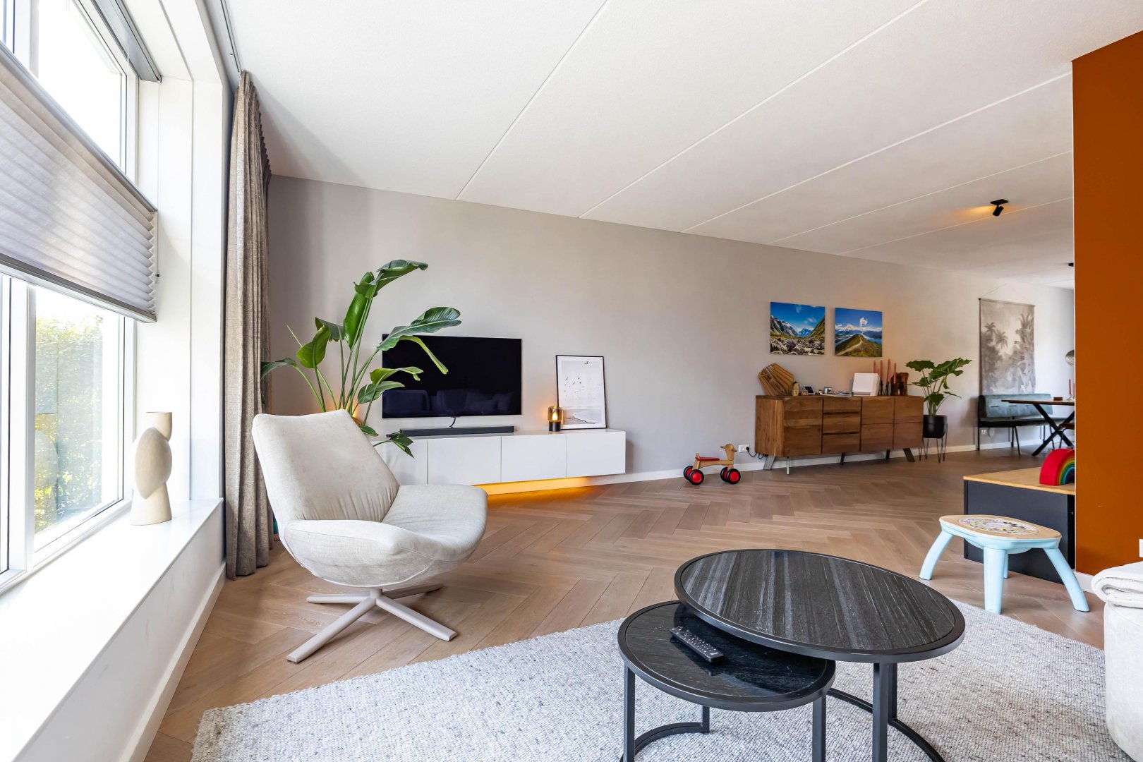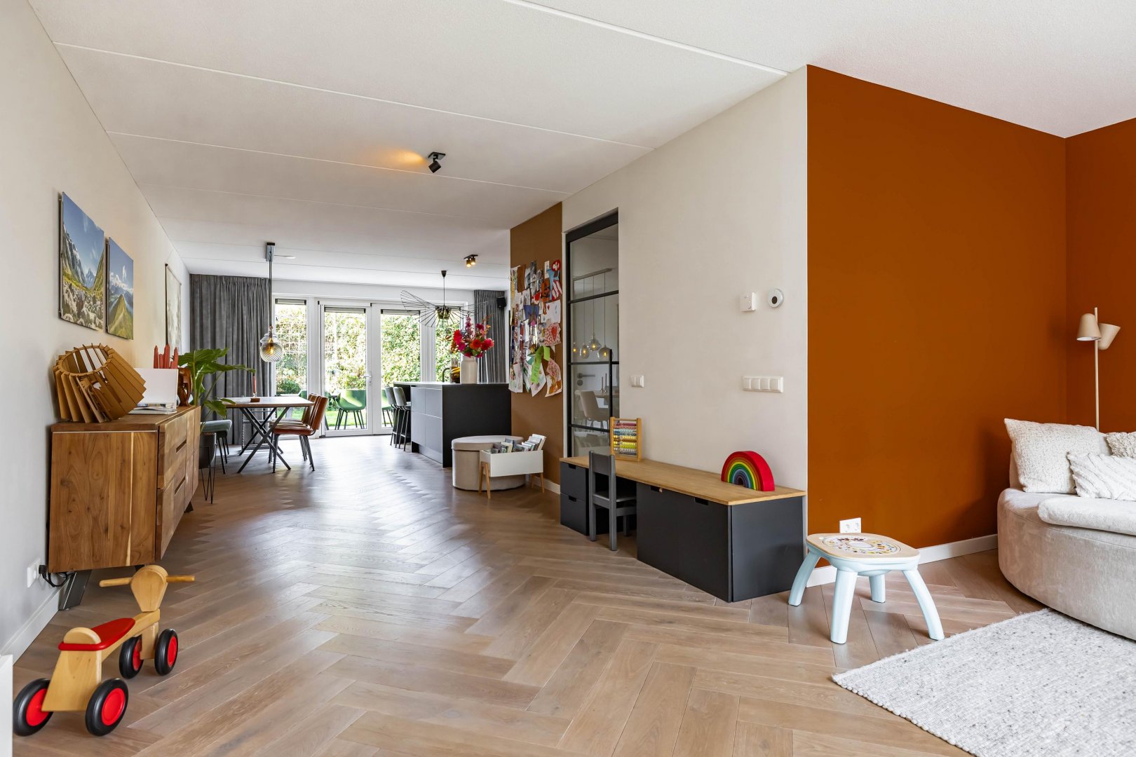 Bij binnenkomst komt u in de entreehal met garderobe, een modern toilet, de meterkast en de trapopgang naar de eerste verdieping. Vanuit de hal bereikt u de royale woonkamer. De living is licht en ruim opgezet en vormt samen met de keuken een heerlijk leefgedeelte voor het hele gezin. De begane grond is voorzien van een fraaie houten parketvloer (voorzien van vloerverwarming), die zorgt voor een warme en stijlvolle uitstraling.
