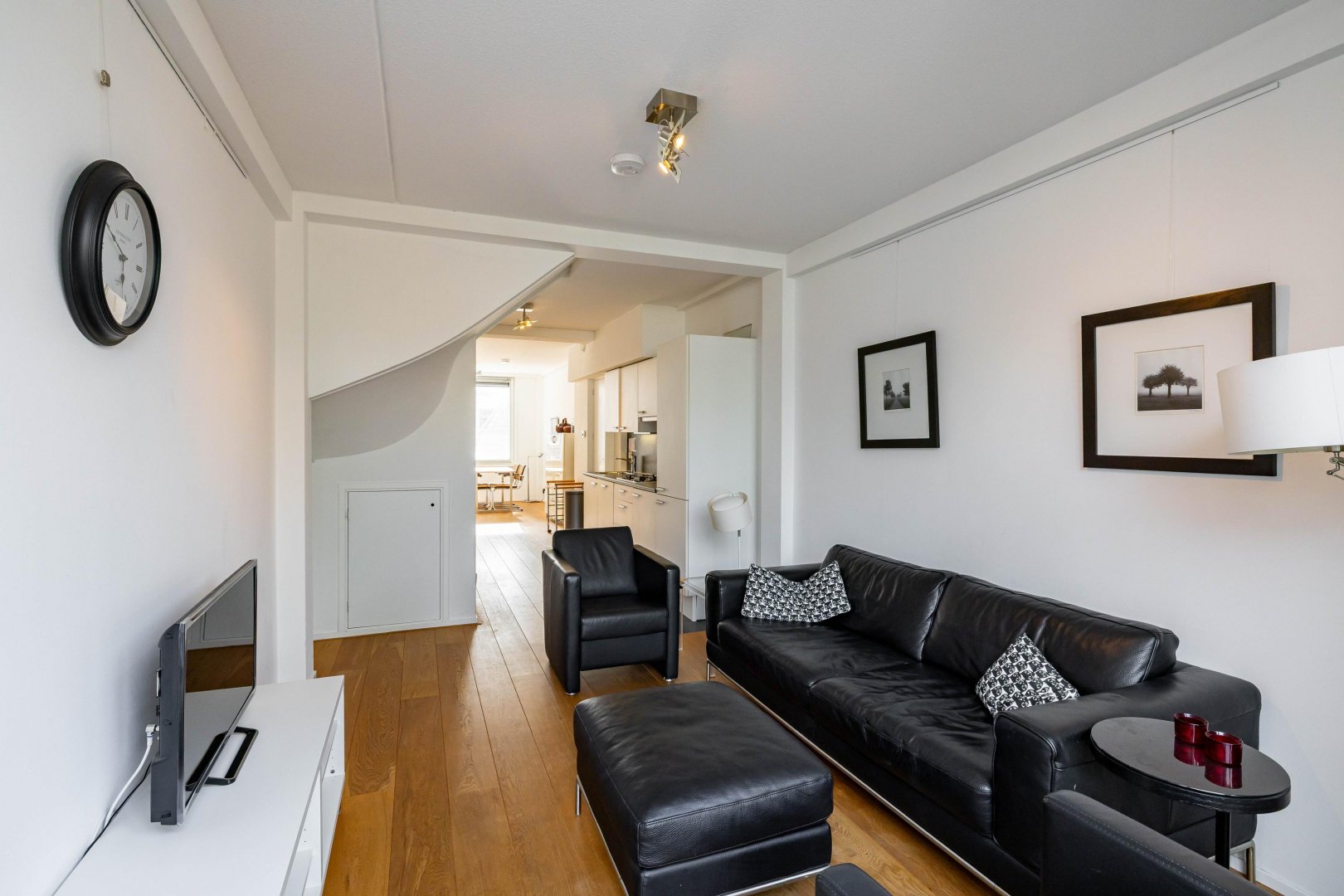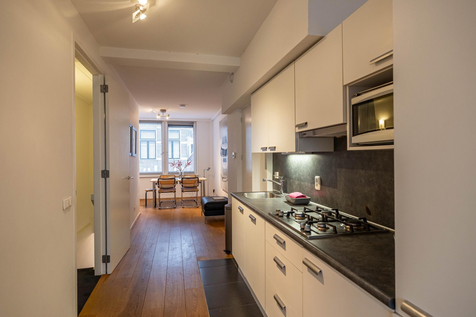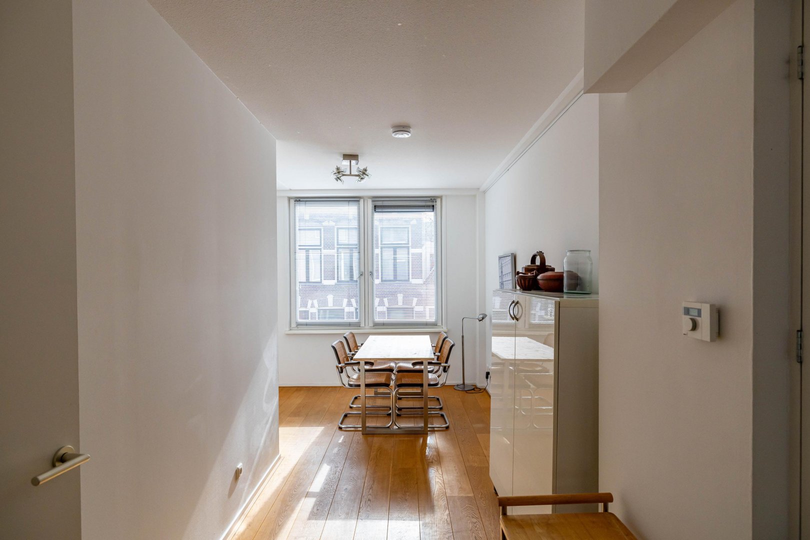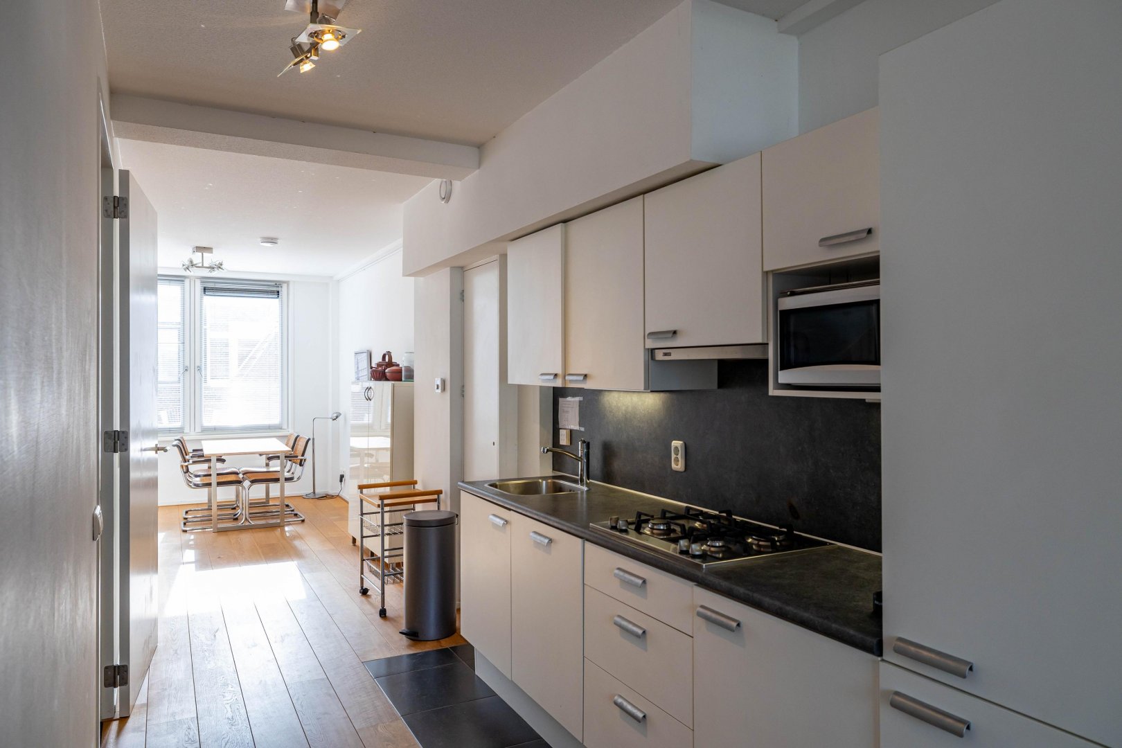 Op de 1e etage bevindt zich de speelse woonkamer met een voor- en achterkamer. De moderne keuken is in het midden van deze twee ruimtes geplaatst en is in lichte kleurstelling uitgevoerd. Aan de achterzijde van de zit- dan wel eetkeuken is er een fijn balkon dat weids uitzicht biedt op de tuin van een aangelegen hofje.