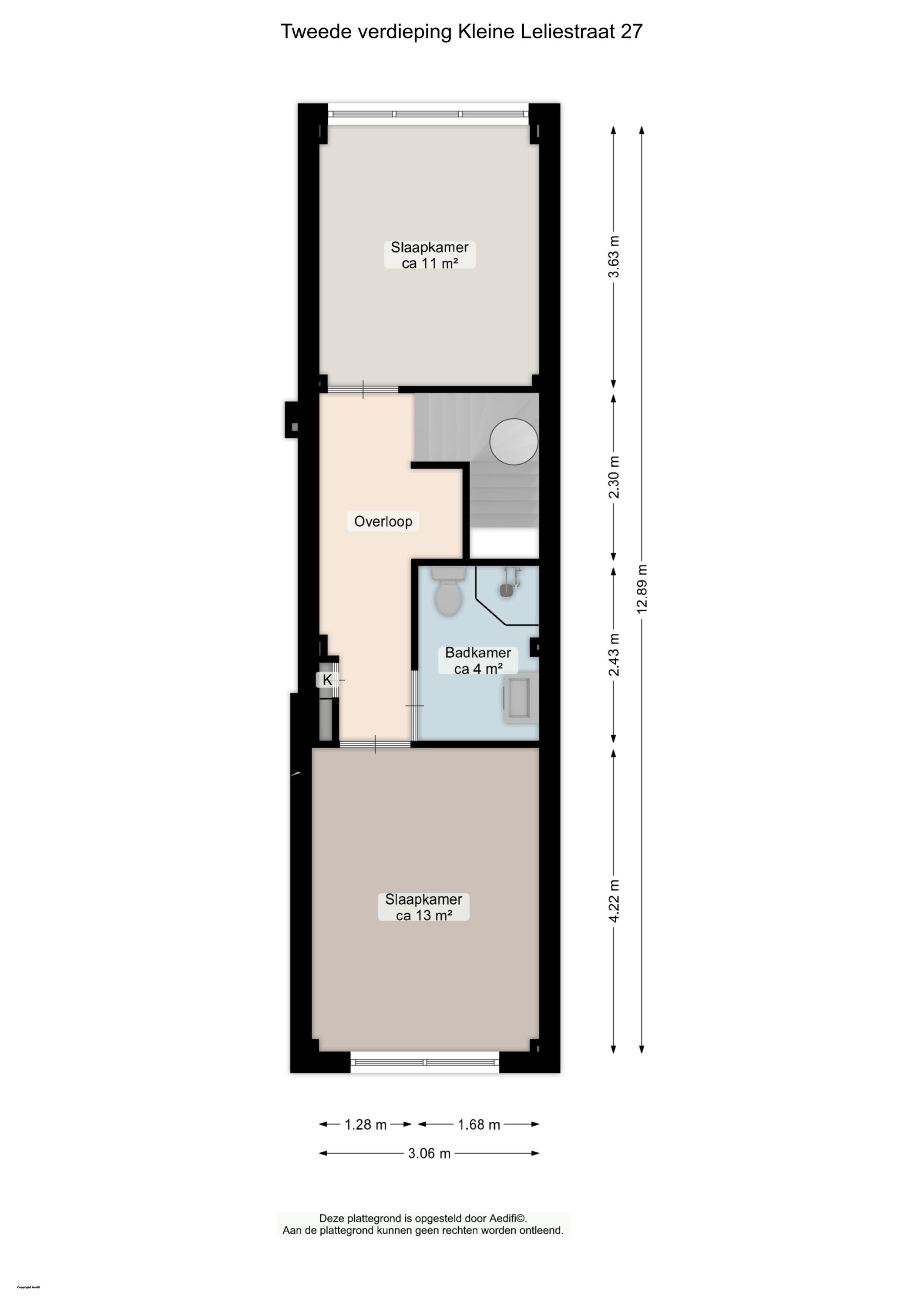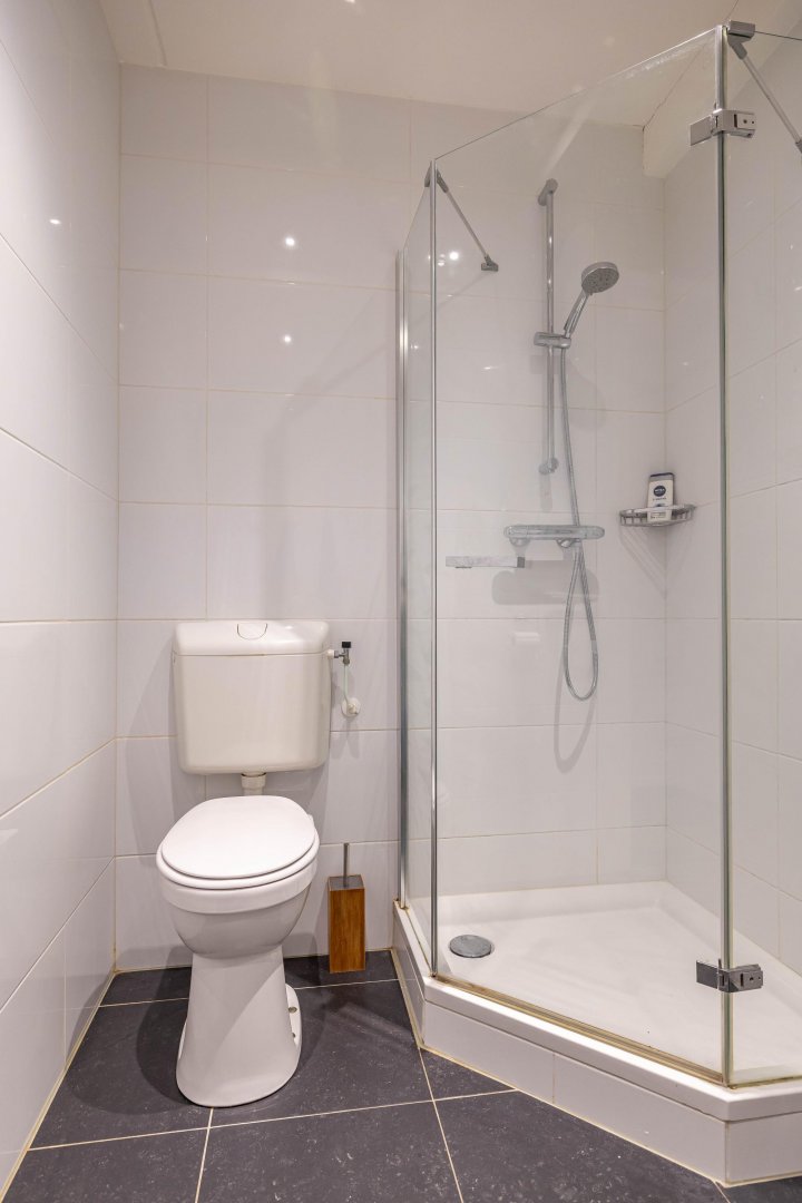 Op de 2e etage bevinden zich twee royale slaapkamers met daartussen een keurige badkamer voorzien van toilet, douche en wastafel. Ook de verdiepingsvloeren zijn van beton. Op de overloop is er kastruimte en een ruimte voor de CV combi ketel (2010).