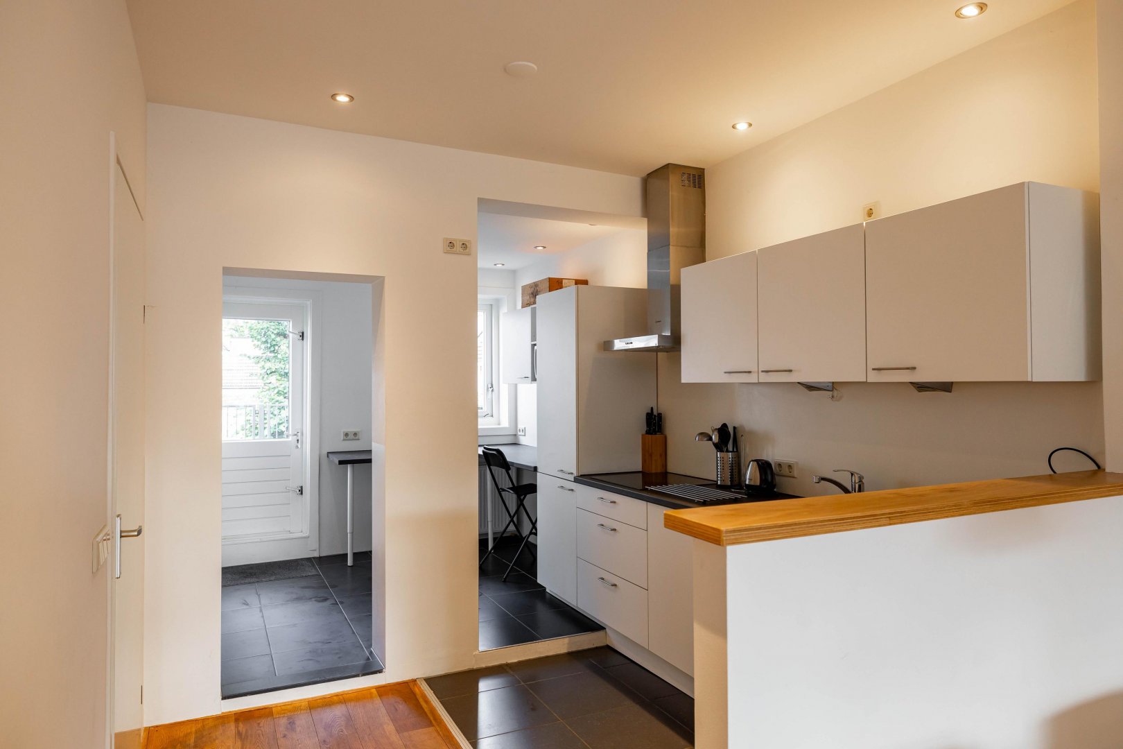 Entree op de begane grond, gang en trap naar 1e etage. Dit lichte appartement heeft de prettige woonkamer aan de voorzijde (zuidzijde). De moderne keuken is in lichte kleurstelling uitgevoerd en bevindt zich aan de achterzijde van deze verdieping. Eveneens is aan de achterzijde een toiletruimte en ruimte voor wasmachine, droger en CV combi ketel (2018). Direct grenzend aan de keuken is er een leuk terras van circa 8 m2 op het noordwesten. Het terras biedt uitzicht op de mooie tuin van een aangelegen hofje.