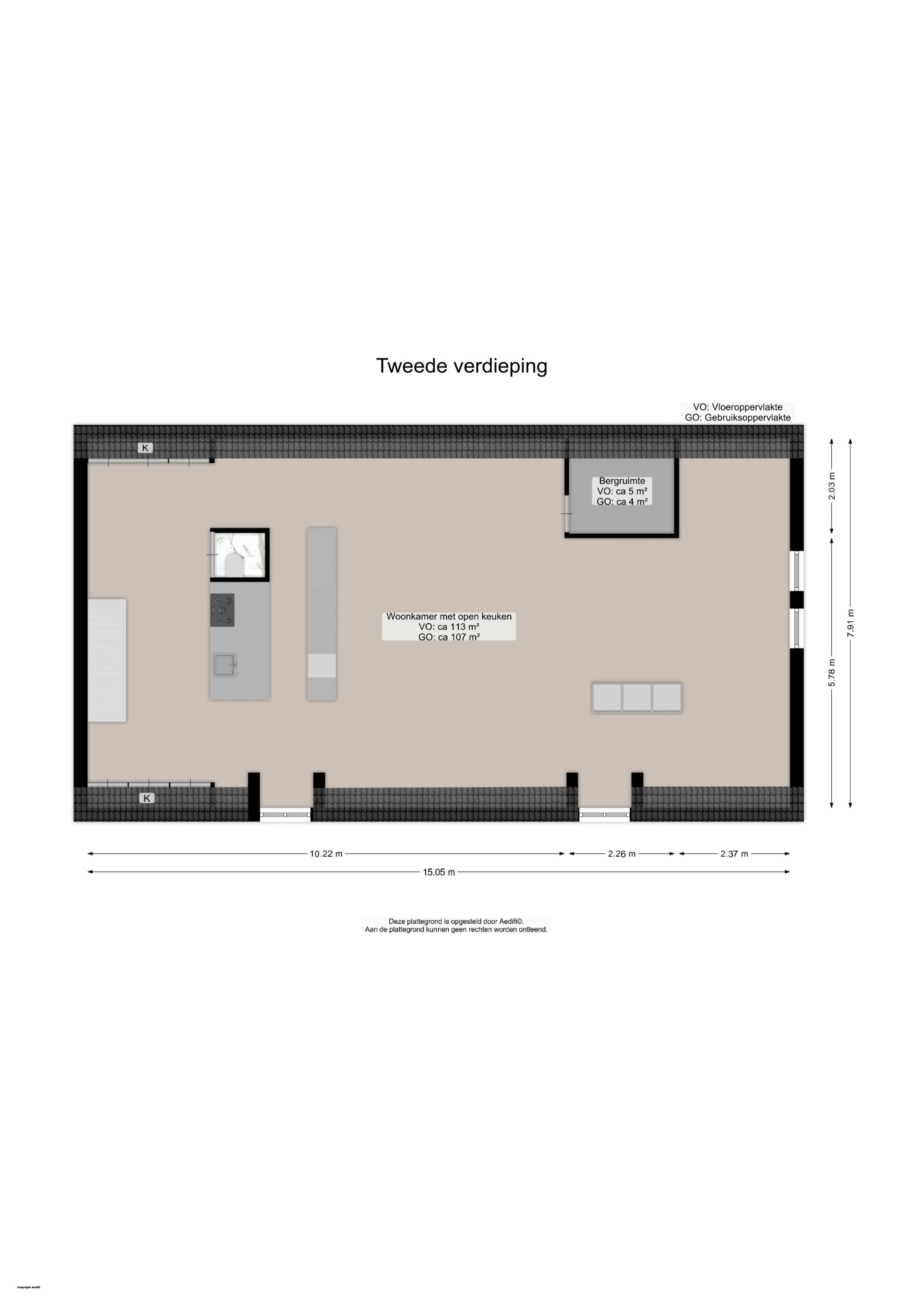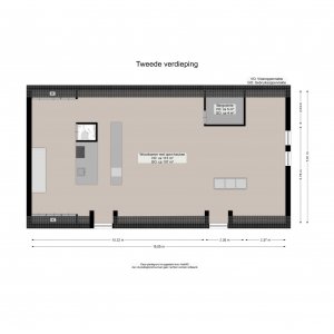 Tweede verdieping: loft (woonkamer en open keuken) van ruim 100 m2! Geweldige etage met een nokhoogte van 5 meter en prachtig de fraaie kapconstructie in het zicht. Zeer licht door vele dakraampartijen. Luxe keuken (Gaggenau) met dubbel blok en inbouwapparatuur. Op deze verdieping ook een toilet en berging/inloopkast
