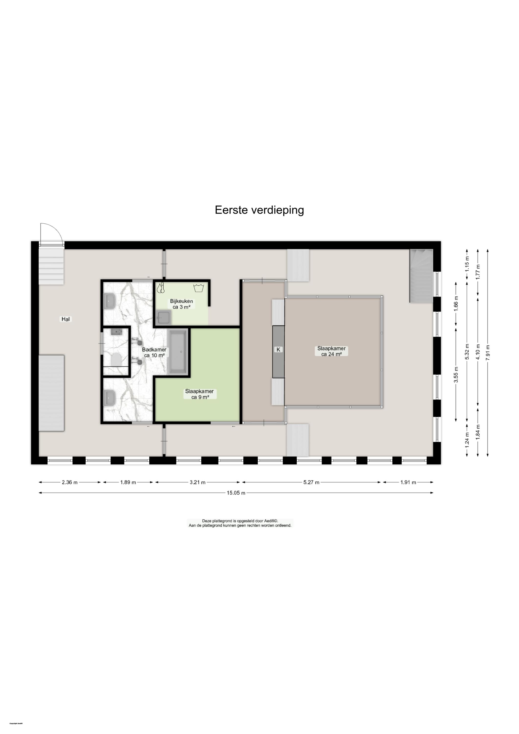 Eerste verdieping: hal, toilet, slaapkamer, werkruimte, logeerkamer, badkamer en cv/wasruimte. Bijzonder fraai en symmetrisch ingericht, met de vertrekken aan de binnenkant en verkeersruimte en werkruimte aan de gevelzijde.