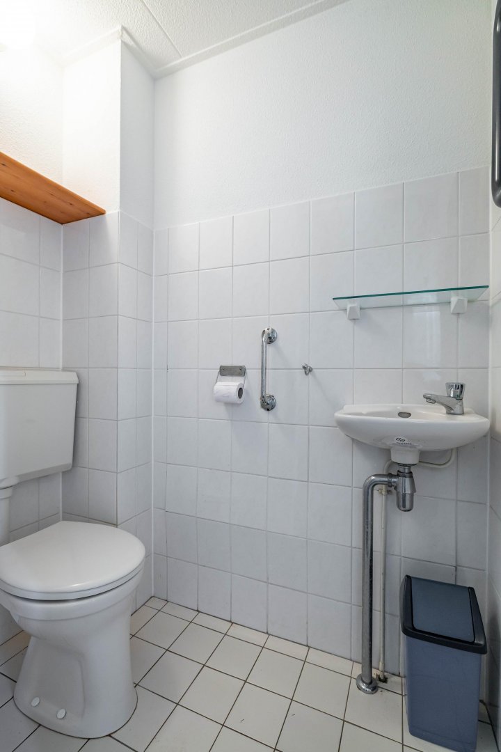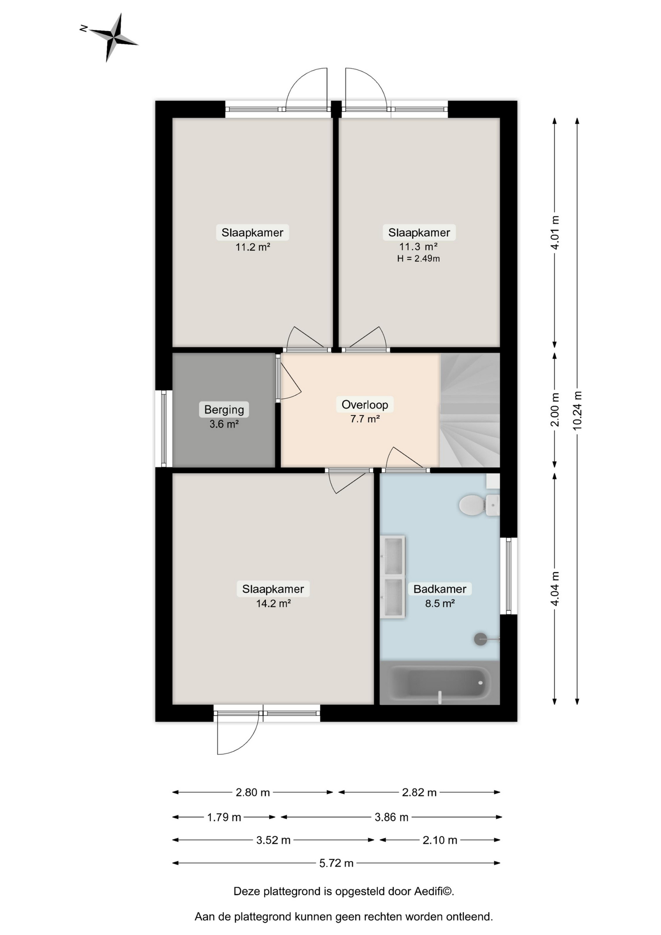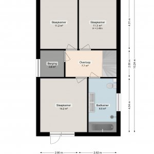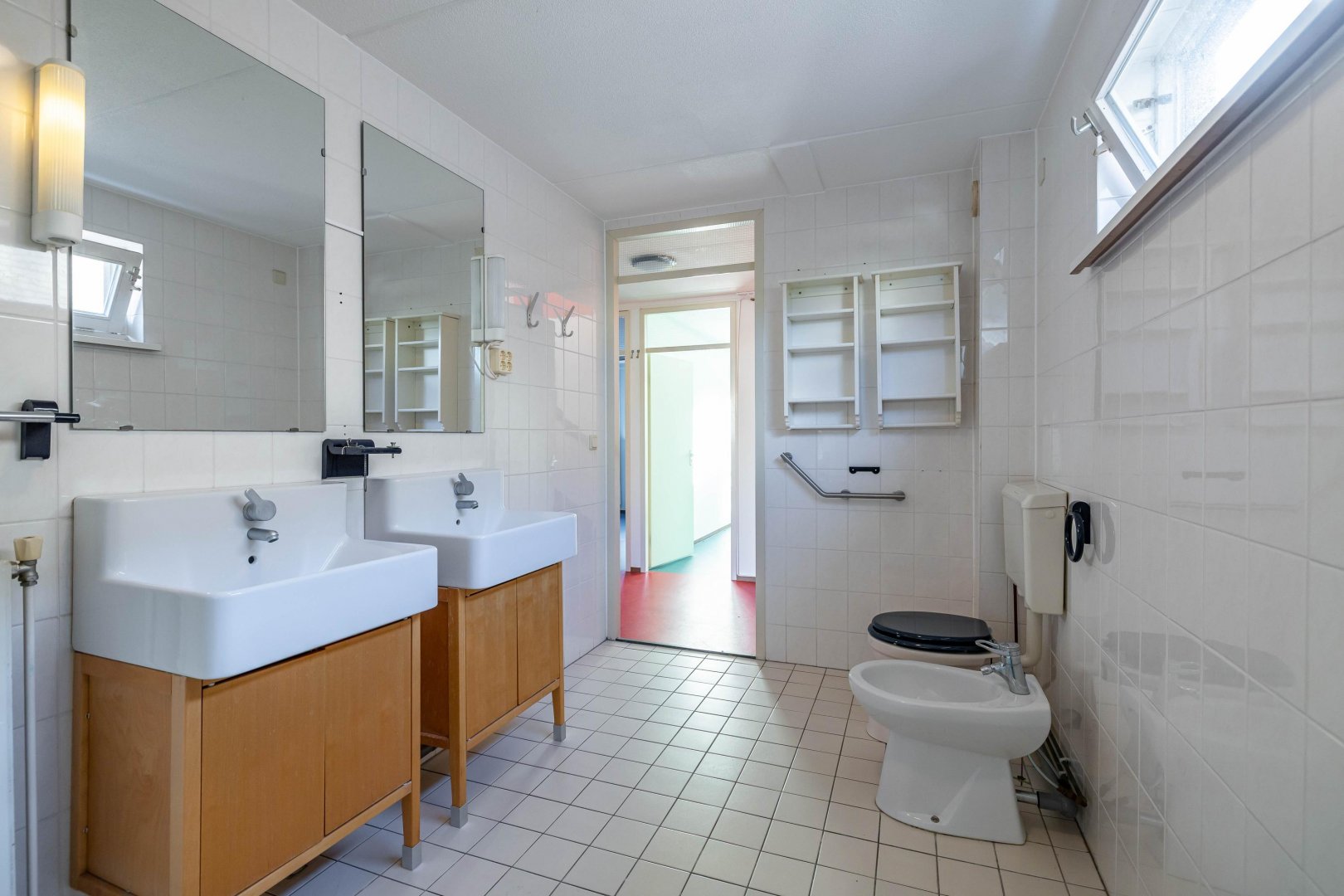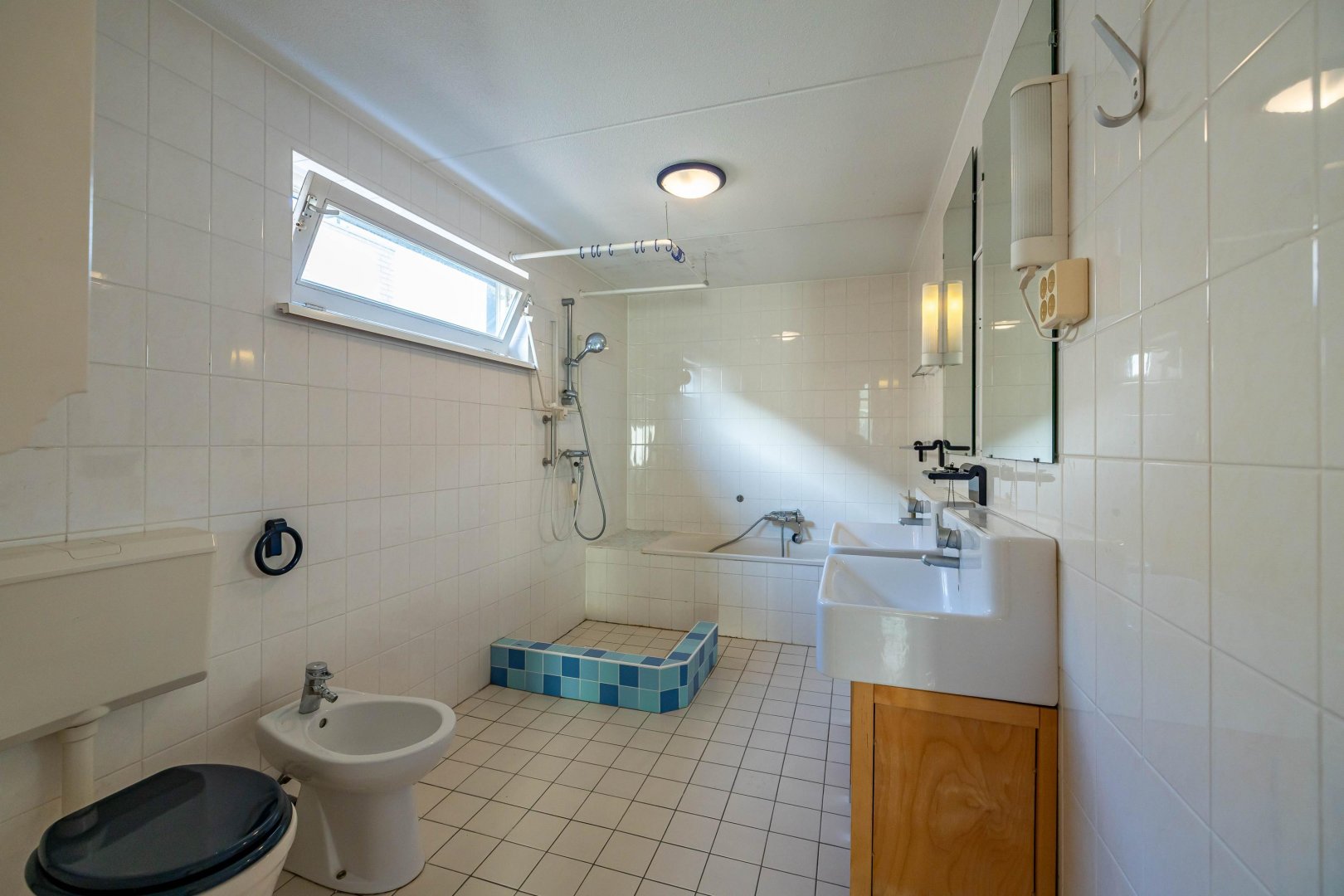 Eerste verdieping: overloop, drie slaapkamers resp. circa 14, 11 en 11 m², ruime badkamer met tweede toilet, bidet douche, dubbele wastafel en ligbad. Extra op deze verdieping: een kleine kastenkamer of berging.