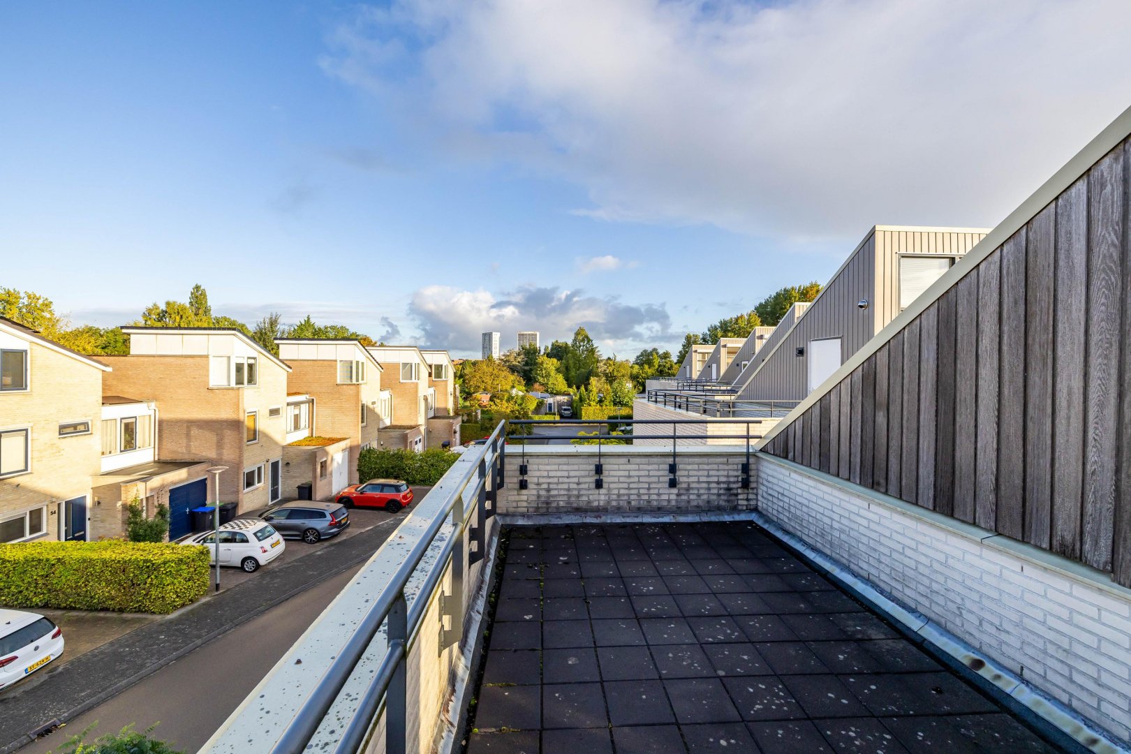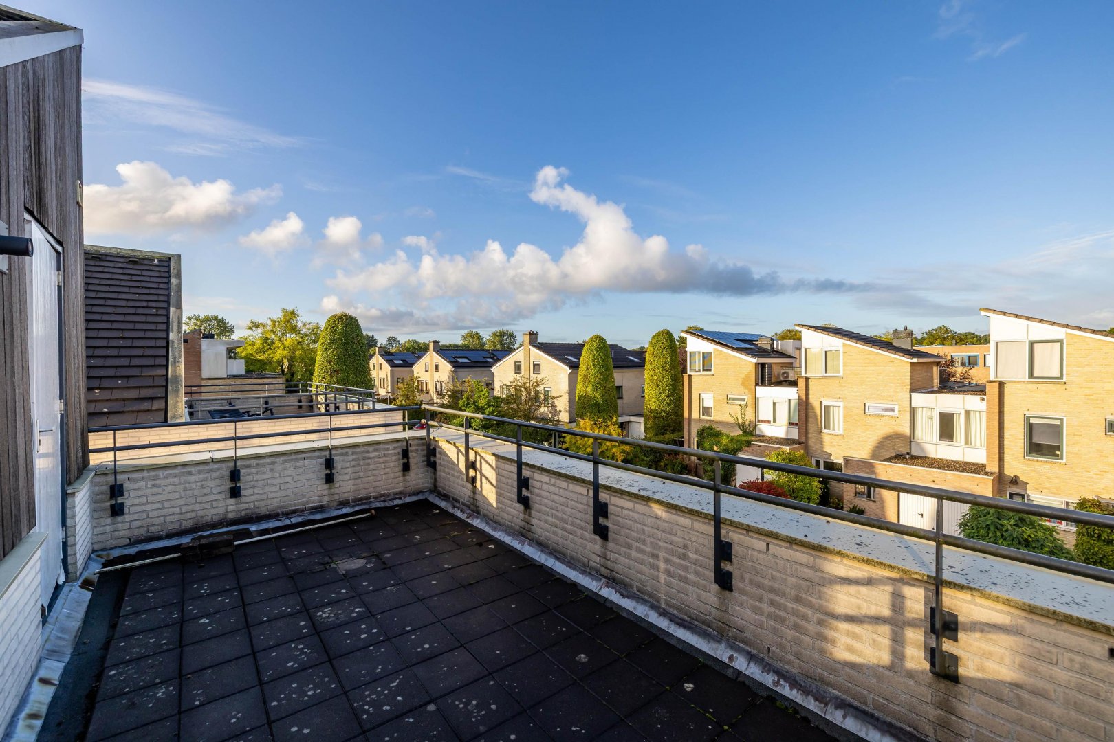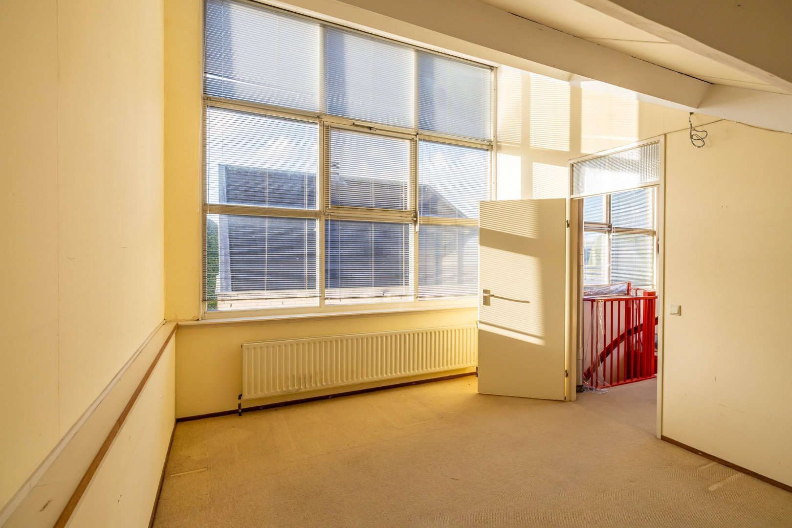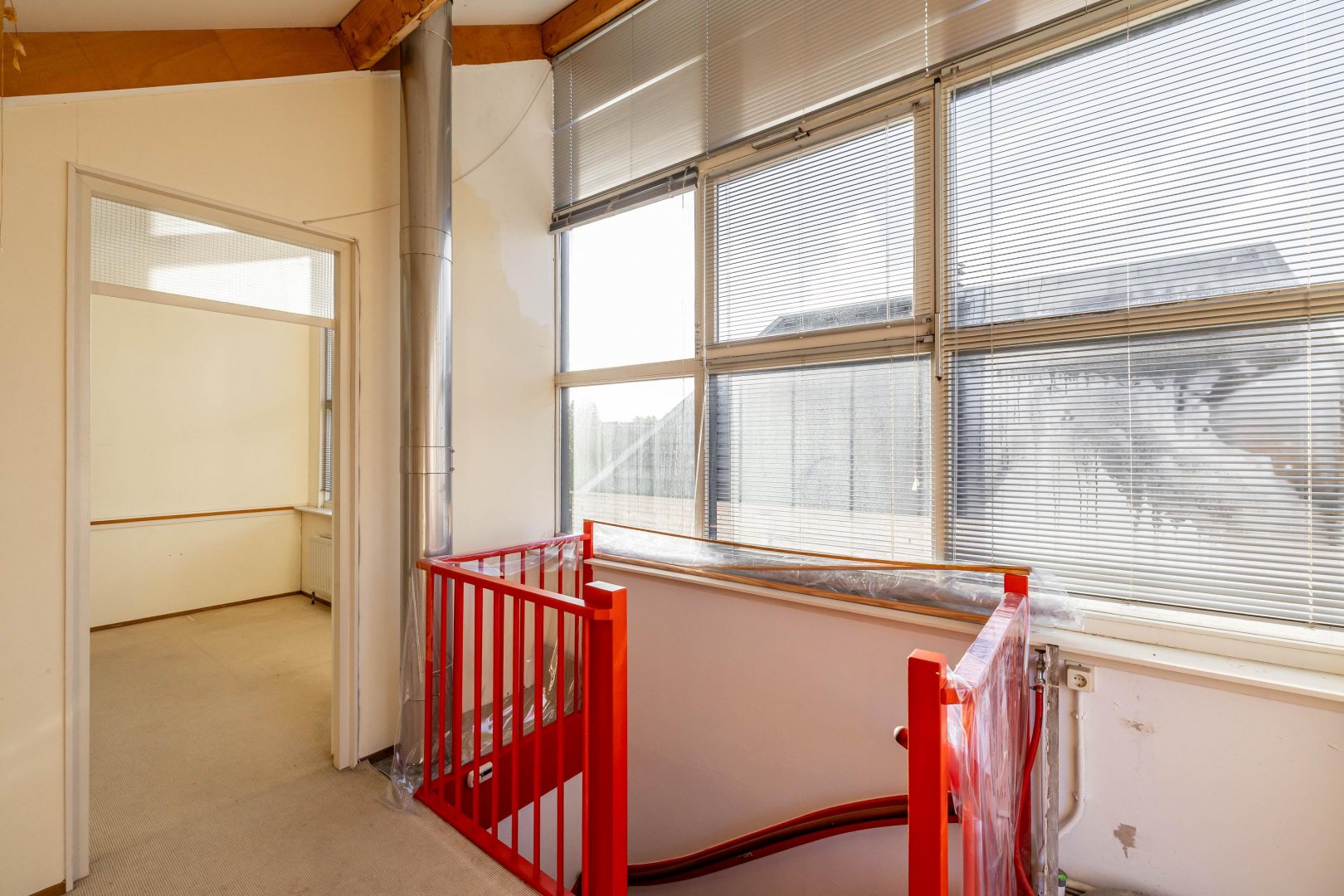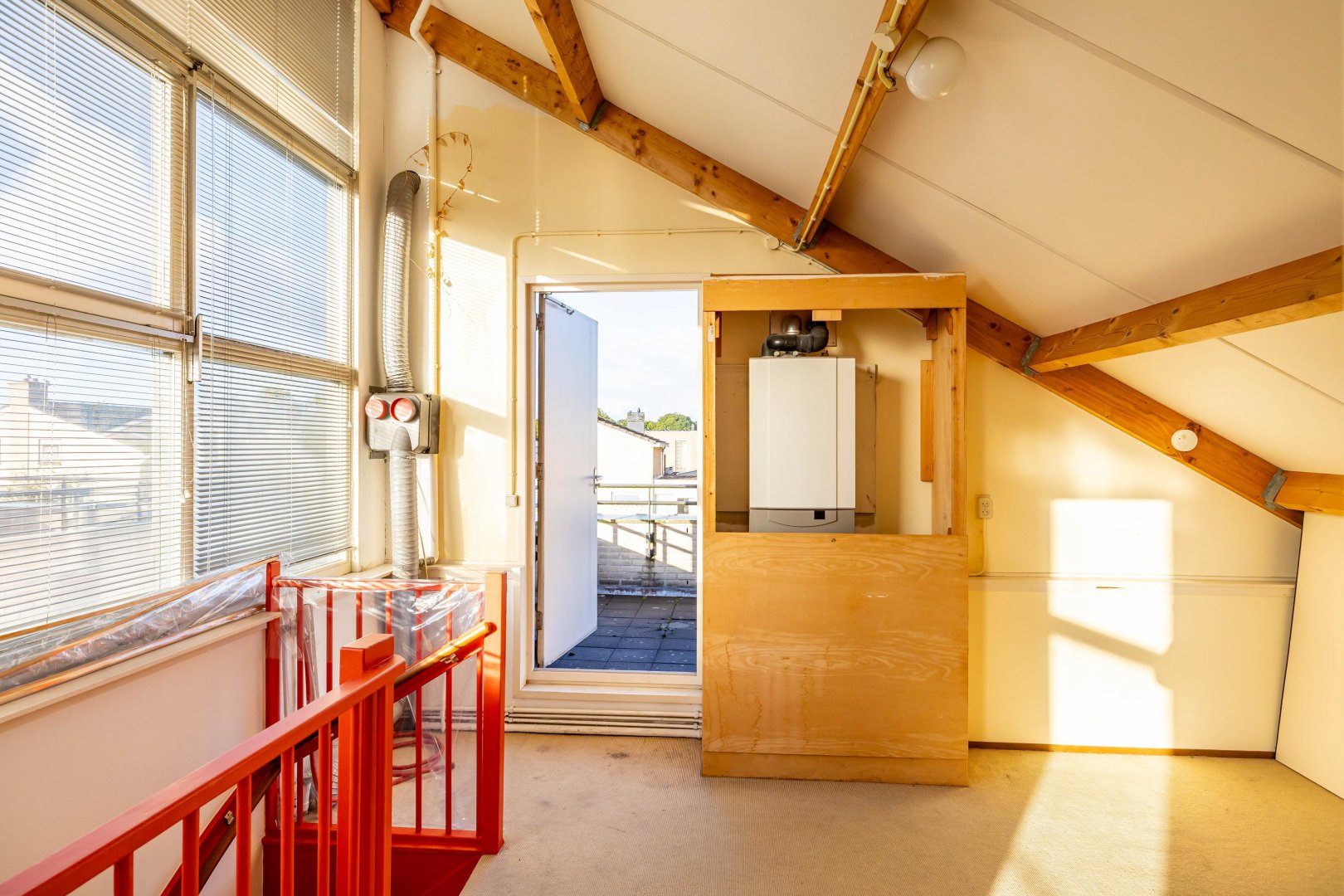 Tweede verdieping: lichte, hoge en grote overloop met de mogelijkheid voor een werkplek of bergruimte. Een vierde grote slaap/werkkamer (16m²) onder de schuine kap. Via de overloop een ruim balkon/dakterras bereikbaar aan de voorzijde (Zuidwest).