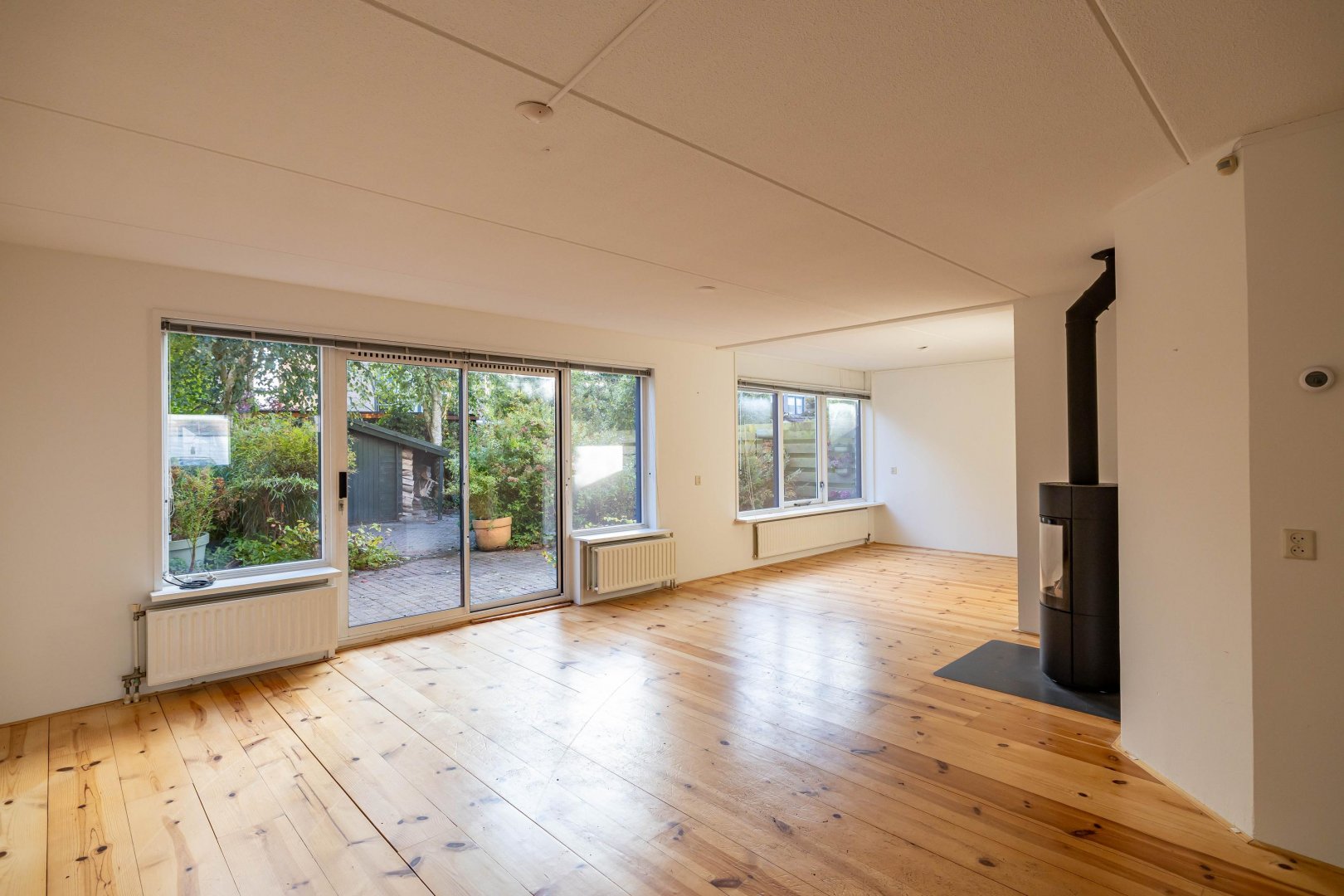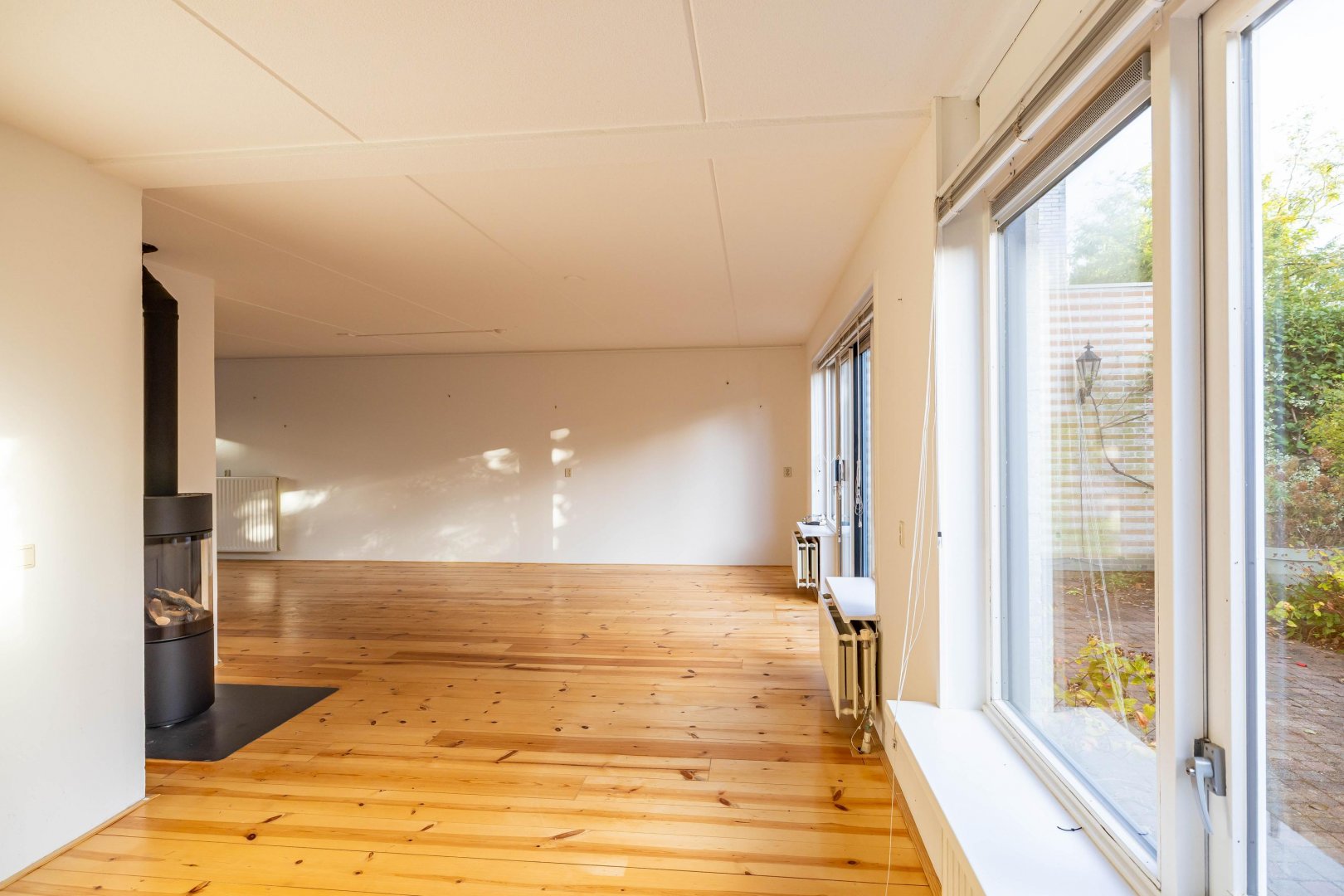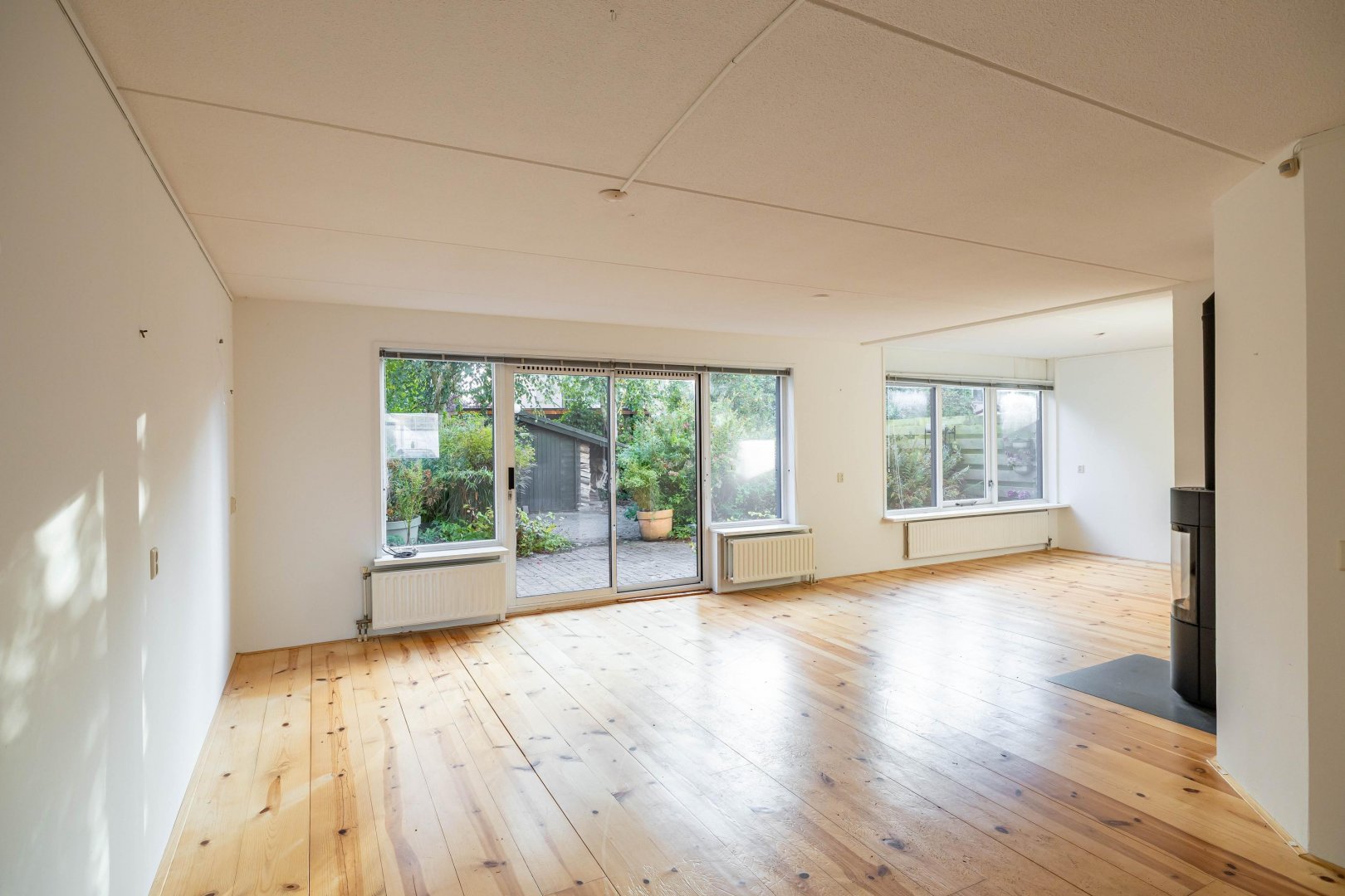 Ruime woonkamer, tuingericht in L-vorm (54m²) met aan de voorzijde van het huis de halfopen keuken. De woonkamer is voorzien van een houten planenvloer en schuifpui naar de tuin.