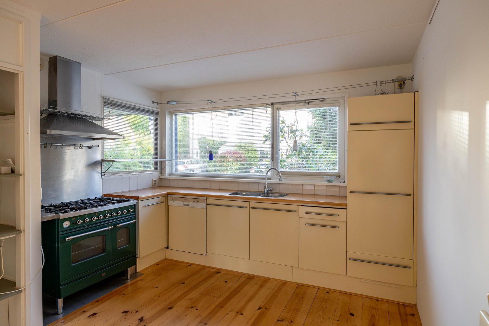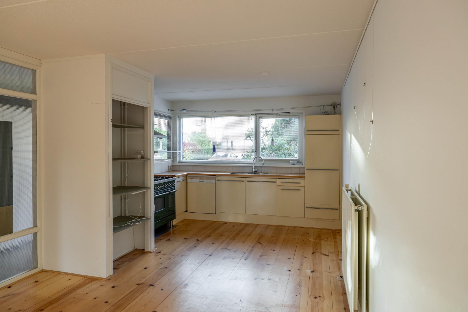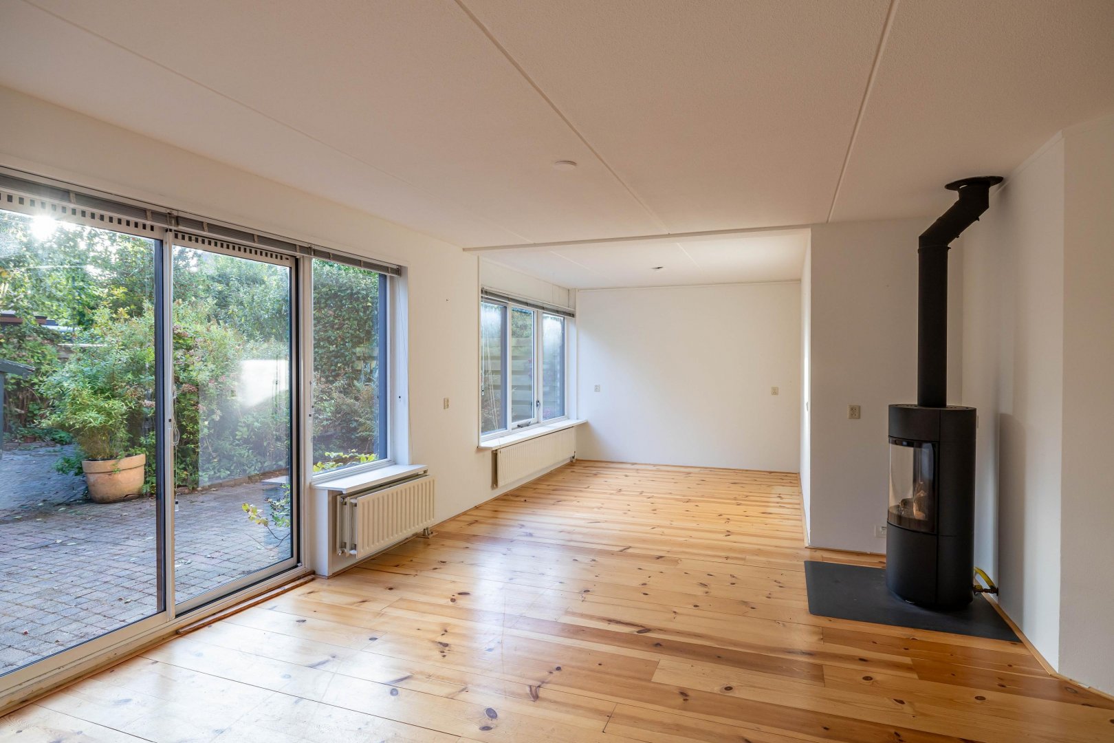 Ruime woonkamer, tuingericht in L-vorm (54m²) met aan de voorzijde van het huis de halfopen keuken. De woonkamer is voorzien van een houten planenvloer en schuifpui naar de tuin.