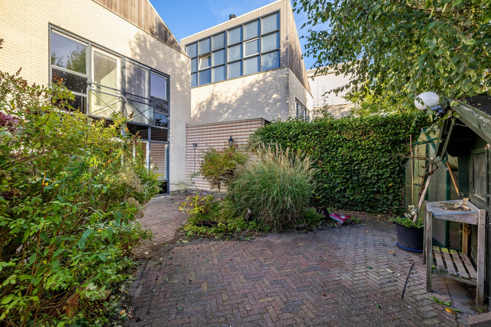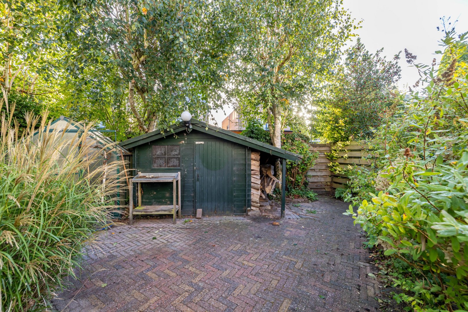 - ruime weelderig groene achtertuin met houten schuurtje en achterom;