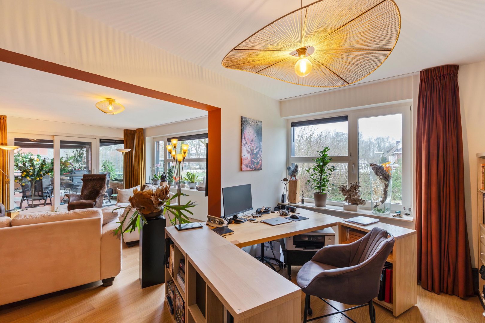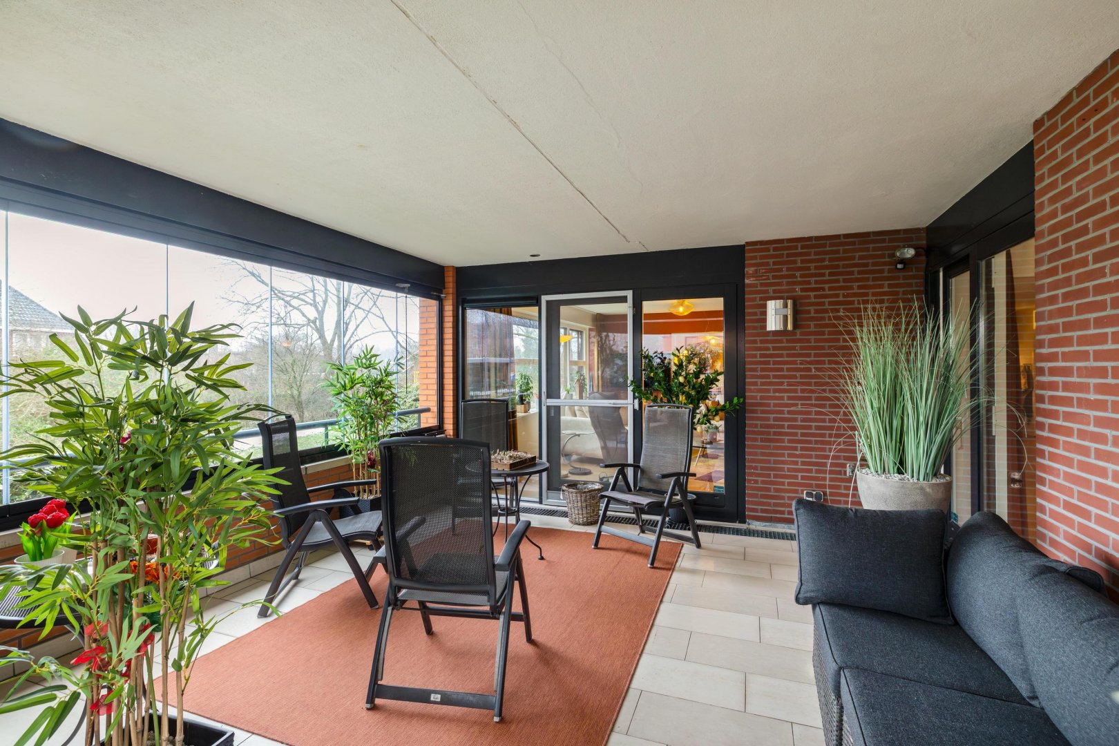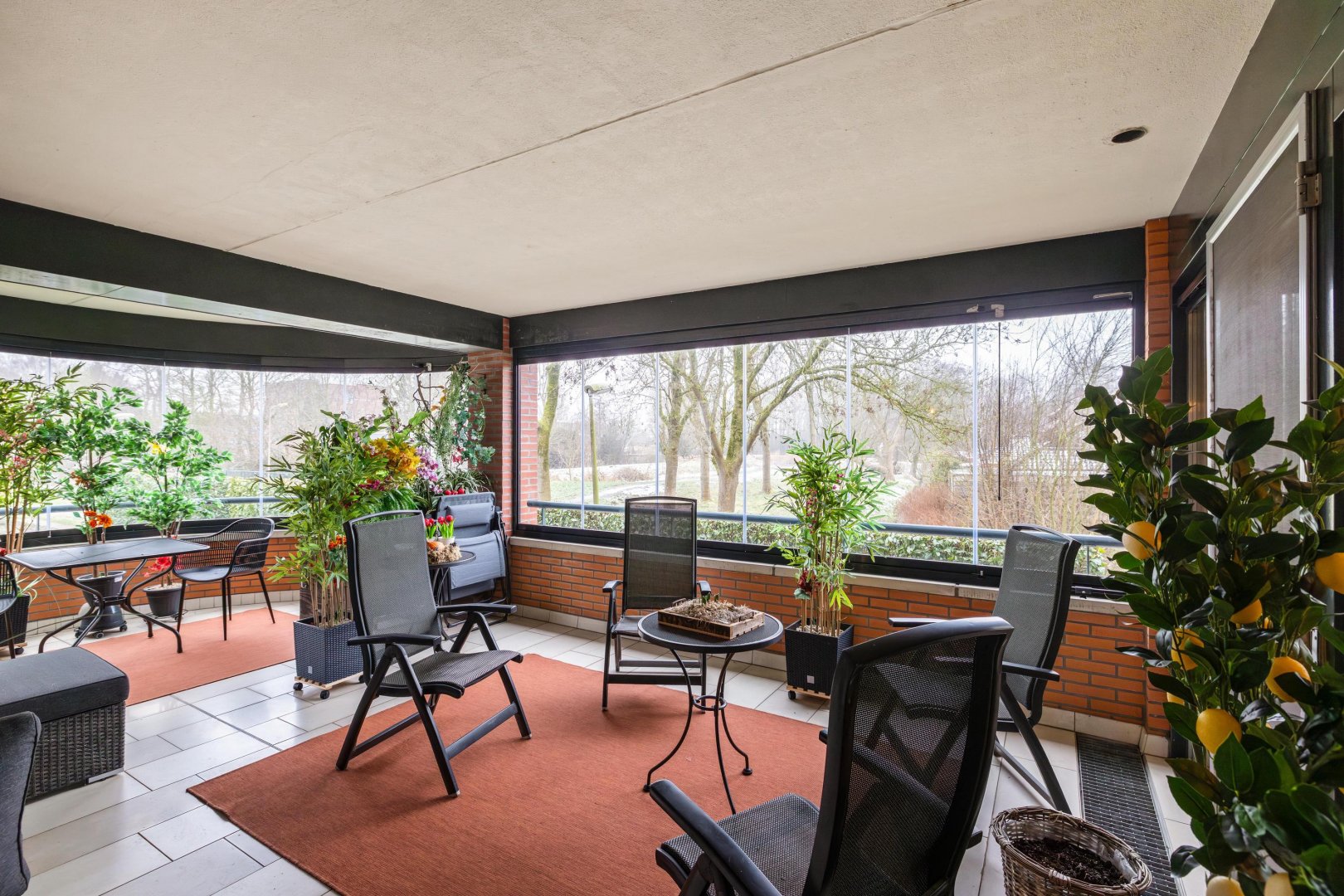 Het royale terras - serre (29 m2) is voorzien van glazen wanden die in het geheel open kunnen bij zonnige dagen. Het terras is gesitueerd op het zuidwesten en is bereikbaar via twee schuifpuien vanuit de woonkamer en de multifunctionele kamer.