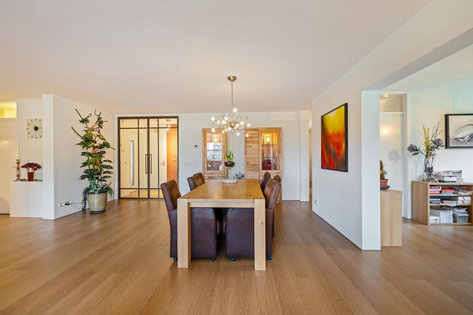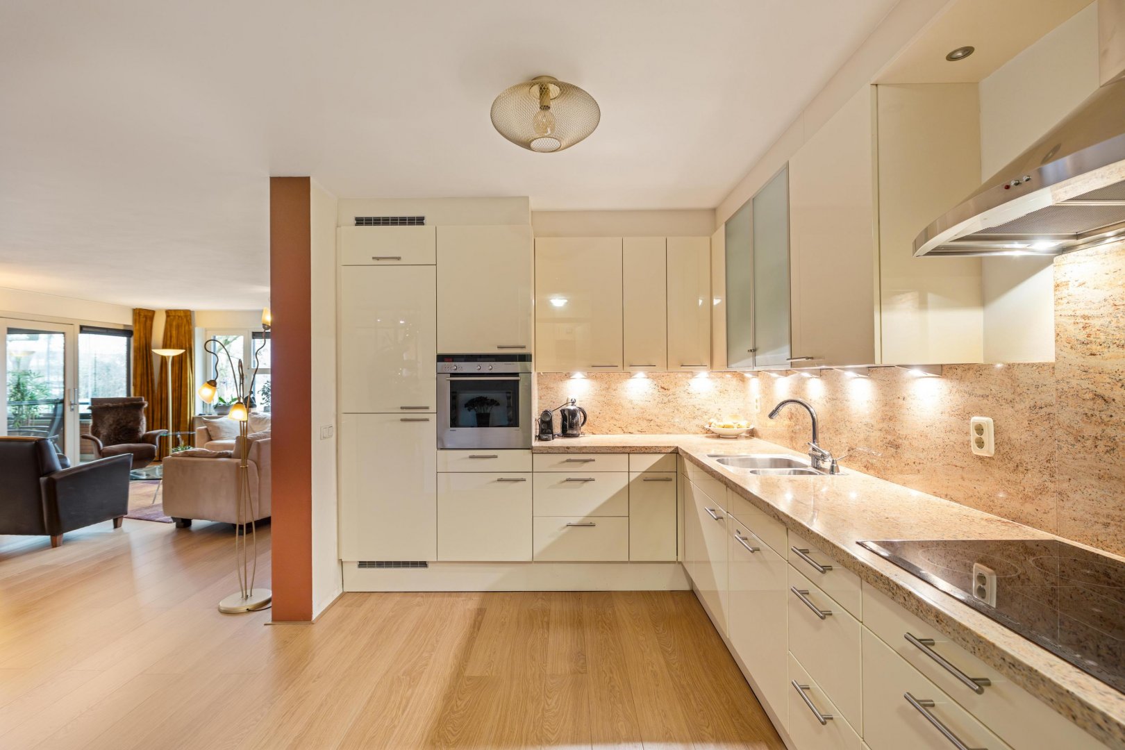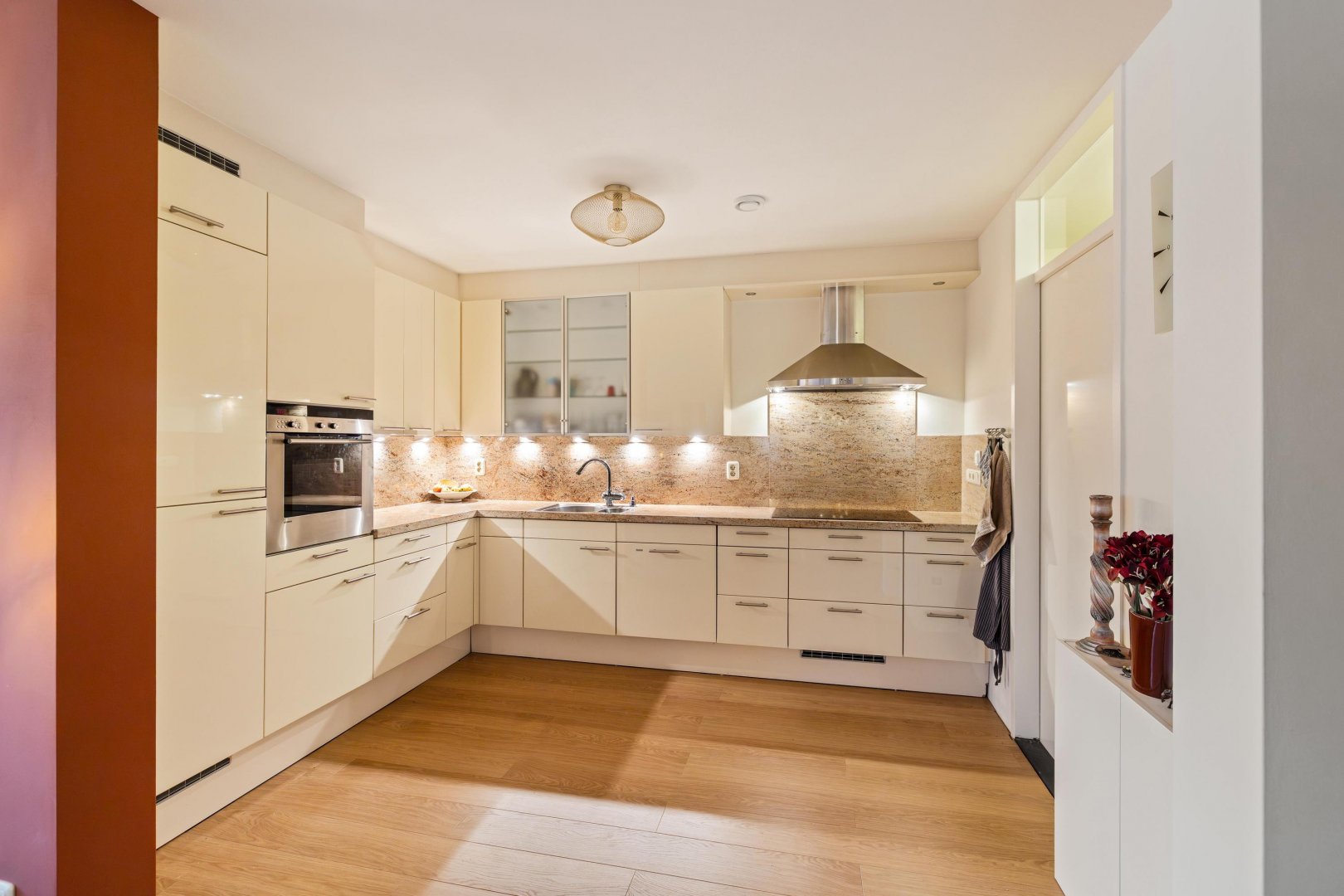 Entree met toilet en garderobenis. Zeer ruime woonkamer met veel lichtinval en toegang tot het terras. De semi-open Siematic keuken is voorzien van inbouwapparatuur, waaronder een koelkast, vaatwasser, inductiekookplaat, combi-oven en afzuigkap. De woonkamer – keuken zijn gezamenlijk 65 m2. Aangrenzend bevindt zich de bijkeuken met extra werkblad en aansluitingen voor wasmachine, droger en de CV-combiketel.