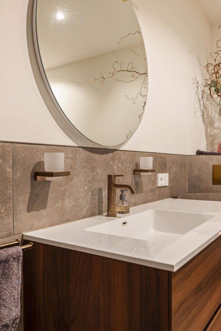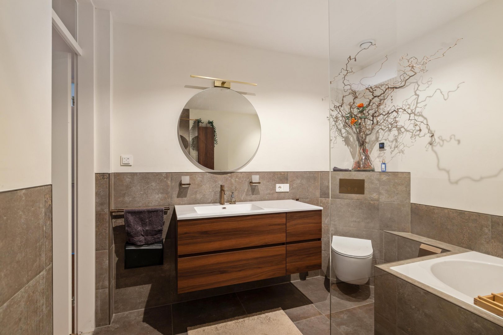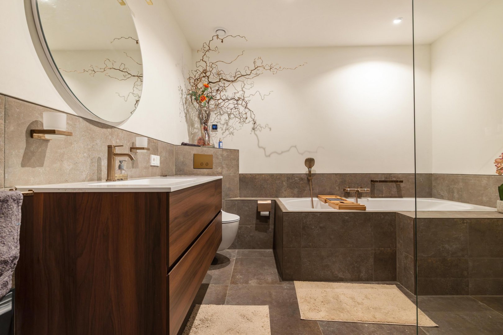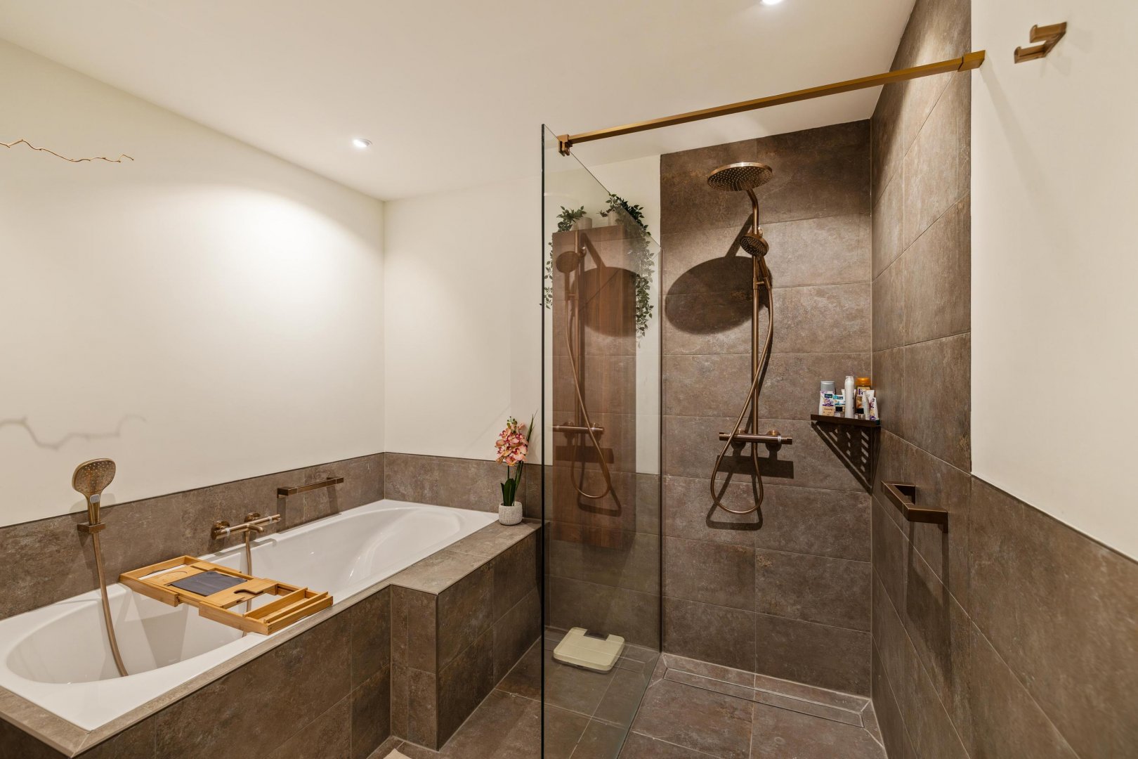 De luxe, volledig vernieuwde badkamer is uitgerust met een ligbad, inloopdouche, toilet en wastafelmeubel. Daarnaast is er een extra berging met praktische bergruimte.
