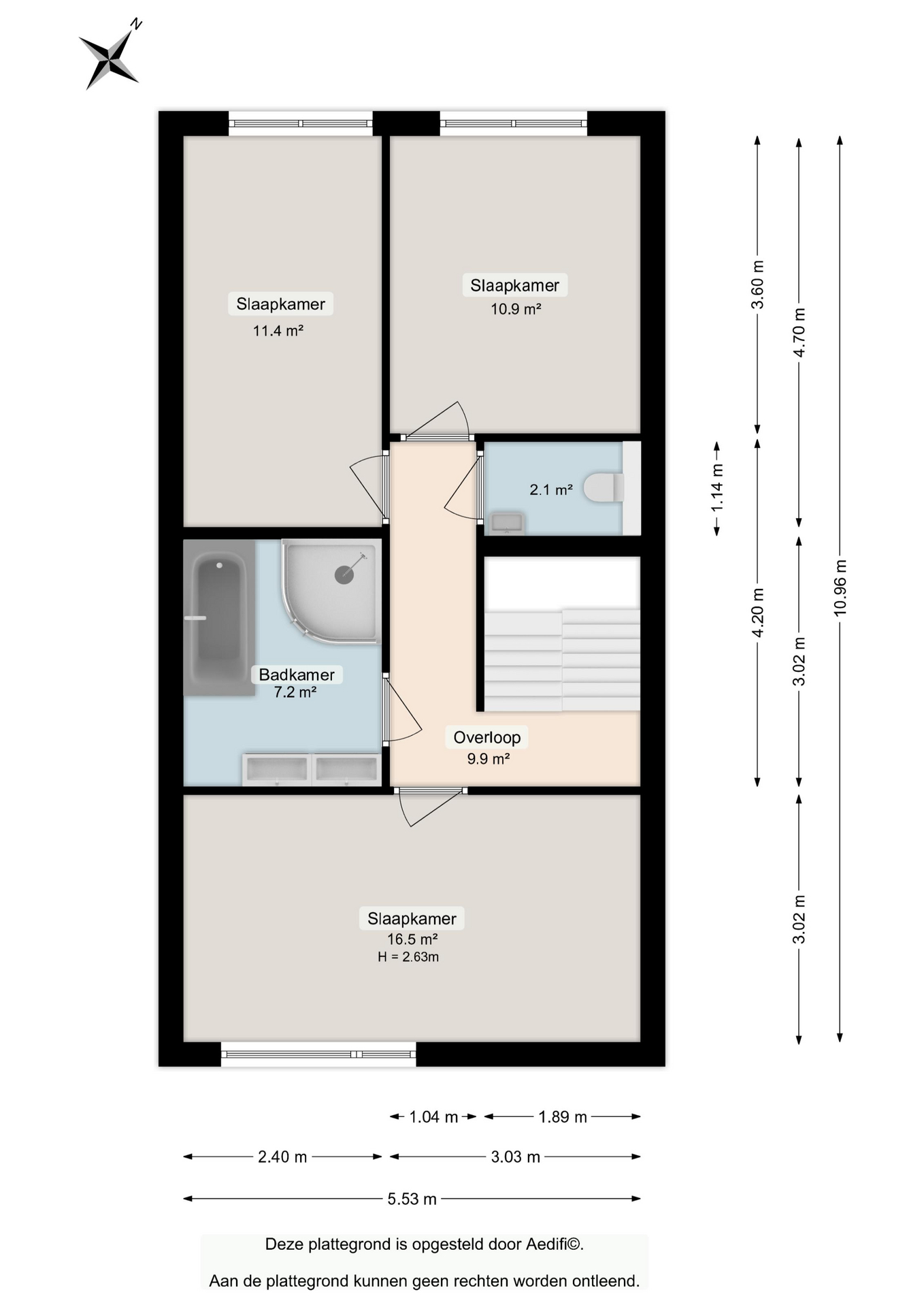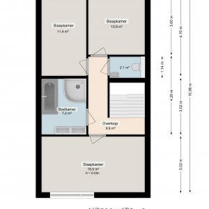 Vanaf de overloop zijn 3 slaapkamers van 17, 11 en 11 m2 te bereiken. Op de overloop is een apart toilet en de badkamer is luxe qua inrichting en voorzien van een whirlpool, inloop douche en dubbele wastafel.