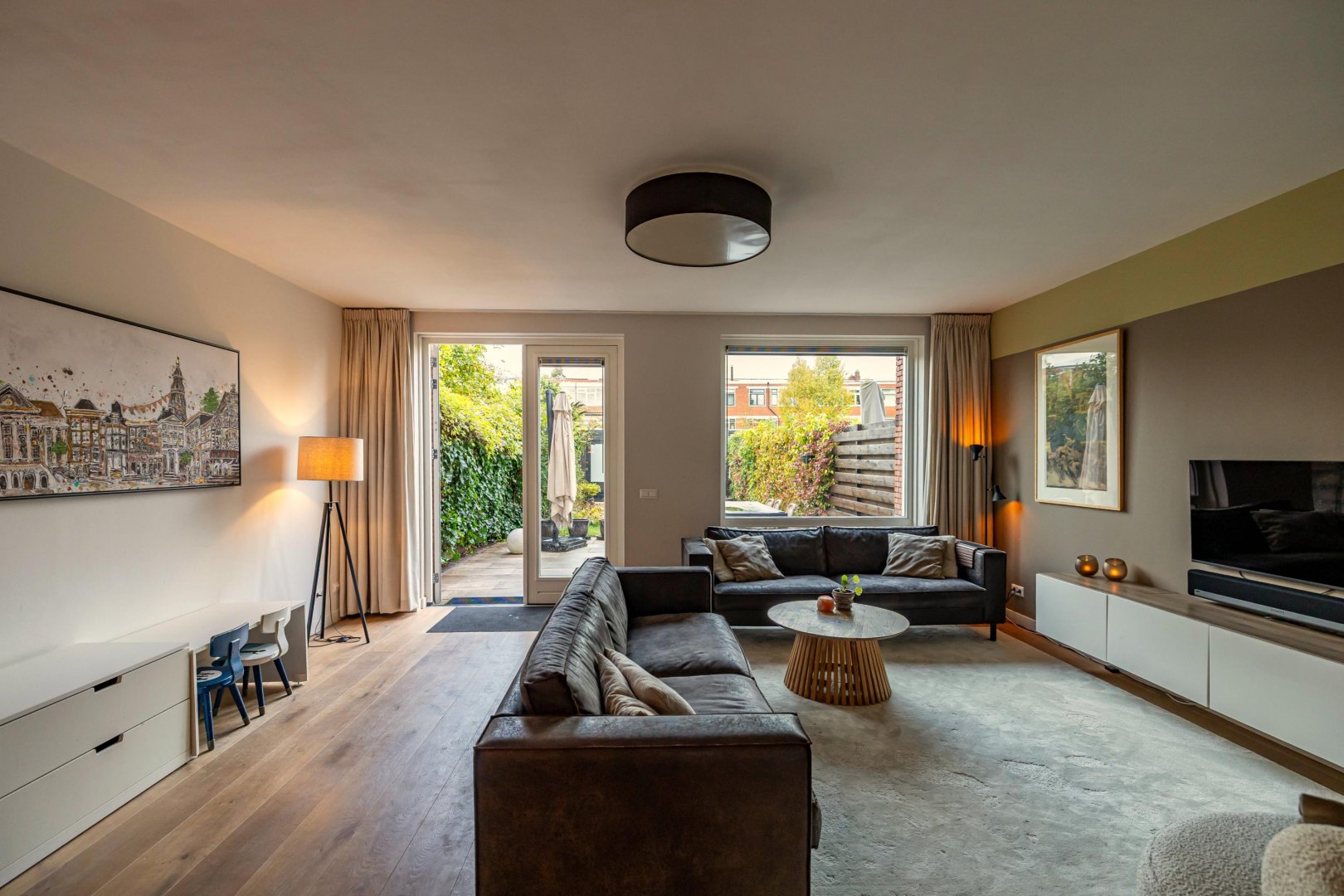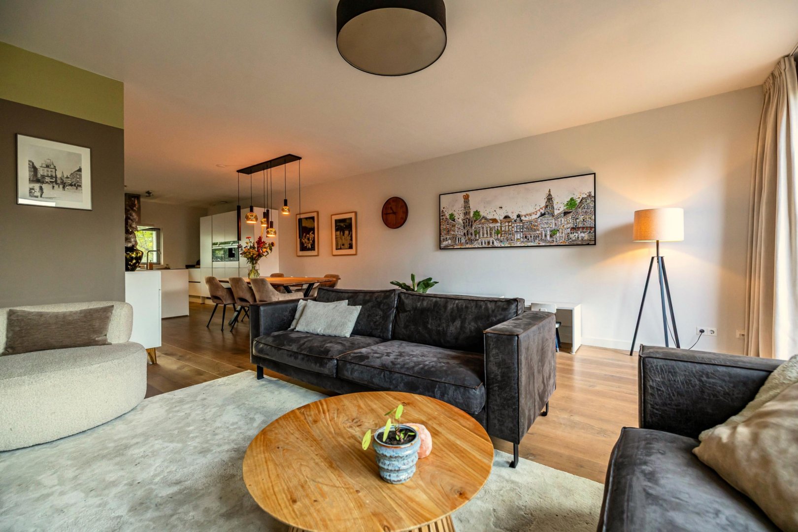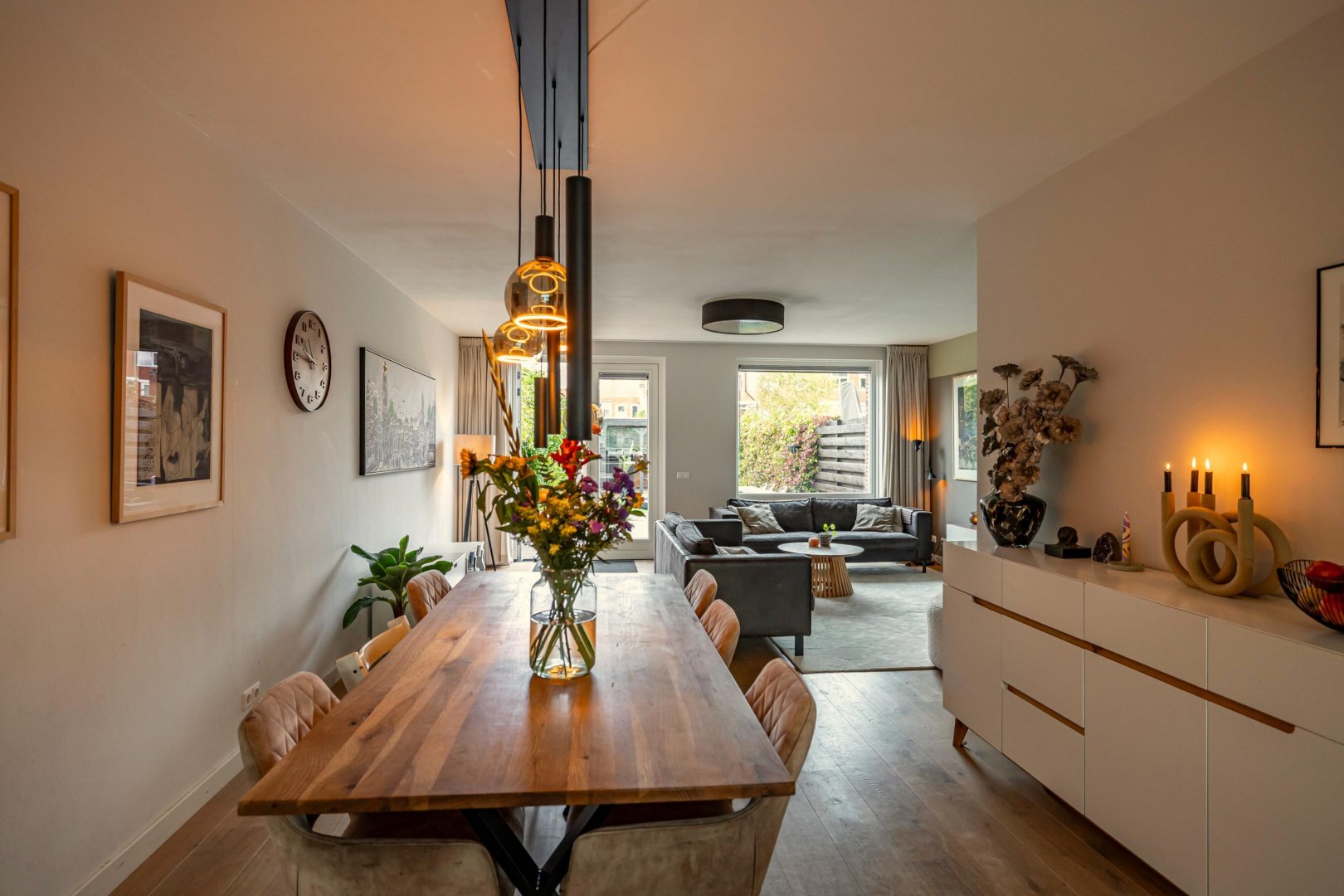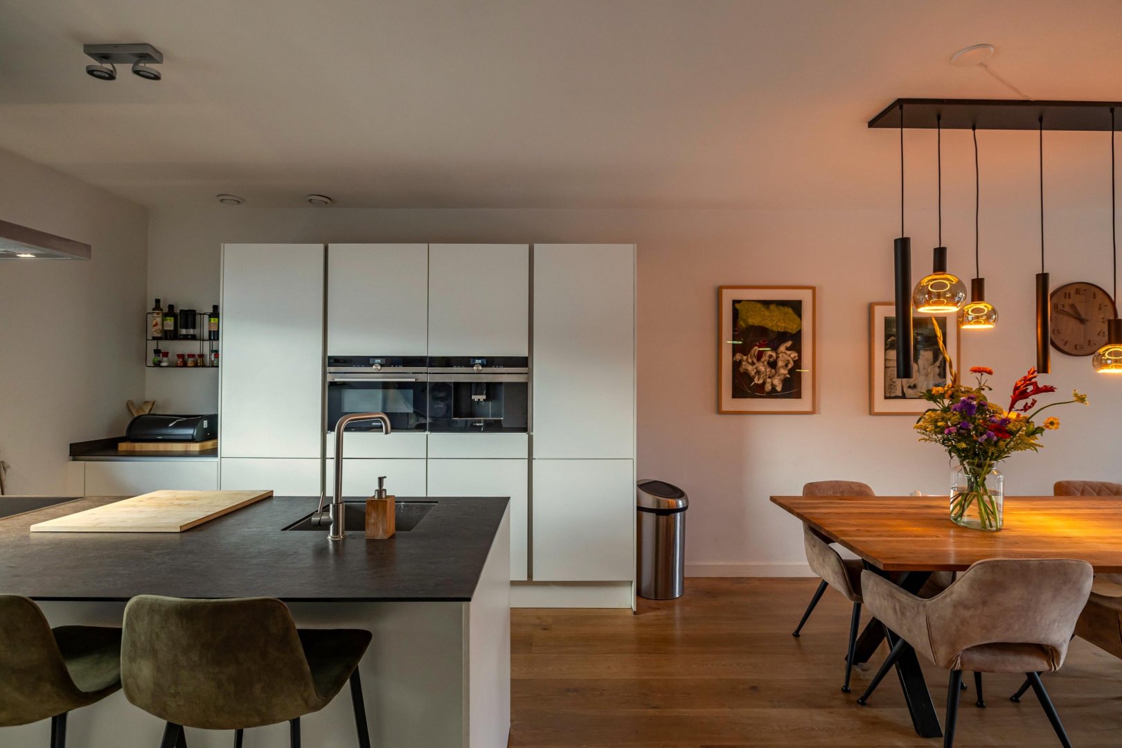 De ruime woonkamer met open keuken vormt het hart van het huis. Dit is een fijne plek om samen te komen. De moderne keuken is voorzien van hoogwaardige inbouwapparatuur en veel werkruimte, waardoor koken hier een plezier is. Grote ramen en openslaande deuren zorgen voor een natuurlijke verbinding met de diepe tuin, die gunstig op de zon ligt.