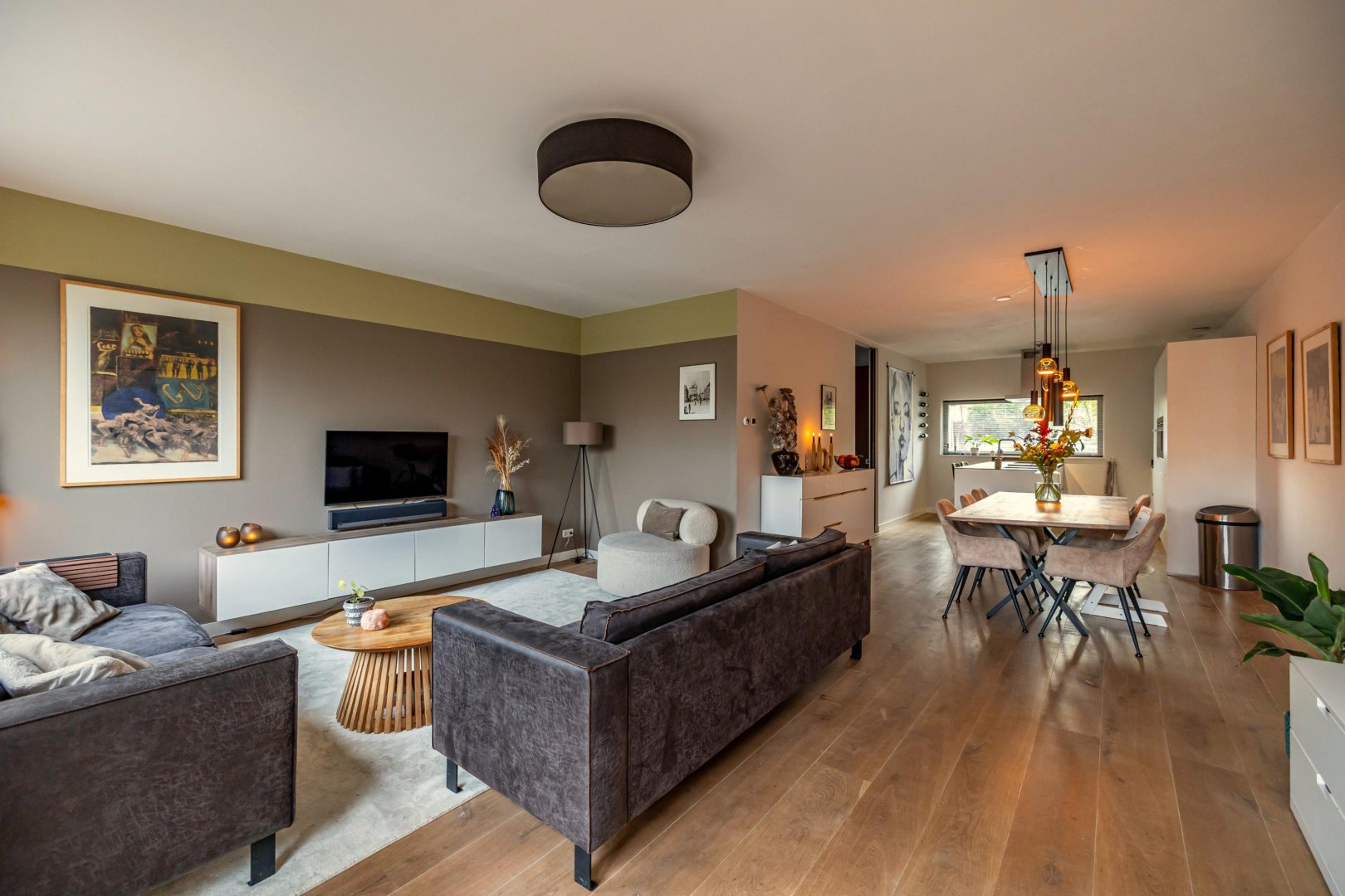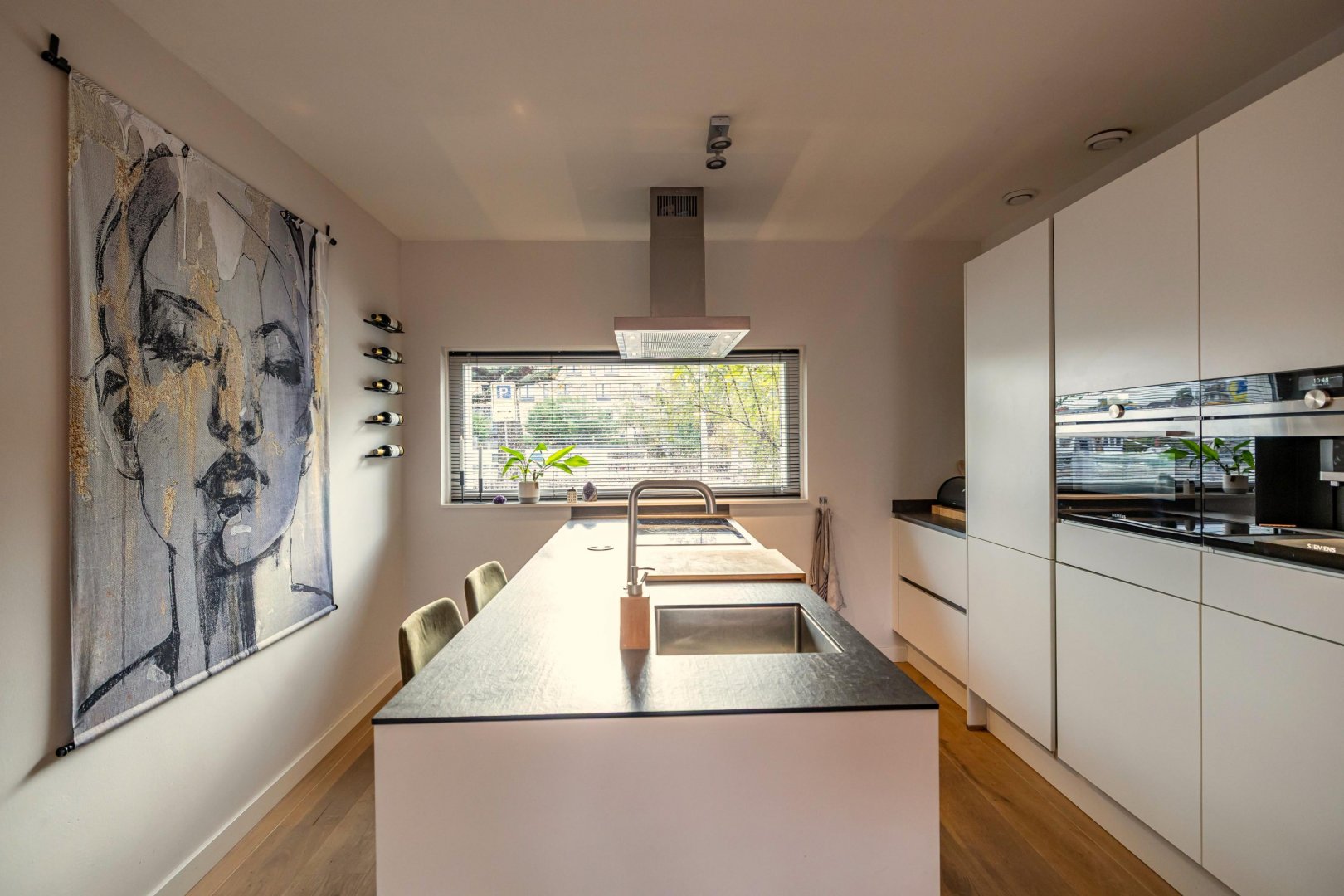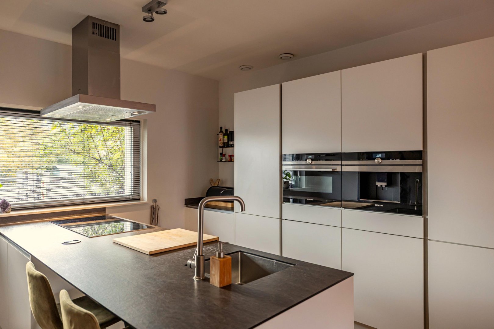 De ruime woonkamer met open keuken vormt het hart van het huis. Dit is een fijne plek om samen te komen. De moderne keuken is voorzien van hoogwaardige inbouwapparatuur en veel werkruimte, waardoor koken hier een plezier is. Grote ramen en openslaande deuren zorgen voor een natuurlijke verbinding met de diepe tuin, die gunstig op de zon ligt.