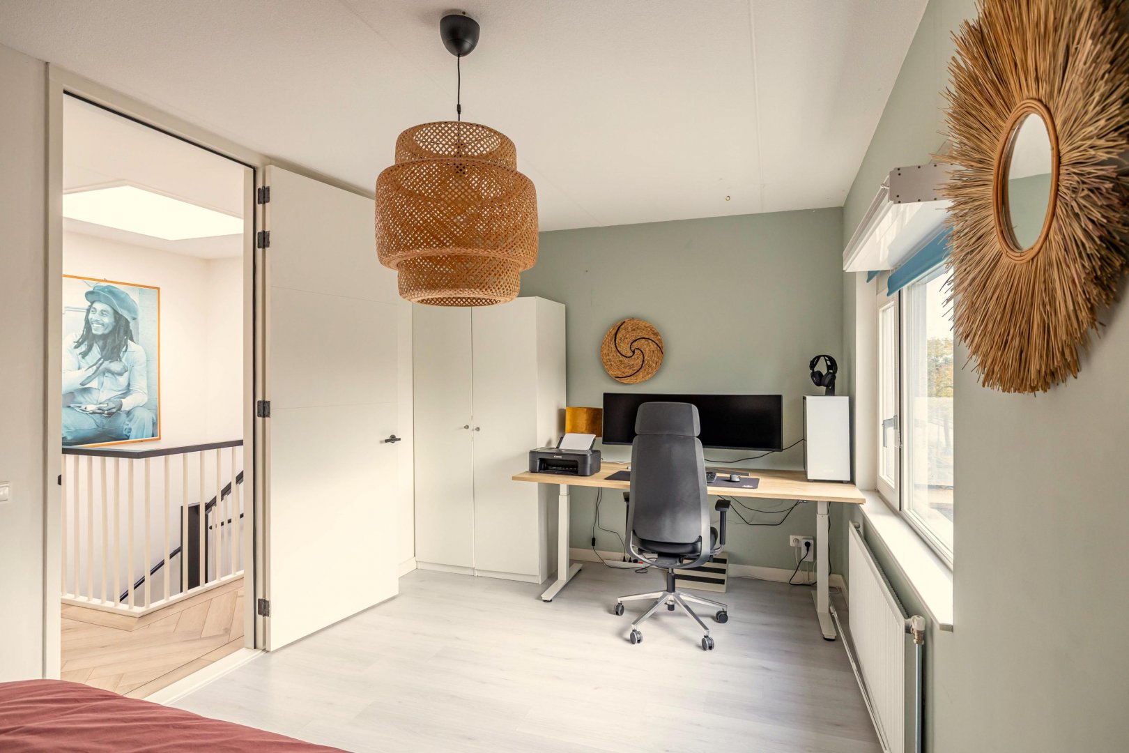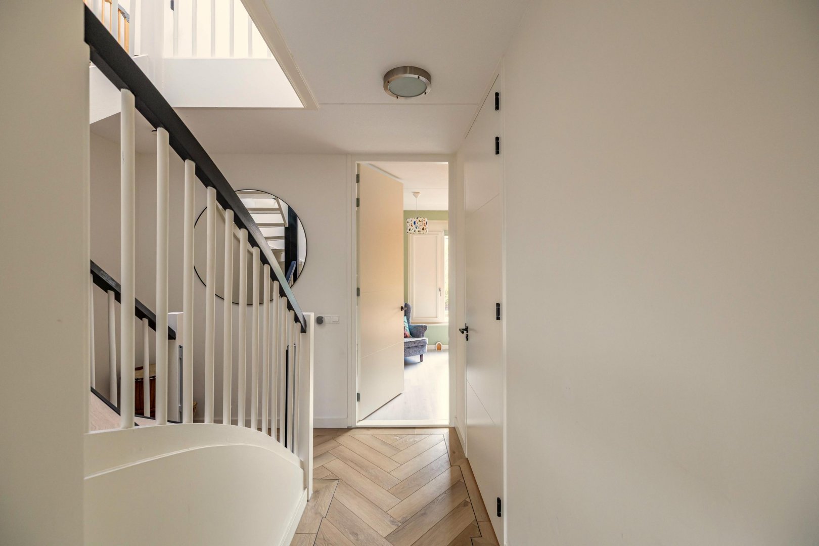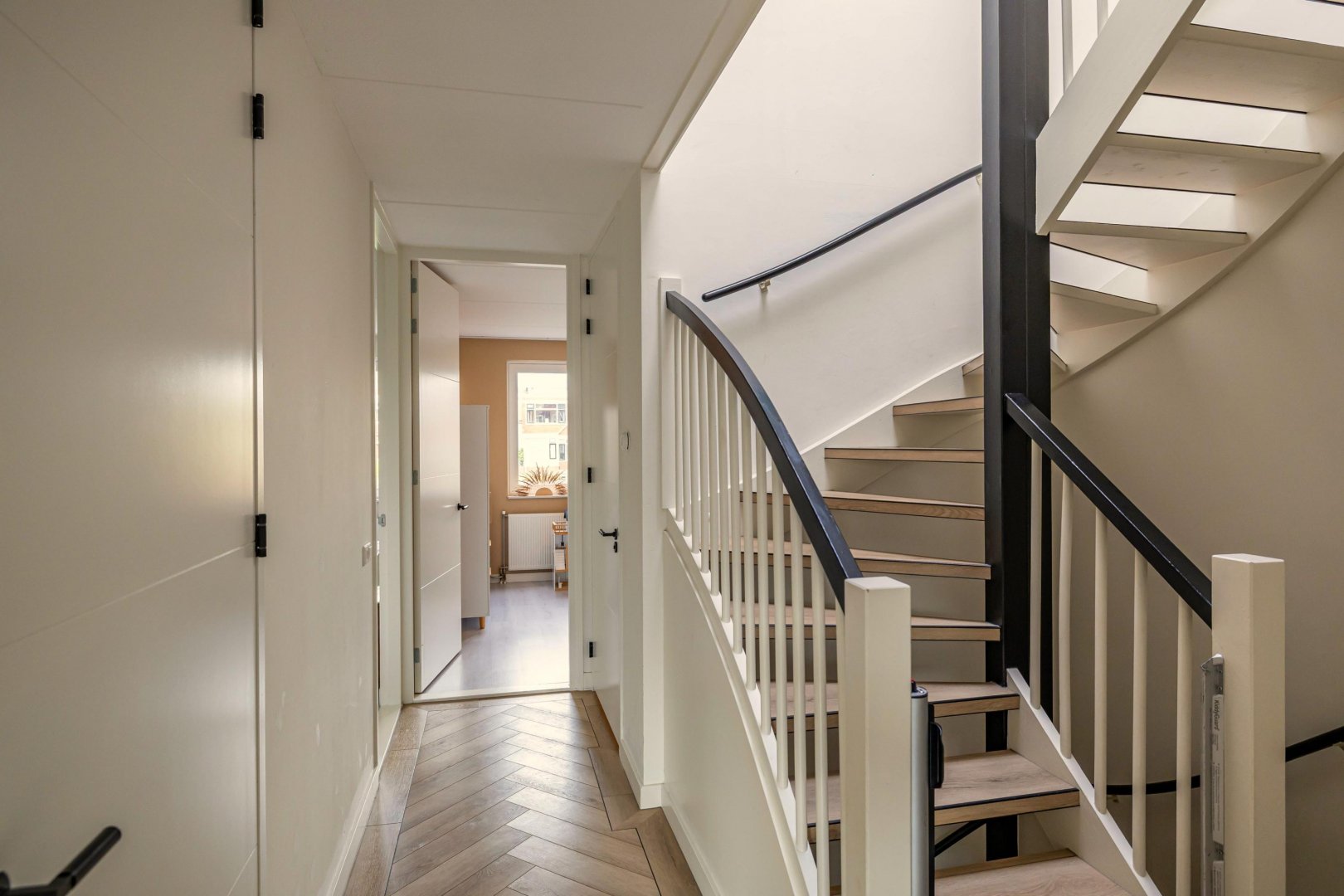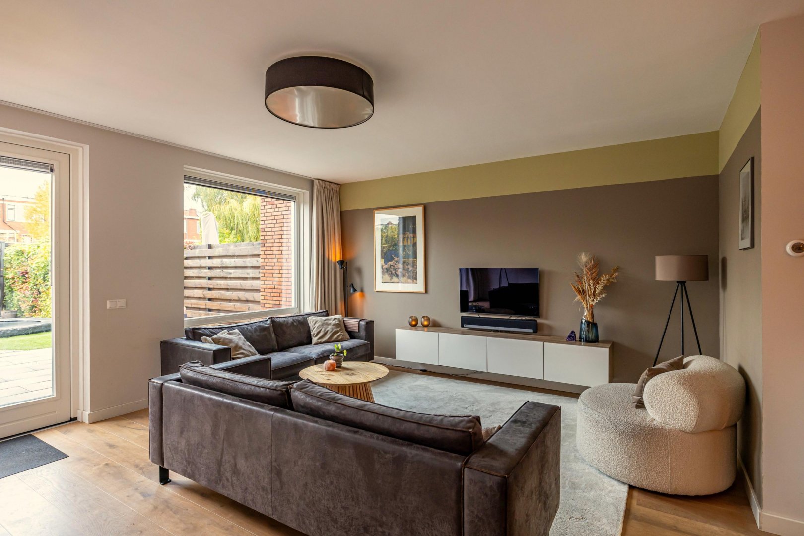 De ruime woonkamer met open keuken vormt het hart van het huis. Dit is een fijne plek om samen te komen. De moderne keuken is voorzien van hoogwaardige inbouwapparatuur en veel werkruimte, waardoor koken hier een plezier is. Grote ramen en openslaande deuren zorgen voor een natuurlijke verbinding met de diepe tuin, die gunstig op de zon ligt.