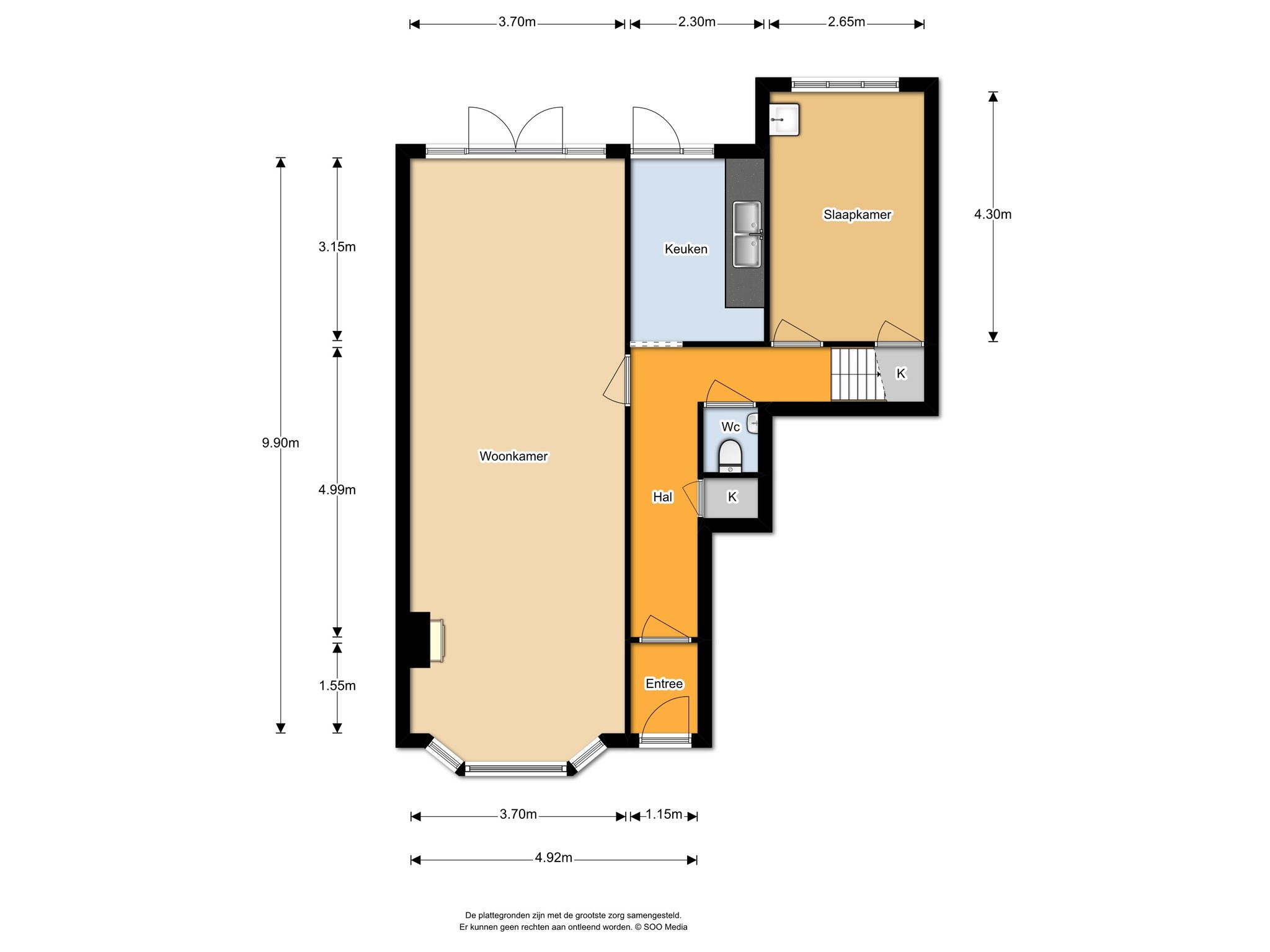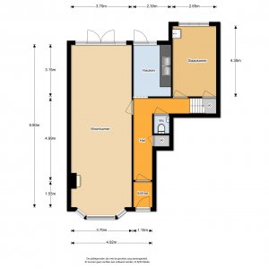 De entree aan de voorzijde is voorzien van een vestibule met daarachter een L-vormige hal. De woonkamer loopt van voor naar achteren (bijna 40 vierkante meter groot) en verder zien we op de begane grond een dichte keuken, wc, toegang naar de kelder, een eerste slaapkamer en de opgang naar de beide vertrekken op de etages. Op de eerste etage bevindt zich de badkamer, op de tweede etage een tweede slaapkamer.