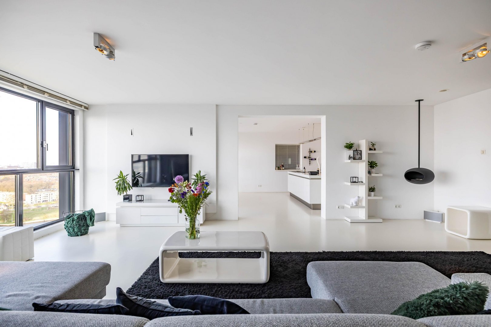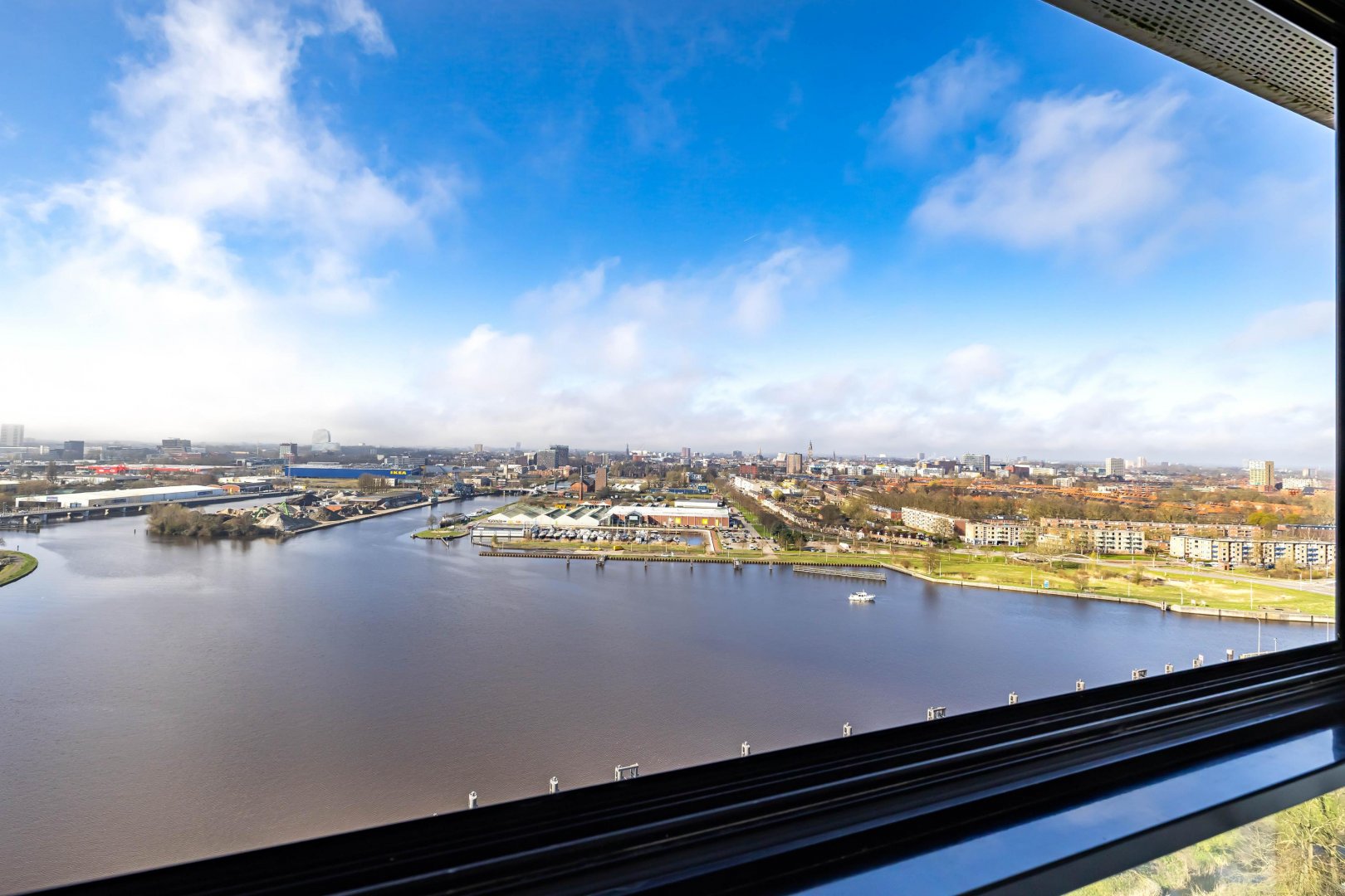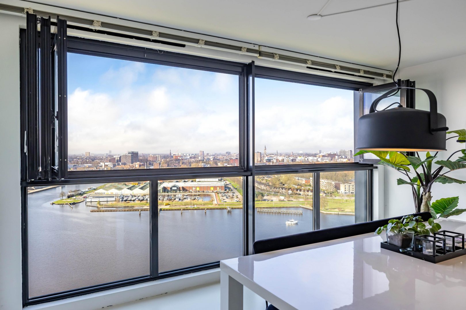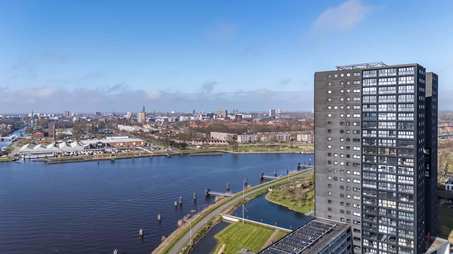 Via elegante taatsdeuren betreedt u de royale woonruimte, waar direct het indrukwekkende uitzicht over Groningen de aandacht grijpt. De woonkamer en keuken vormen samen een harmonieus geheel, badend in natuurlijk licht dankzij de grote raampartijen. Wat deze ruimte extra bijzonder maakt, zijn de harmonicaramen aan de bovenzijde, die zich openen tot een inpandig balkon—een subtiele, maar onweerstaanbare manier om buiten naar binnen te halen. Hier voelt u de frisse lucht, hoort u de stad op afstand en ervaart u een ongekende vrijheid, hoog boven het maaiveld.